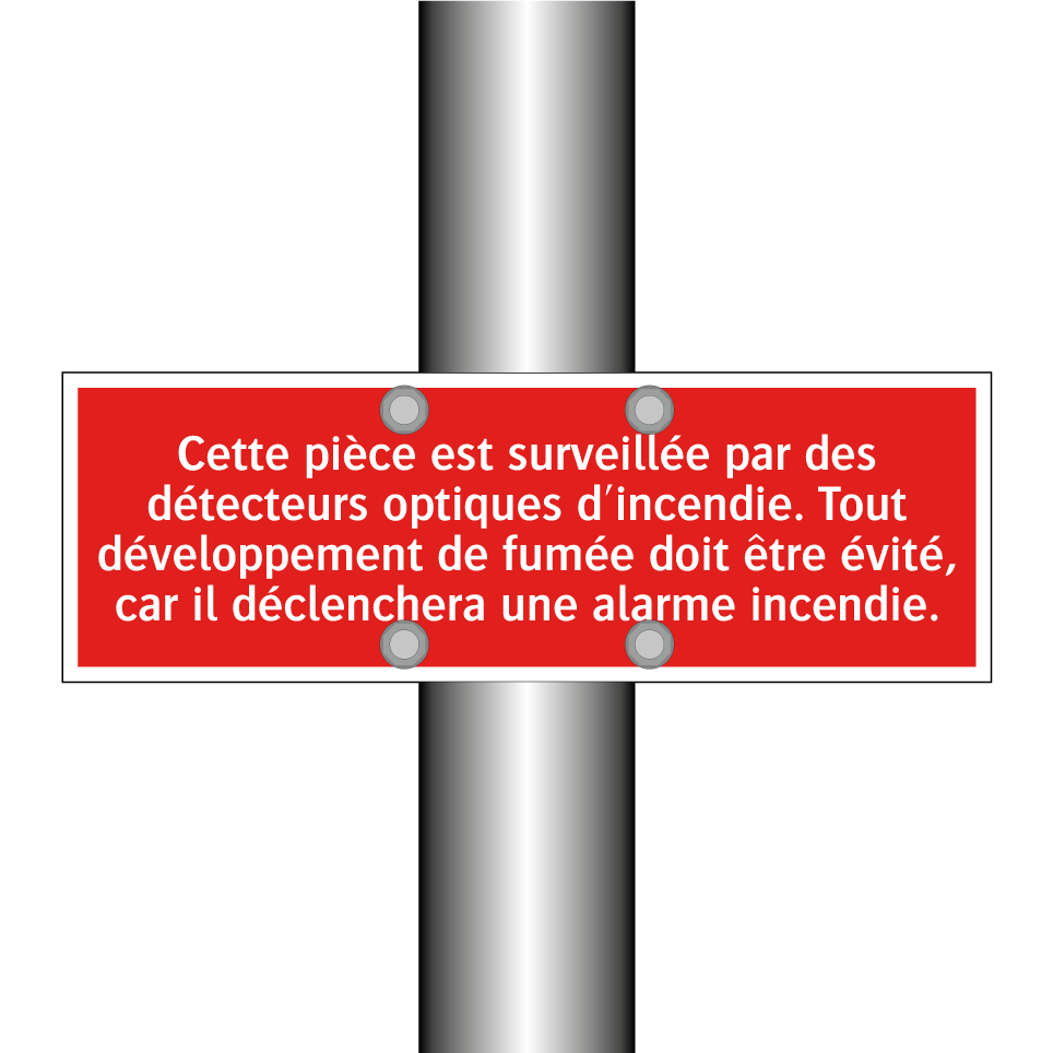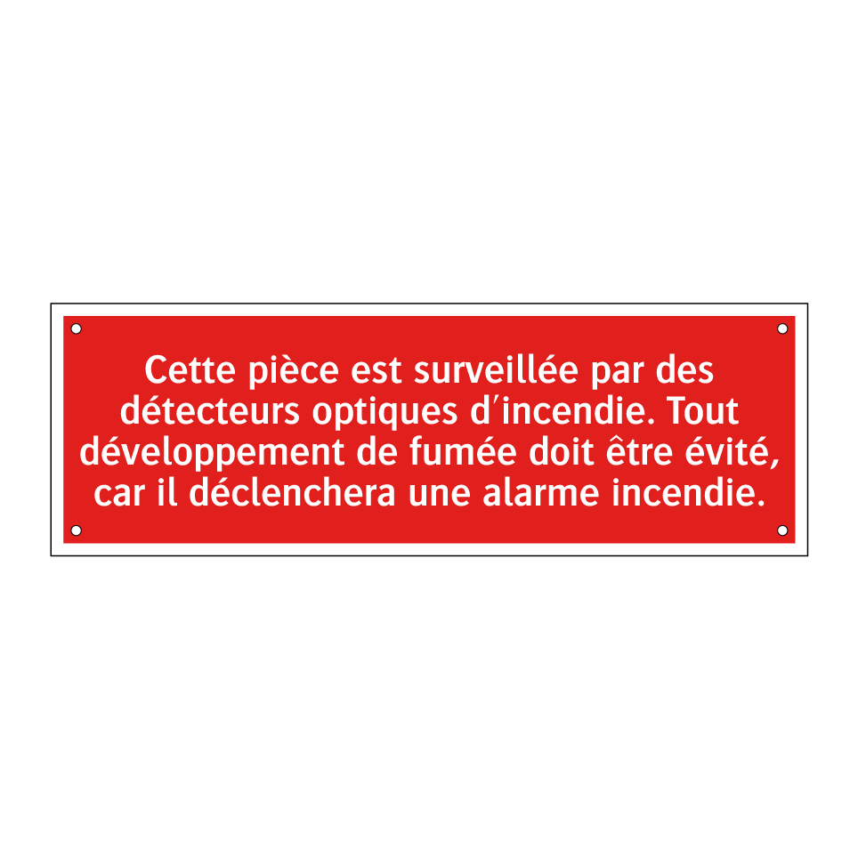 Cette enseigne de sécurité incendie est idéale pour les environnements où la surveillance par détecteurs optiques est essentielle. Elle peut être placée dans des bureaux, des entrepôts, des hôtels ou tout autre espace public nécessitant une vigilance accrue contre les incendies. Son message clair et sa couleur rouge vif attirent immédiatement l'attention, rappelant l'importance d'éviter toute production de fumée. En installant cette signalisation, vous contribuez à la sécurité de votre espace en prévenant les déclenchements d'alarmes incendie inutiles.