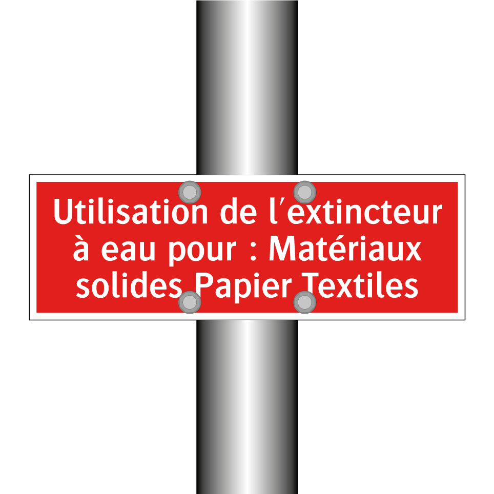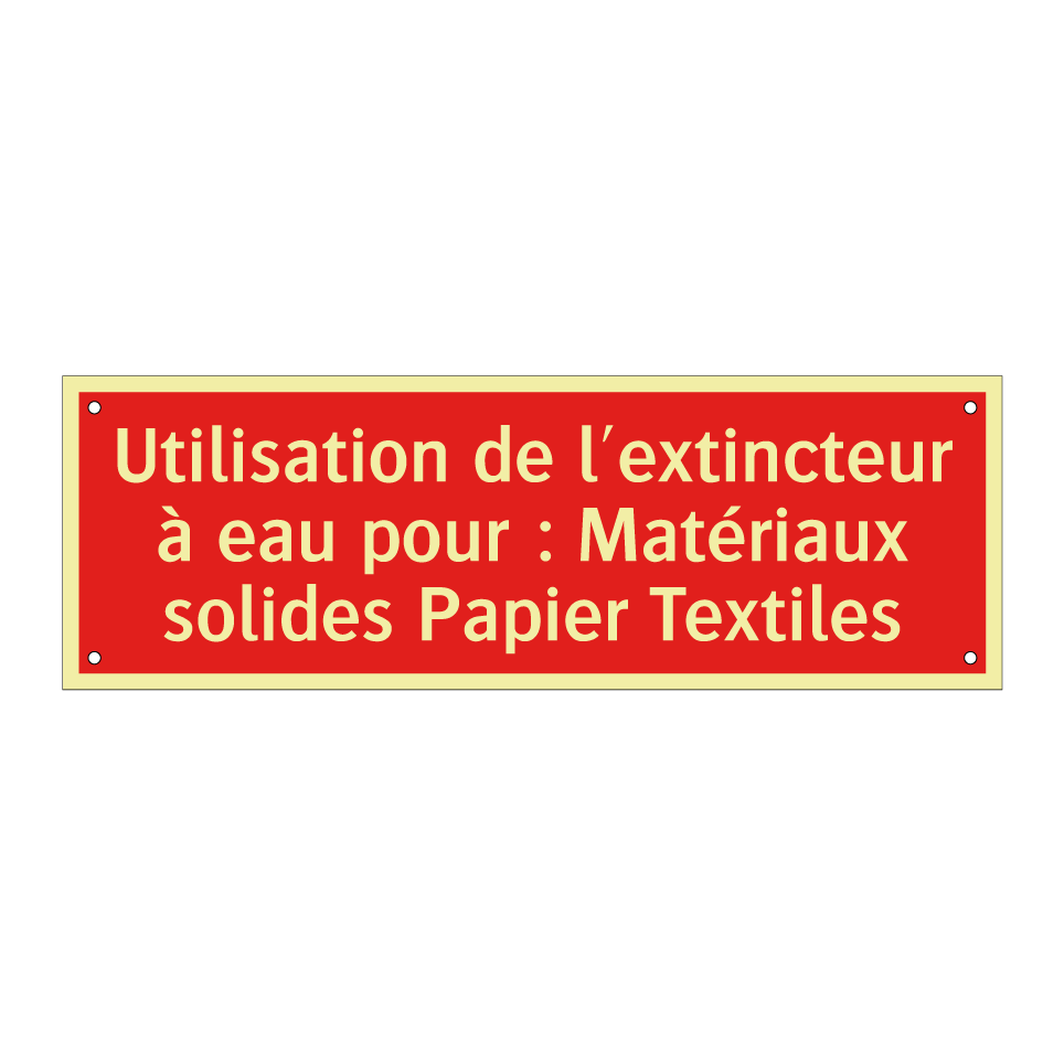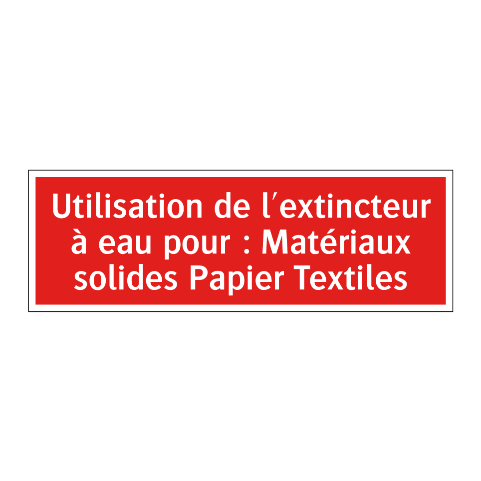 Panneau de signalisation incendie avec le texte Utilisation de l'extincteur à eau pour : Matériaux solides Papier Textiles