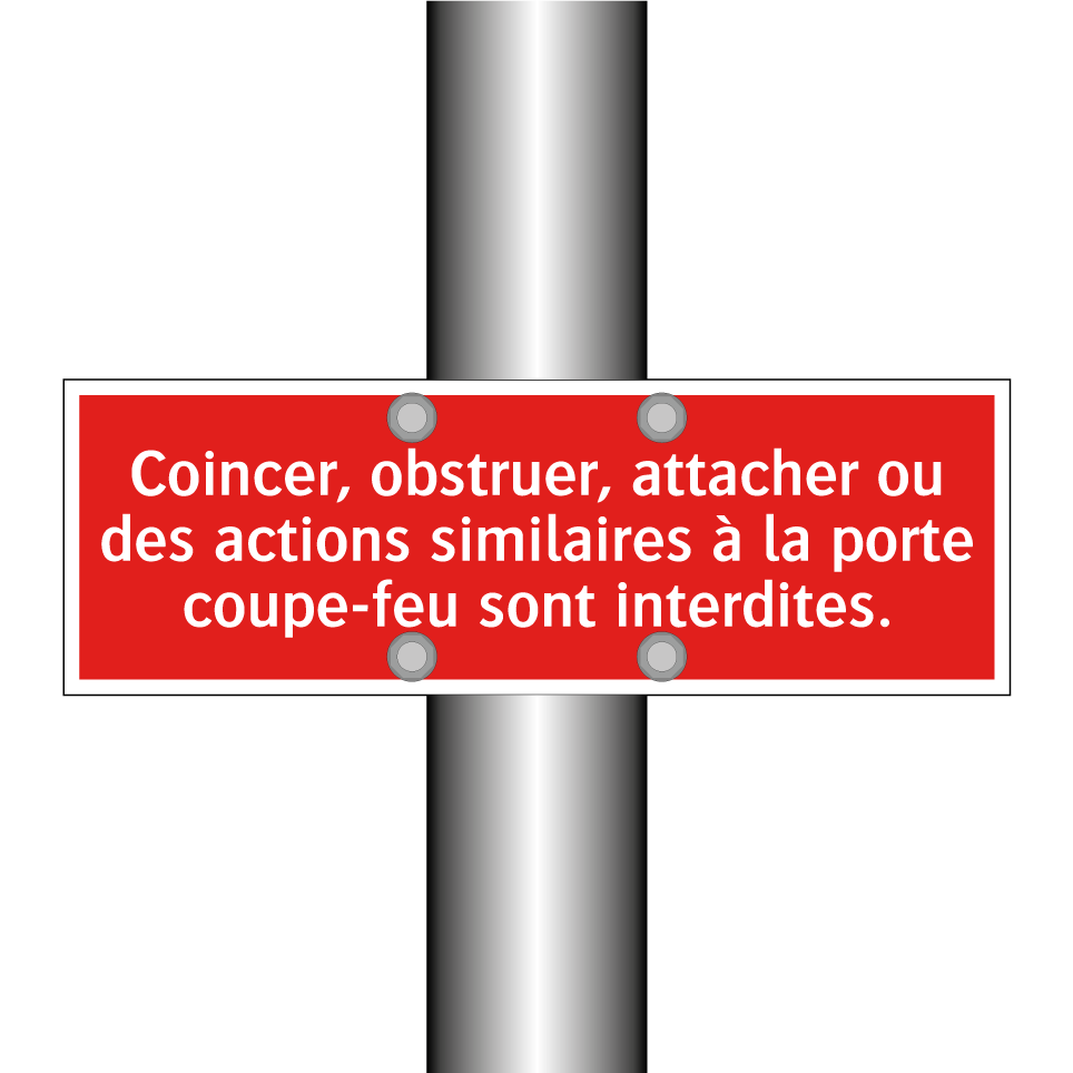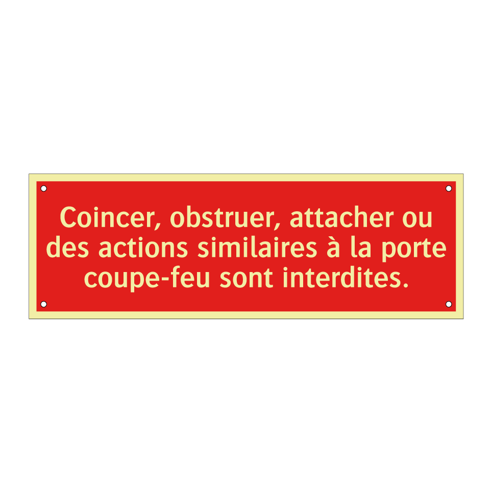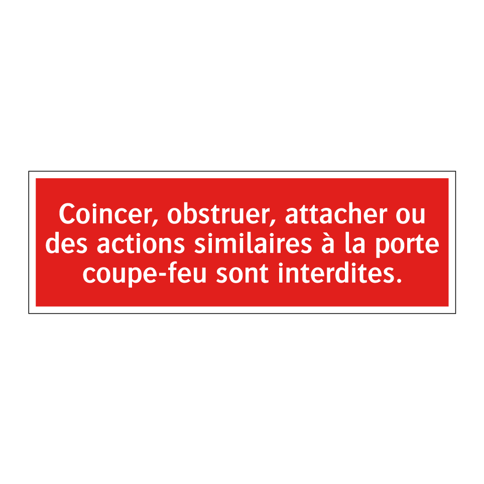 Panneau de signalisation incendie avec le texte Coincer, obstruer, attacher ou des actions similaires à la porte coupe-feu sont interdites.