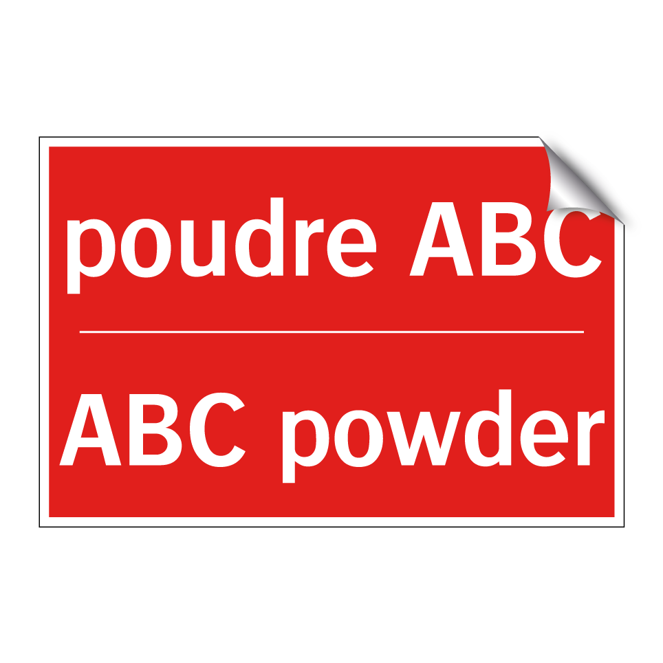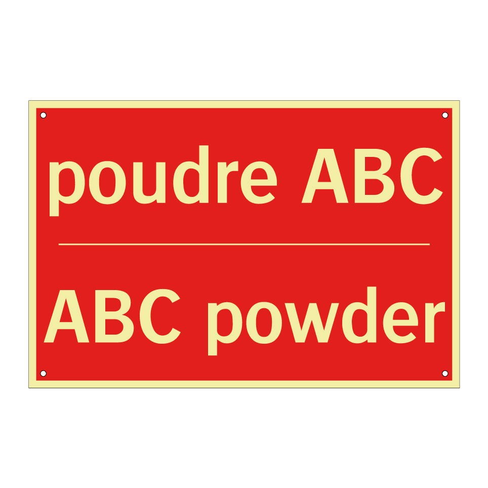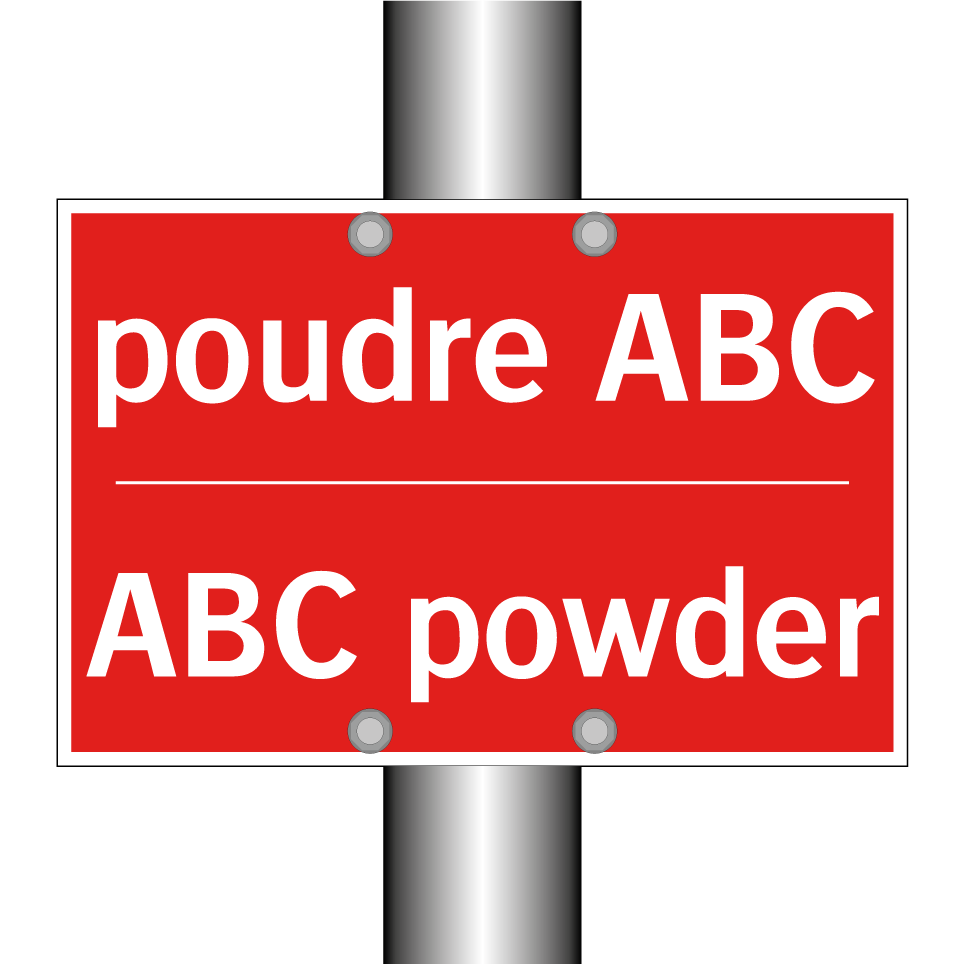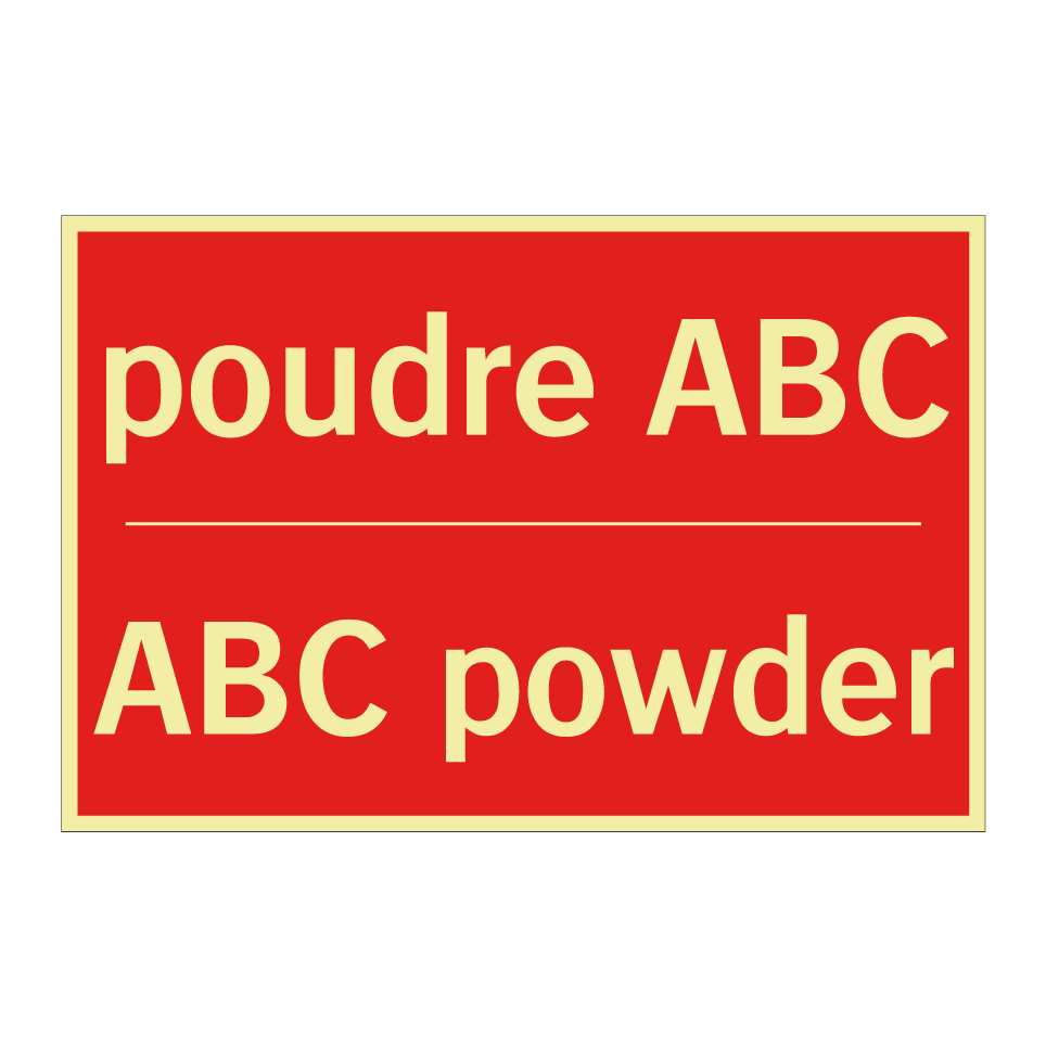 Panneau de signalisation incendie bilingue avec texte en français : "poudre ABC", et en anglais : "ABC powder"