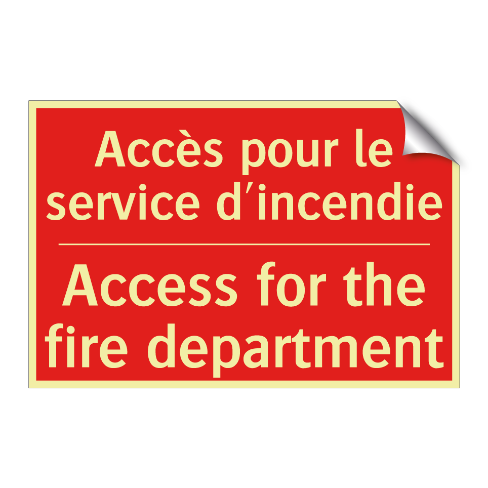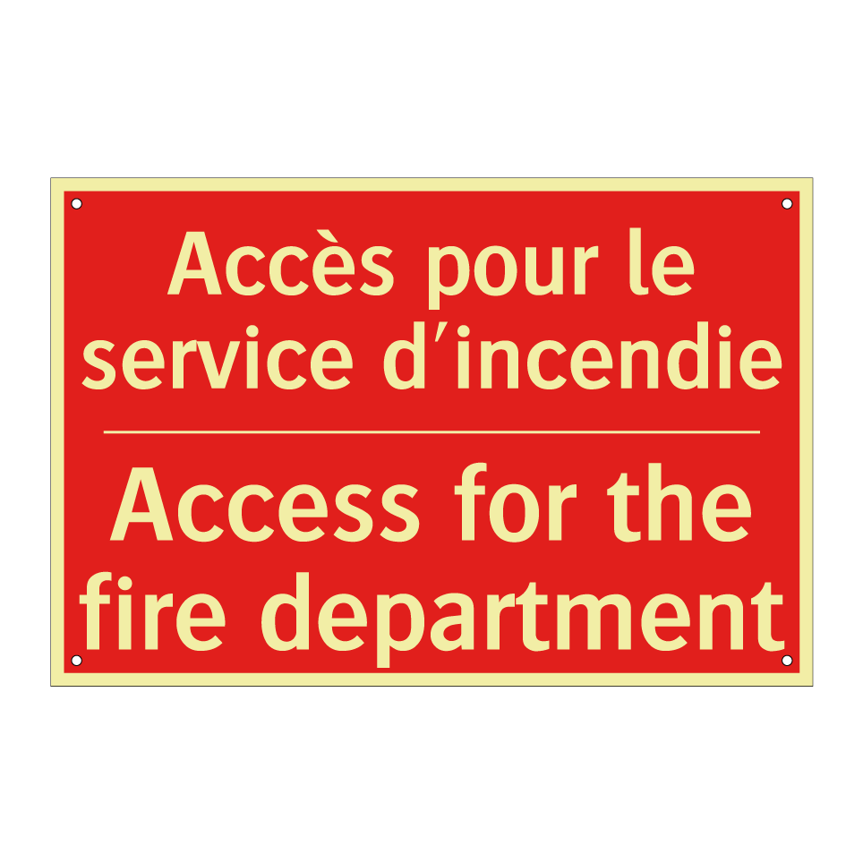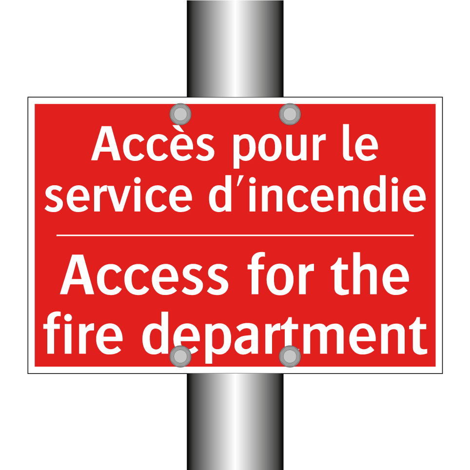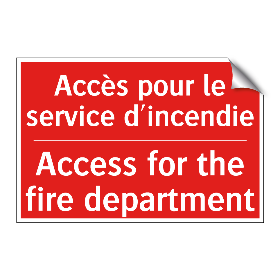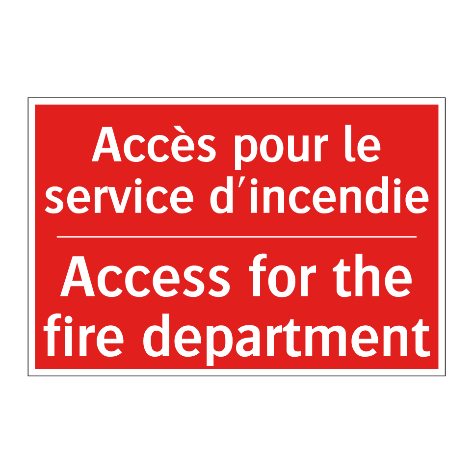 Panneau de signalisation incendie bilingue avec texte en français : "Accès pour le service d'incendie", et en anglais : "Access for the fire department"