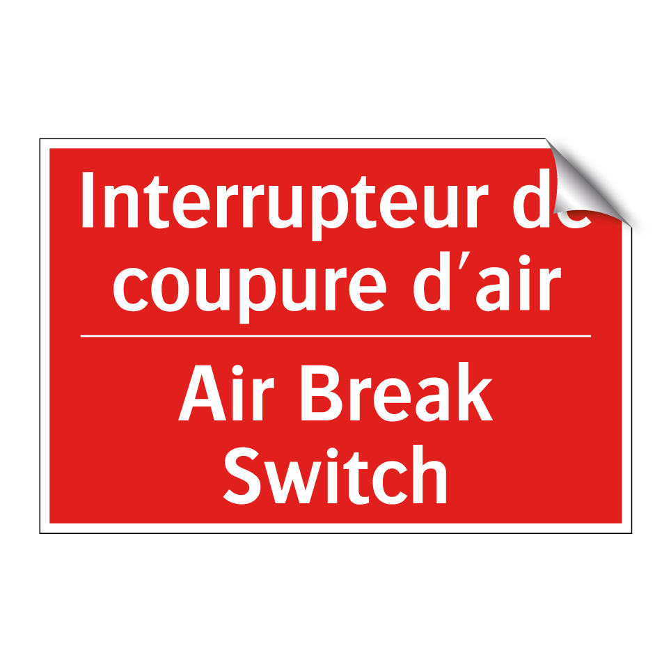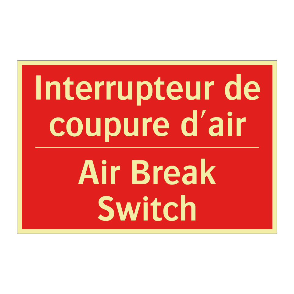 Panneau de signalisation incendie bilingue avec texte en français : "Interrupteur de coupure d'air", et en anglais : "Air Break Switch"