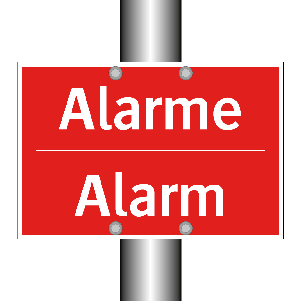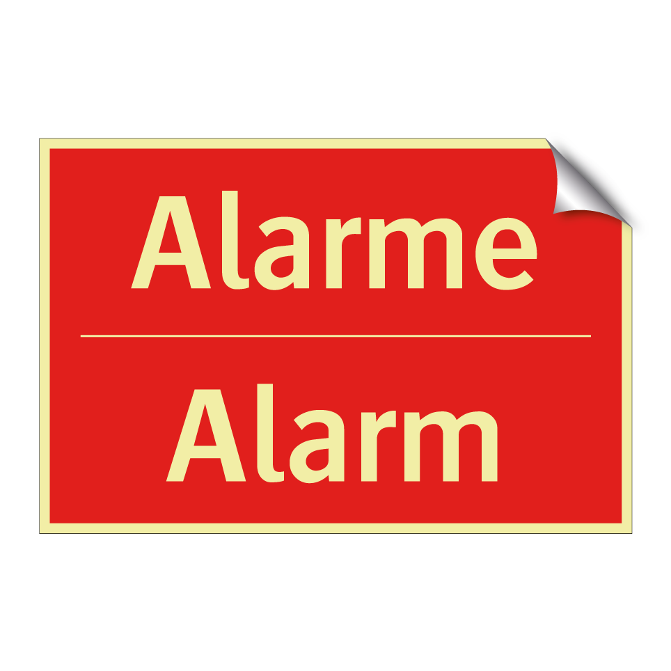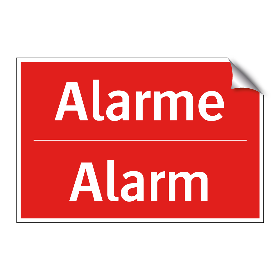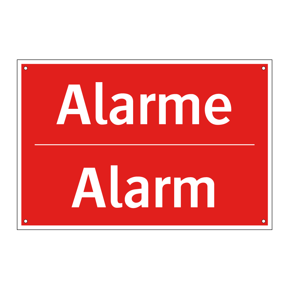 Panneau de signalisation incendie bilingue avec texte en français : "Alarme", et en anglais : "Alarm"