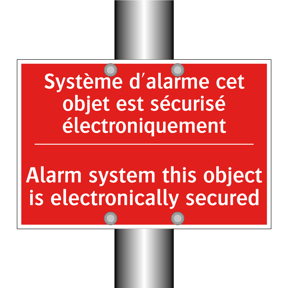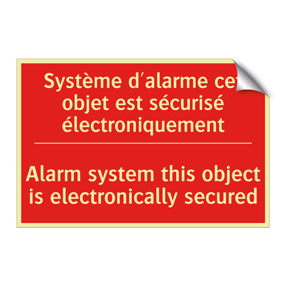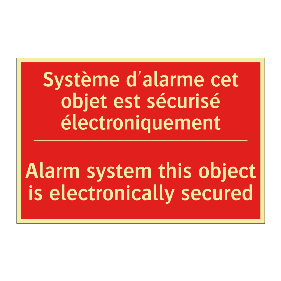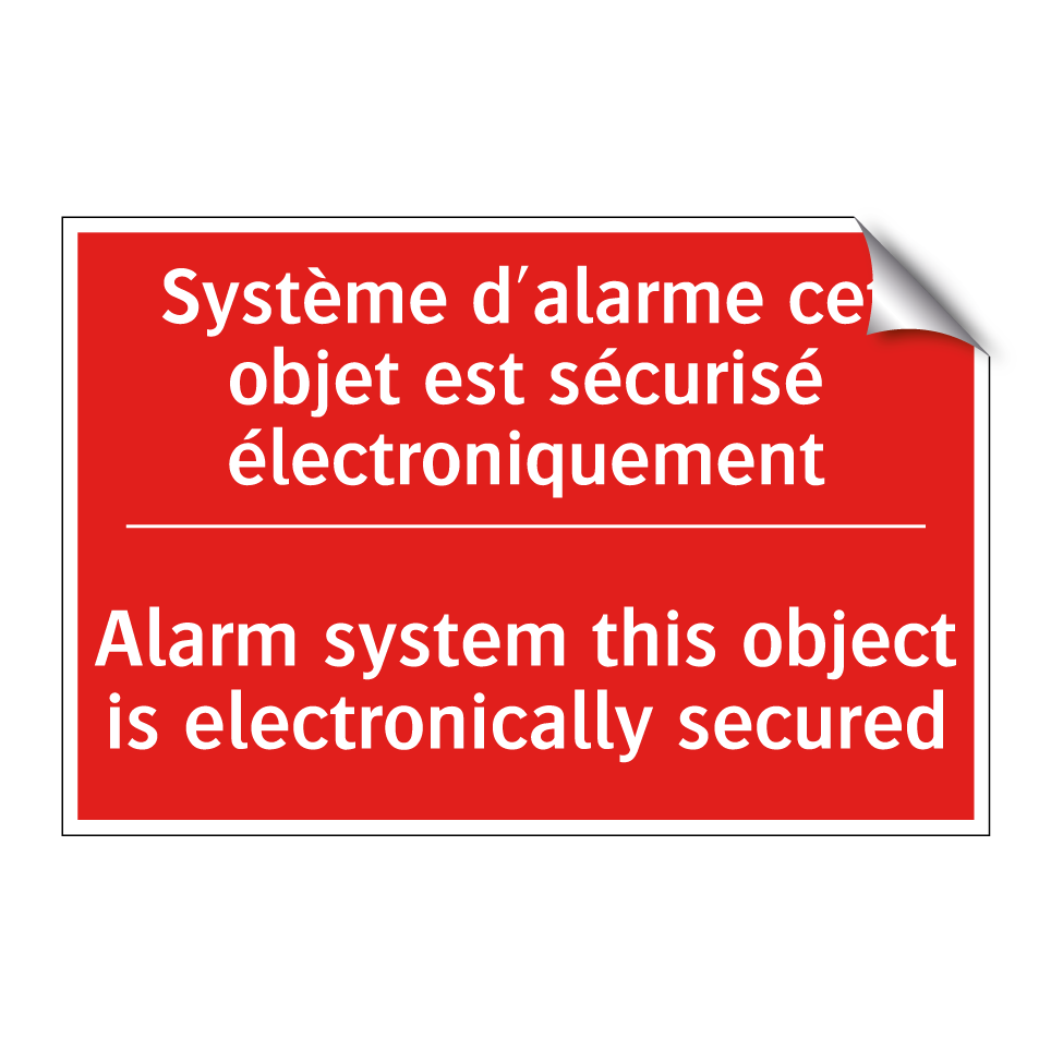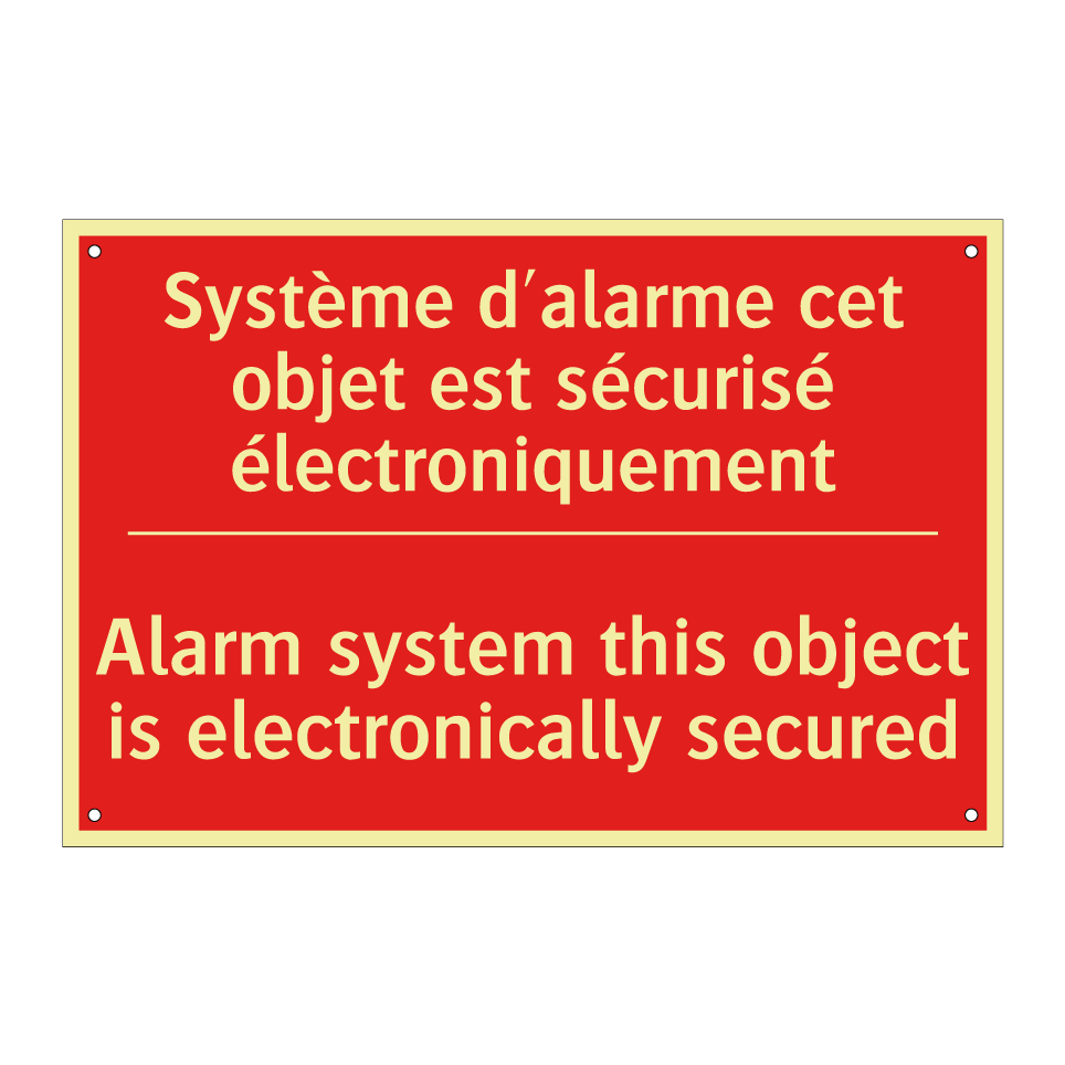 Panneau de signalisation incendie bilingue avec texte en français : "Système d'alarme cet objet est sécurisé électroniquement", et en anglais : "Alarm system this object is electronically secured"