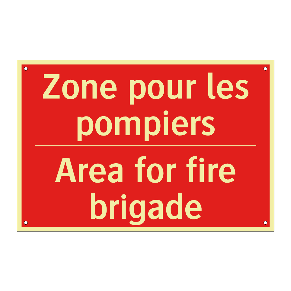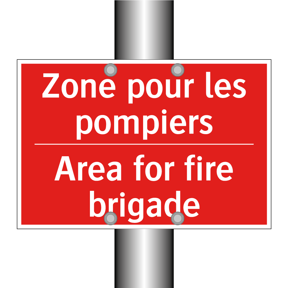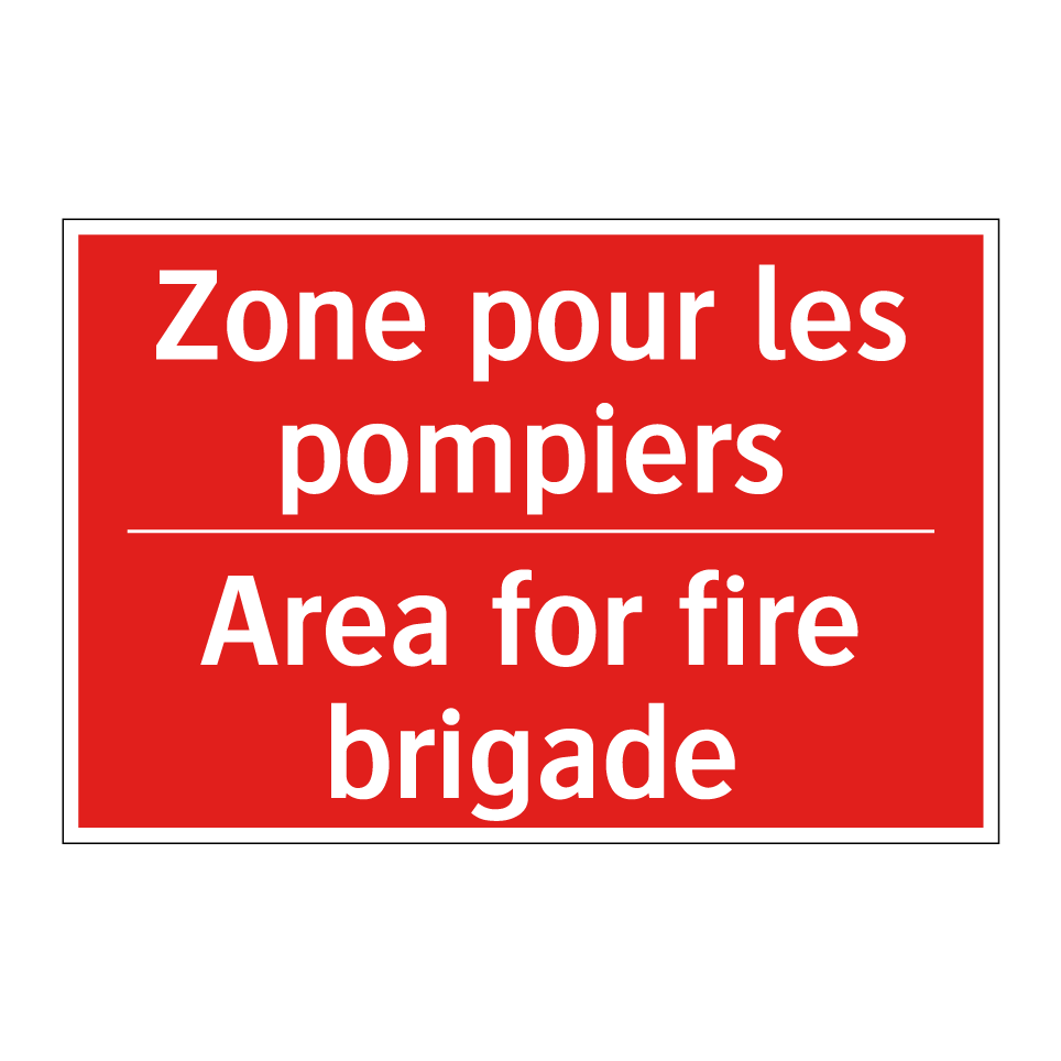 Panneau de signalisation incendie bilingue avec texte en français : "Zone pour les pompiers", et en anglais : "Area for fire brigade"