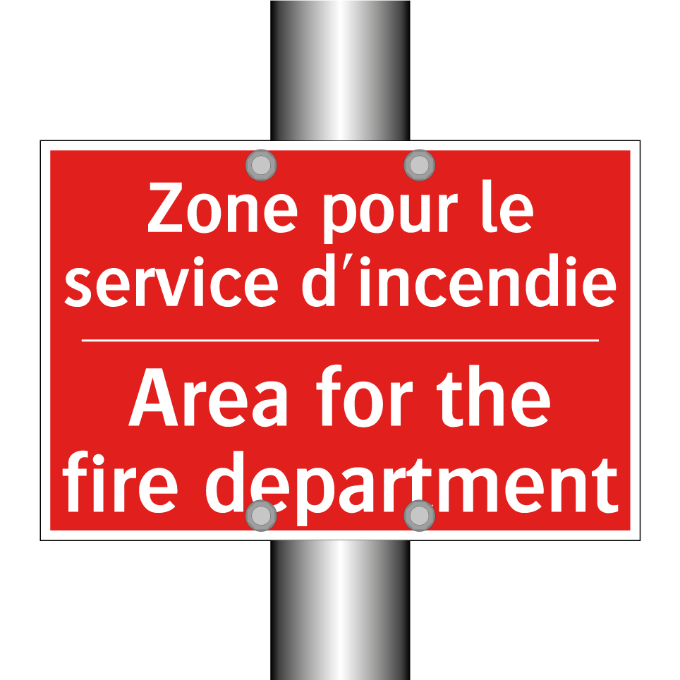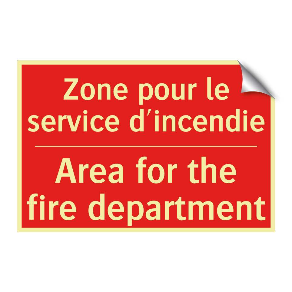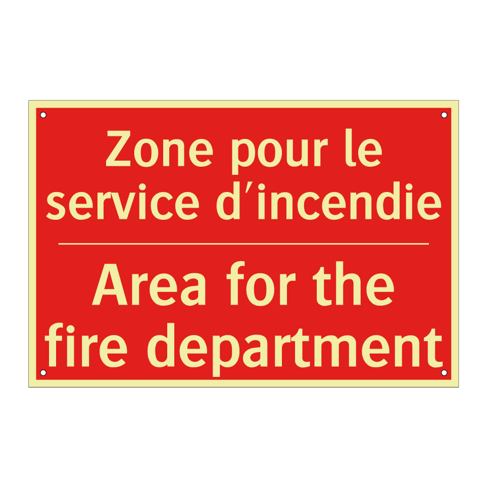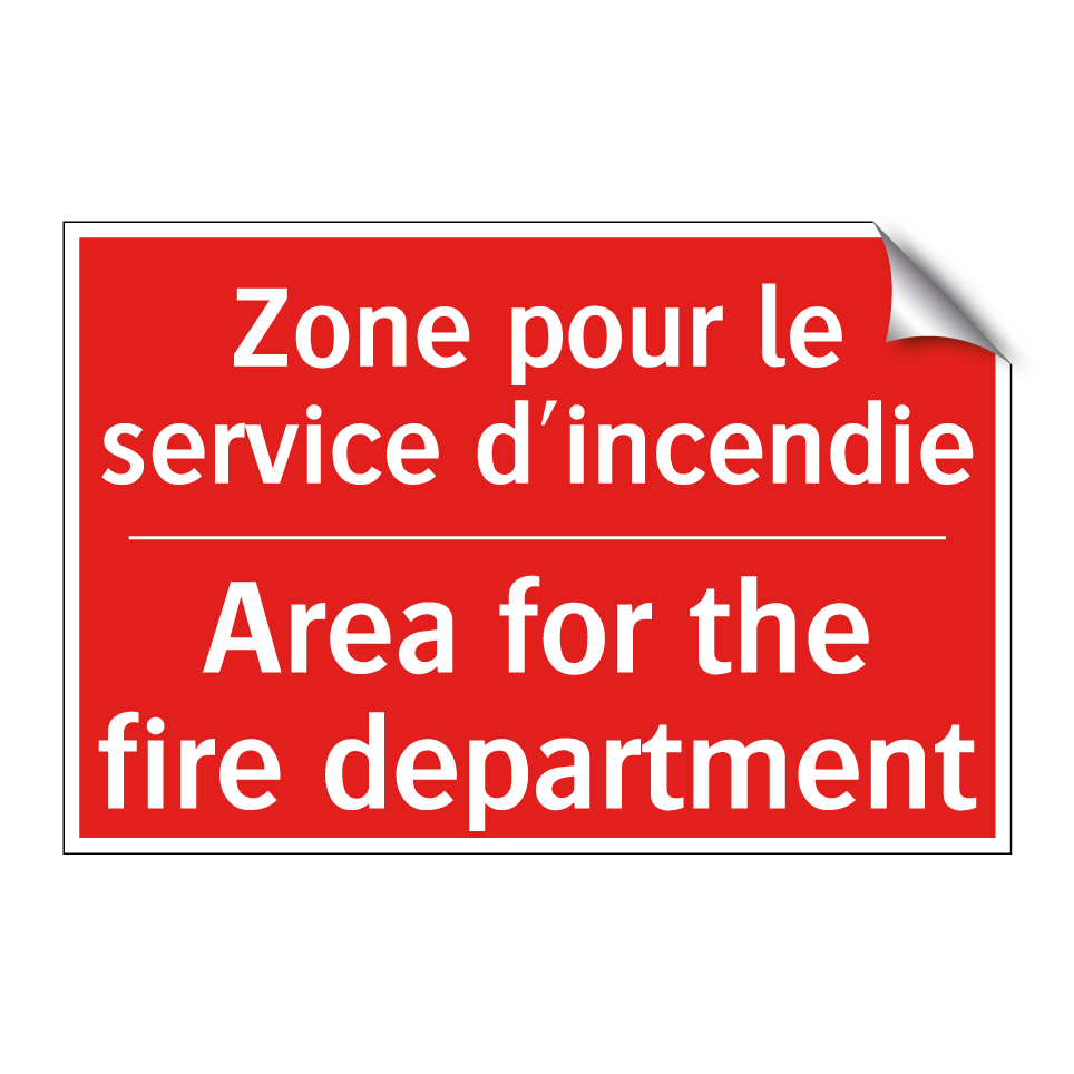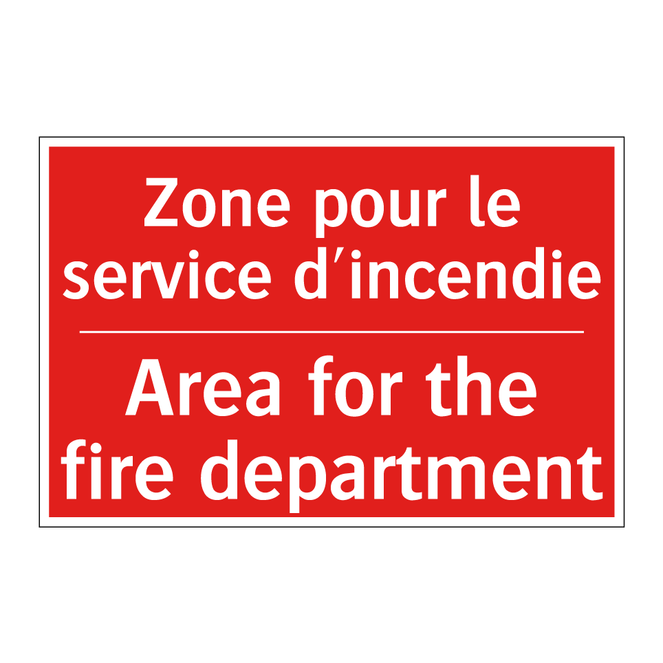 Panneau de signalisation incendie bilingue avec texte en français : "Zone pour le service d'incendie", et en anglais : "Area for the fire department"