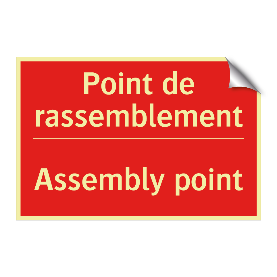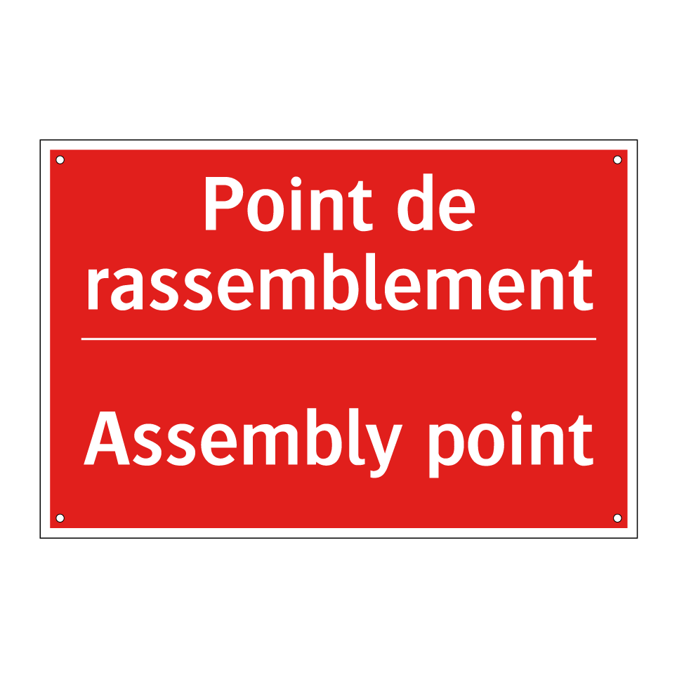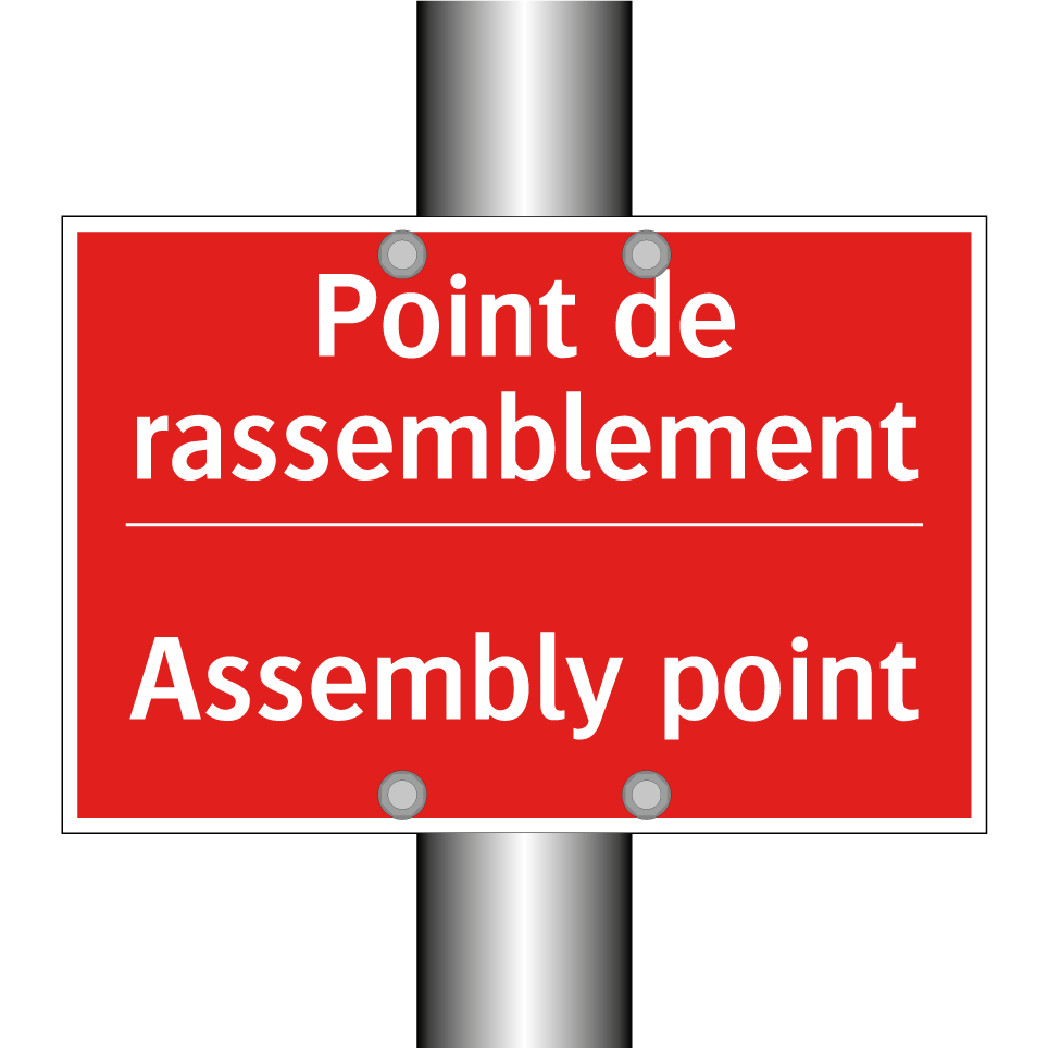 Panneau de signalisation incendie bilingue avec texte en français : "Point de rassemblement", et en anglais : "Assembly point"