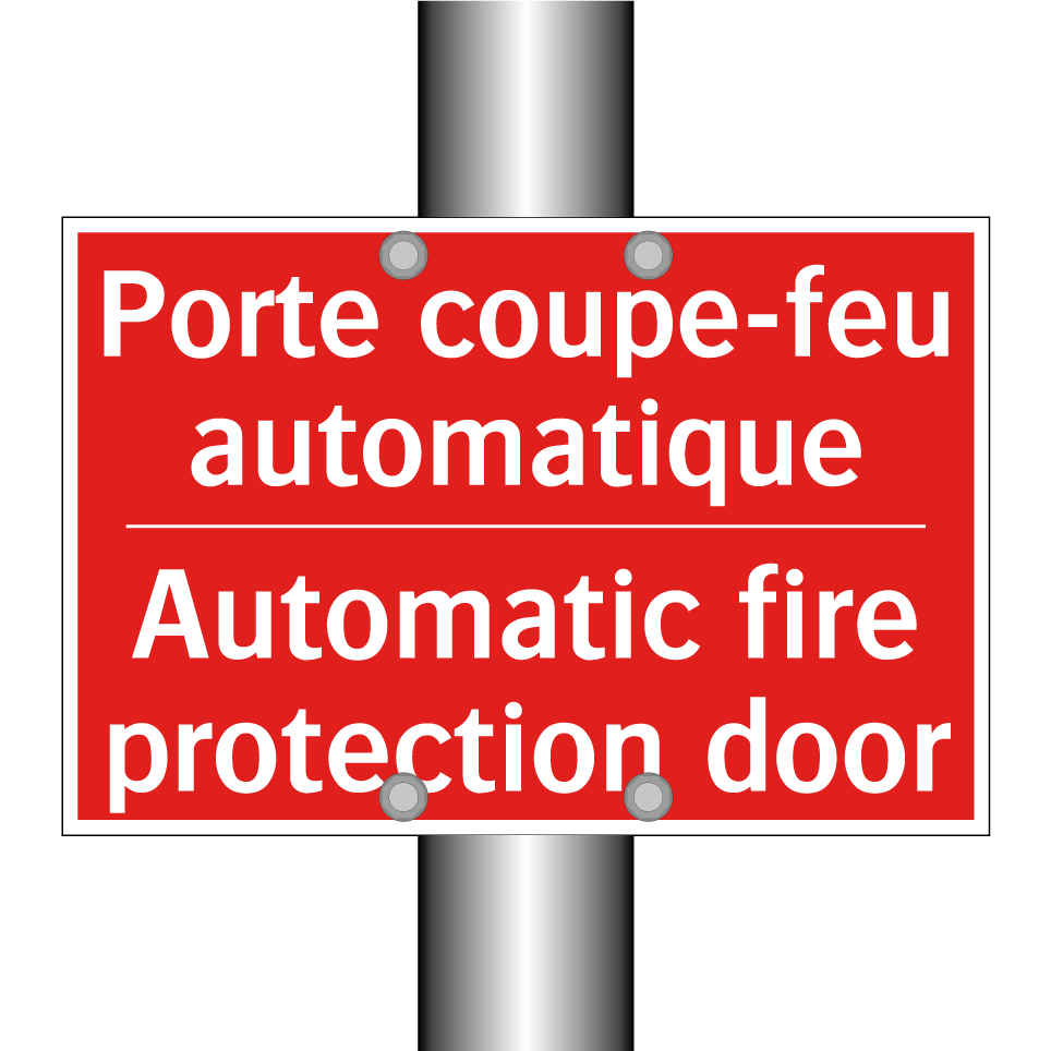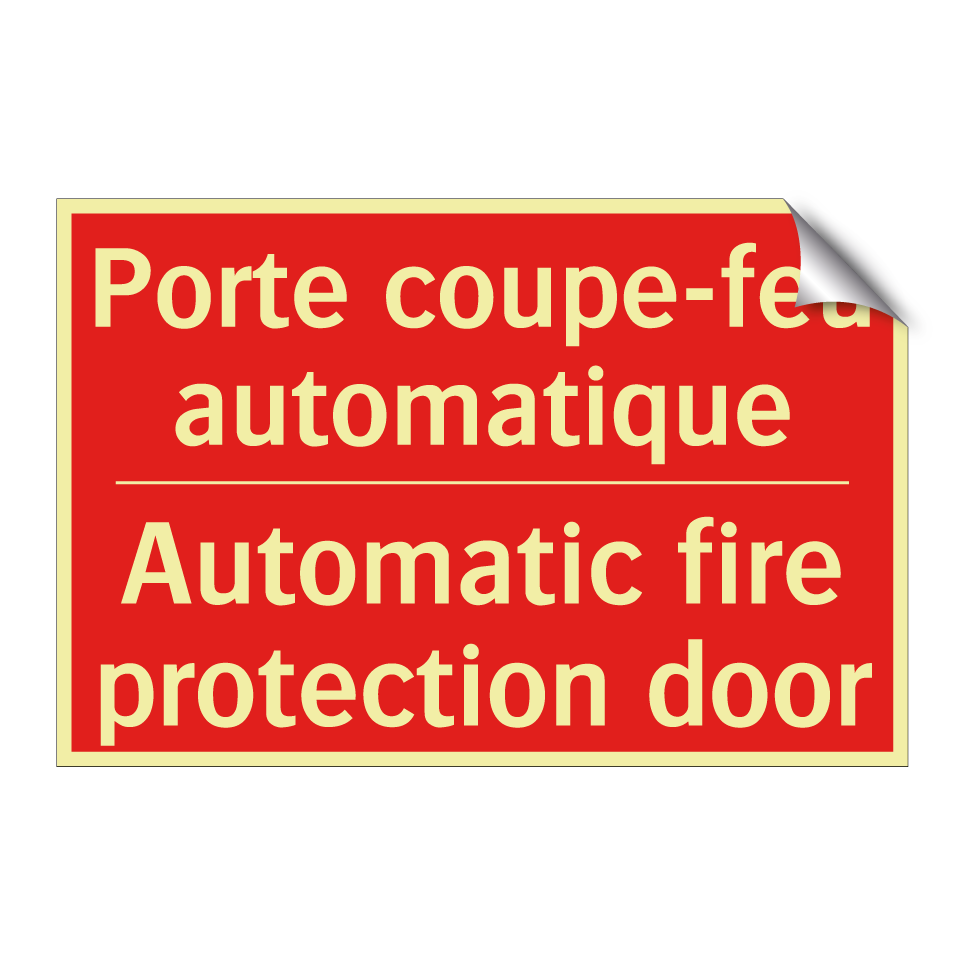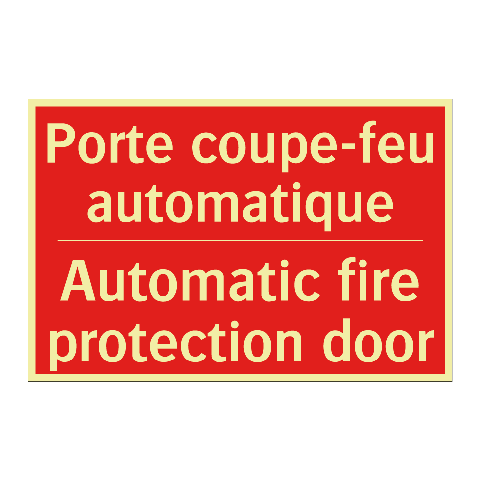 Panneau de signalisation incendie bilingue avec texte en français : "Porte coupe-feu automatique", et en anglais : "Automatic fire protection door"