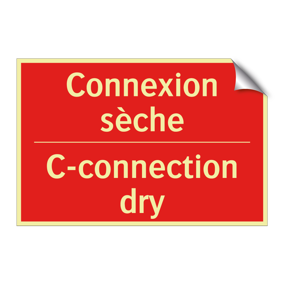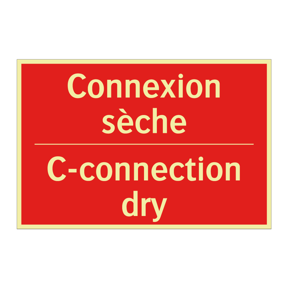 Panneau de signalisation incendie bilingue avec texte en français : "Connexion sèche", et en anglais : "C-connection dry"