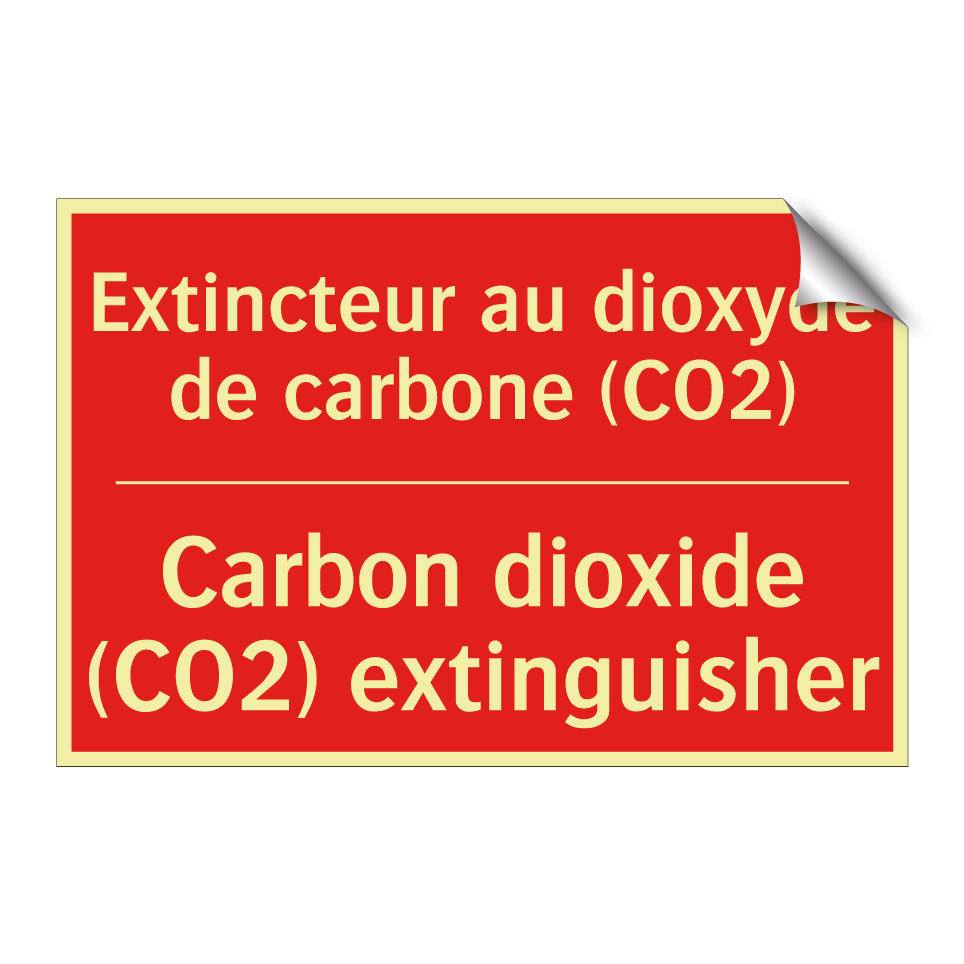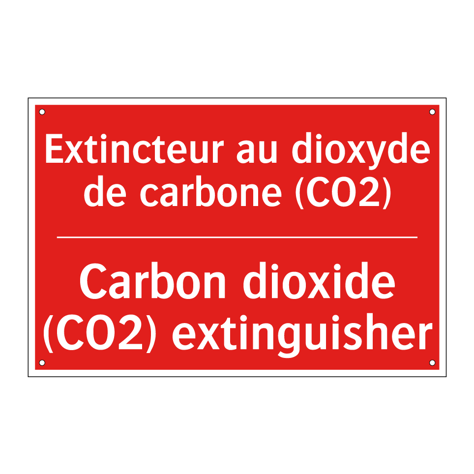 Panneau de signalisation incendie bilingue avec texte en français : "Extincteur au dioxyde de carbone (CO2)", et en anglais : "Carbon dioxide (CO2) extinguisher"