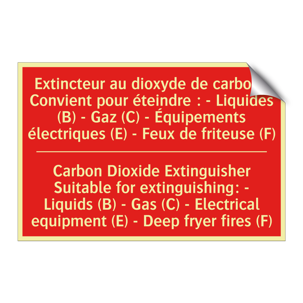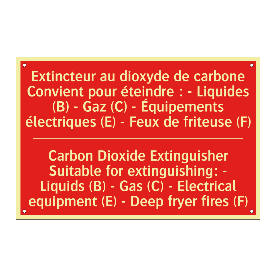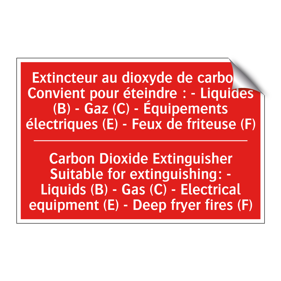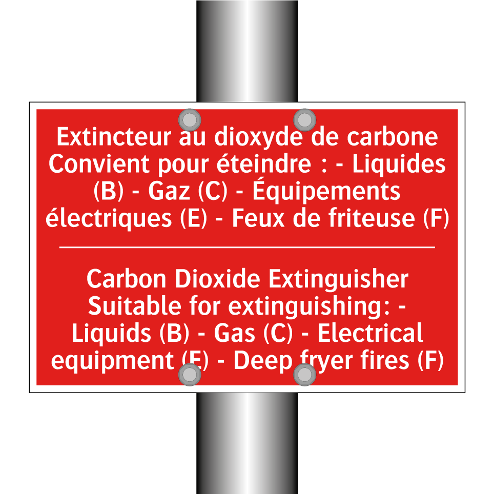 Panneau de signalisation incendie bilingue avec texte en français : "Extincteur au dioxyde de carbone Convient pour éteindre : - Liquides (B) - Gaz (C) - Équipements électriques (E) - Feux de friteuse (F)", et en anglais : "Carbon Dioxide Extinguisher Suitable for extinguishing: - Liquids (B) - Gas (C) - Electrical equipment (E) - Deep fryer fires (F)"