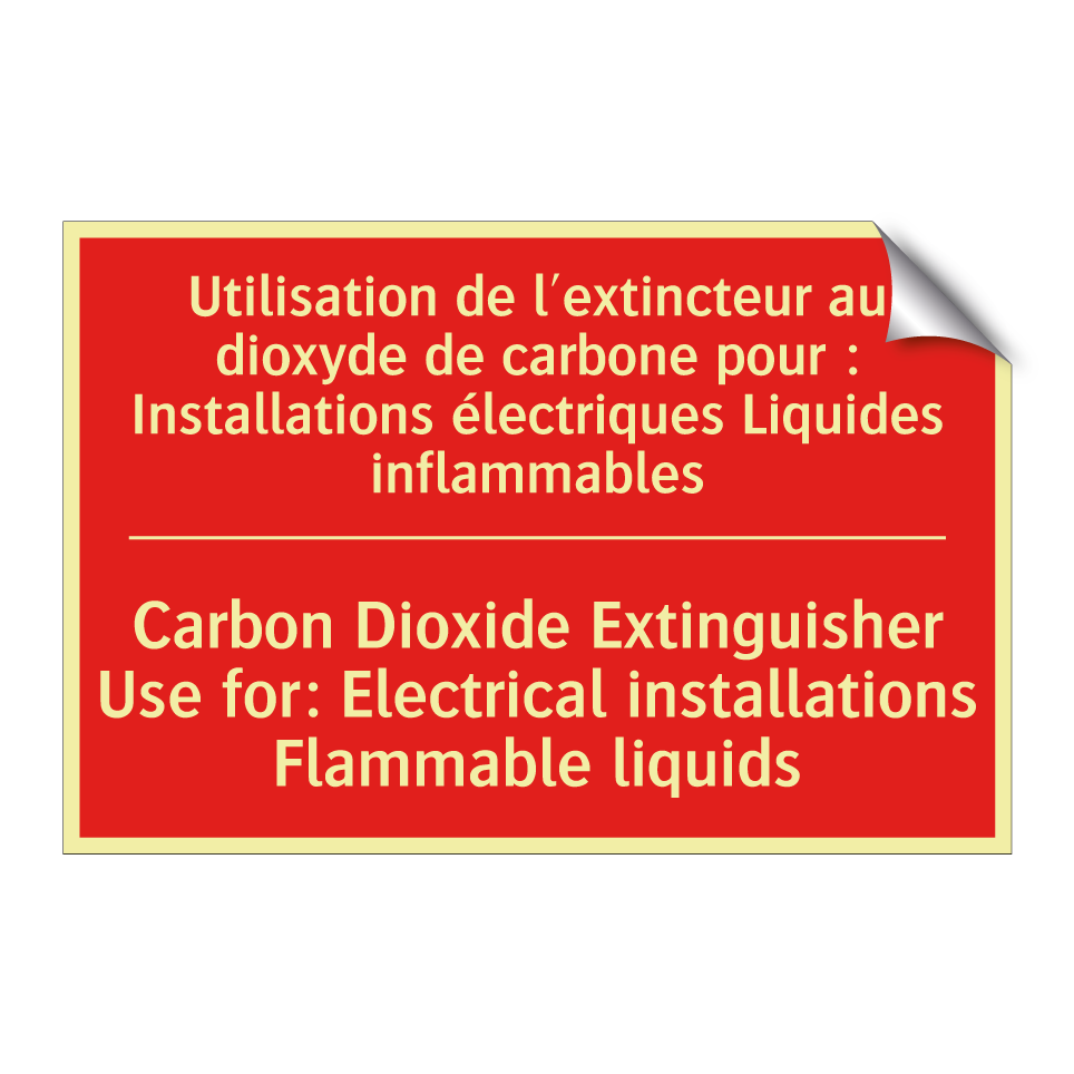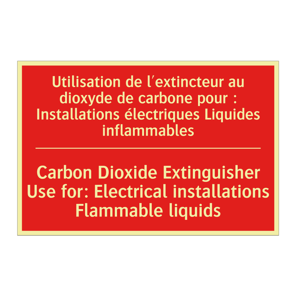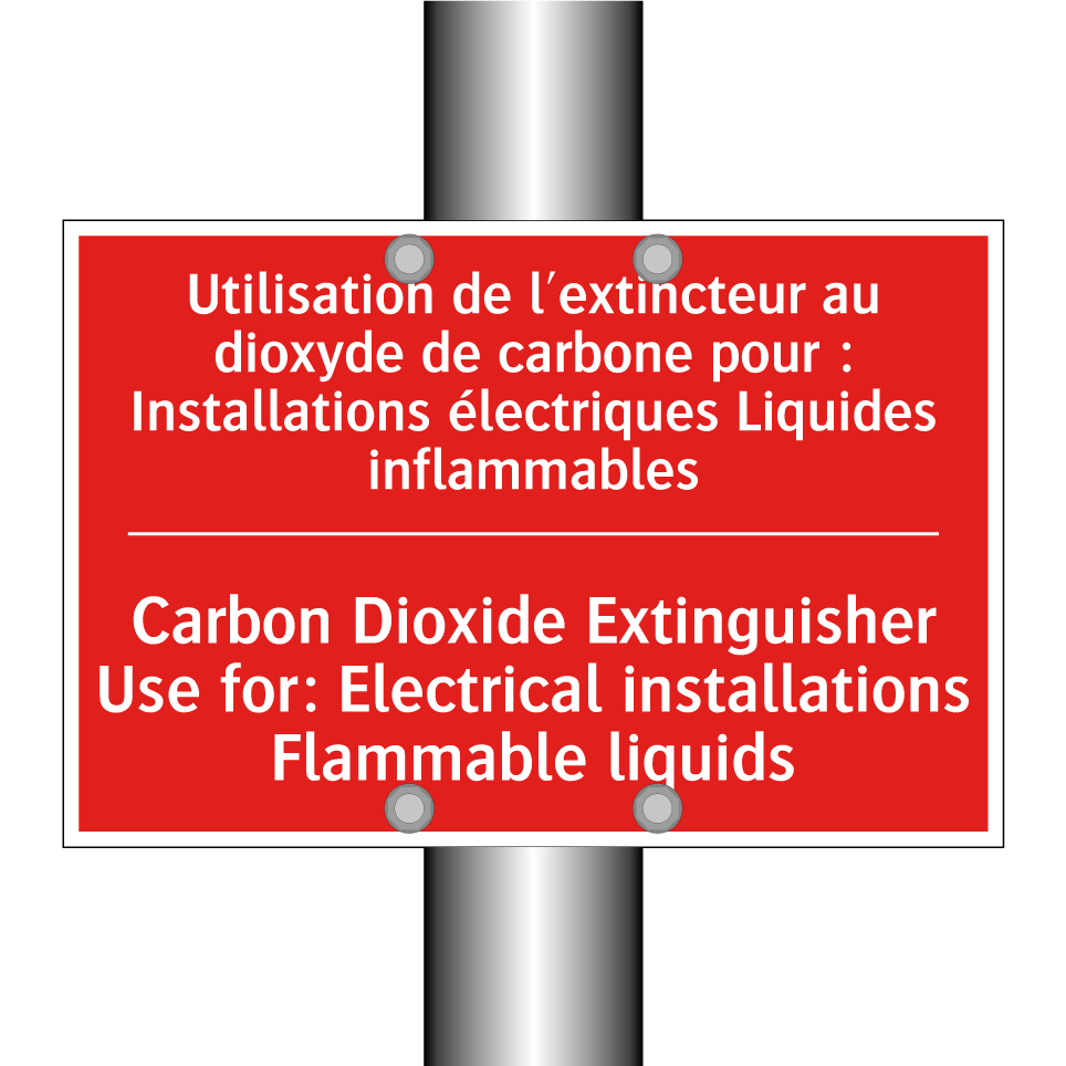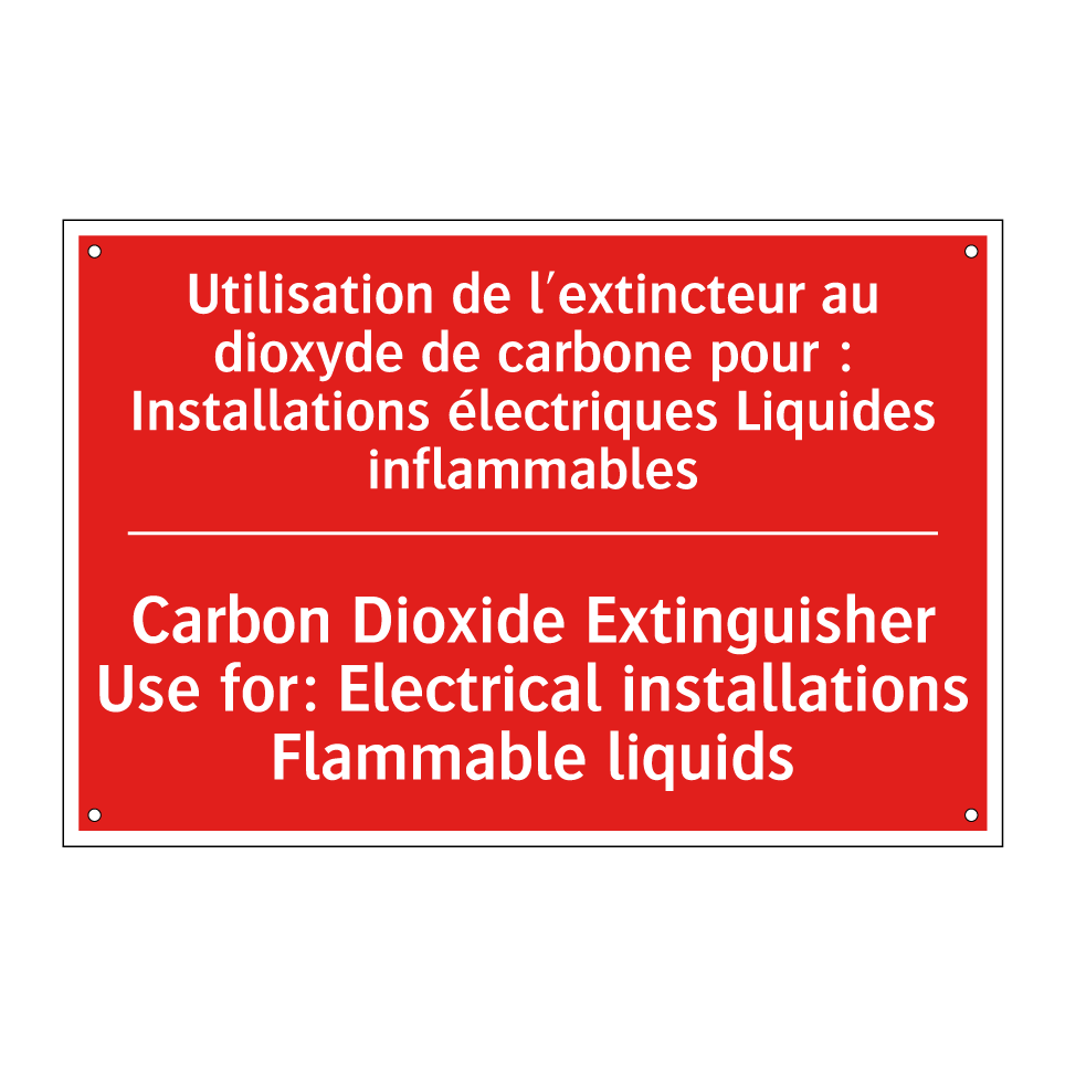 Panneau de signalisation incendie bilingue avec texte en français : "Utilisation de l'extincteur au dioxyde de carbone pour : Installations électriques Liquides inflammables", et en anglais : "Carbon Dioxide Extinguisher Use for: Electrical installations Flammable liquids"