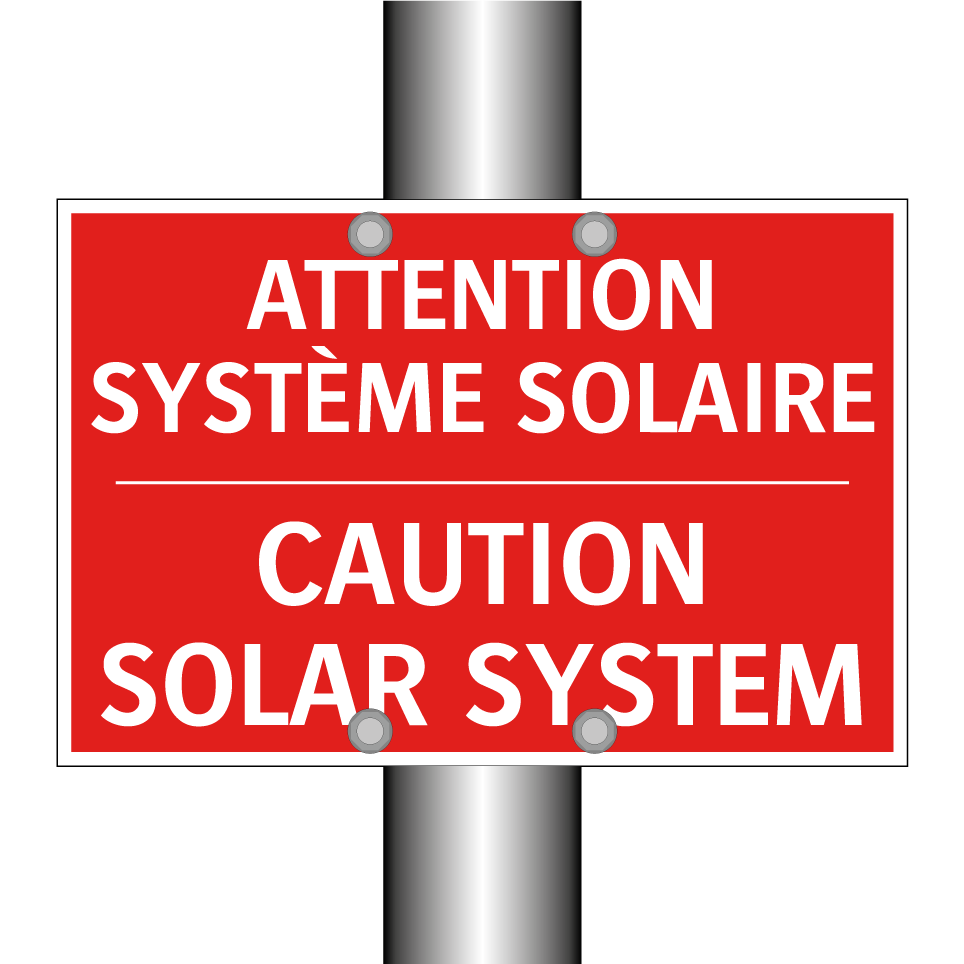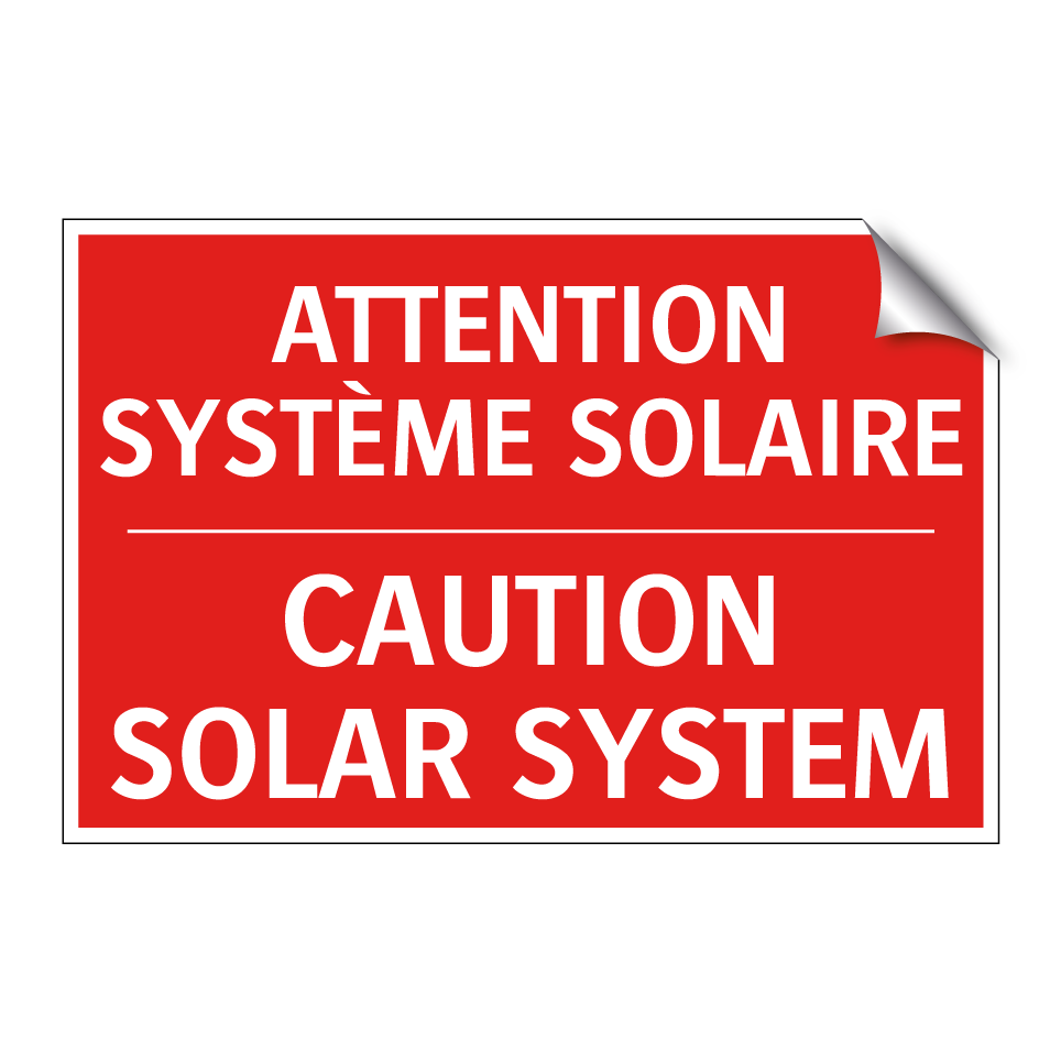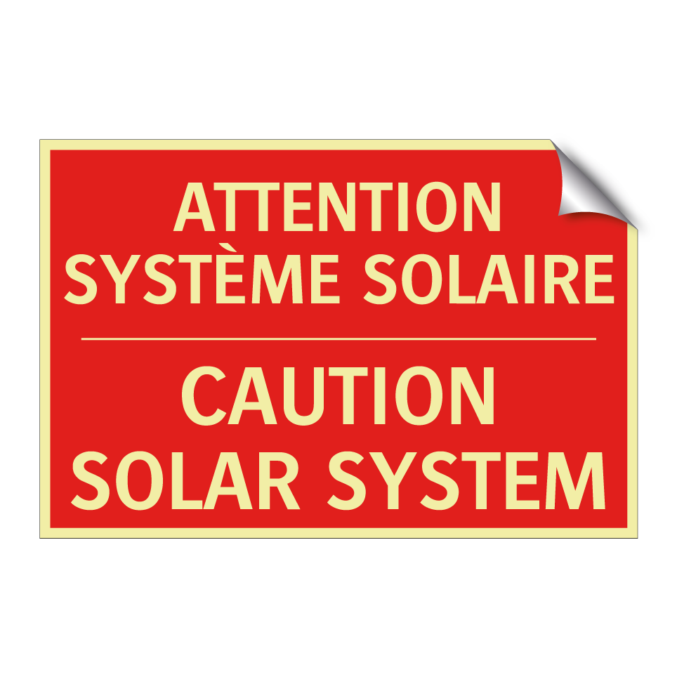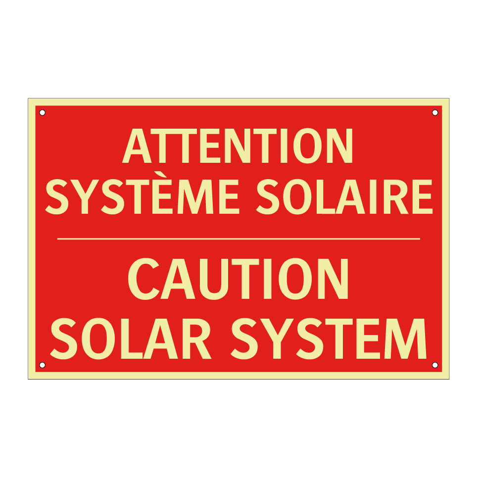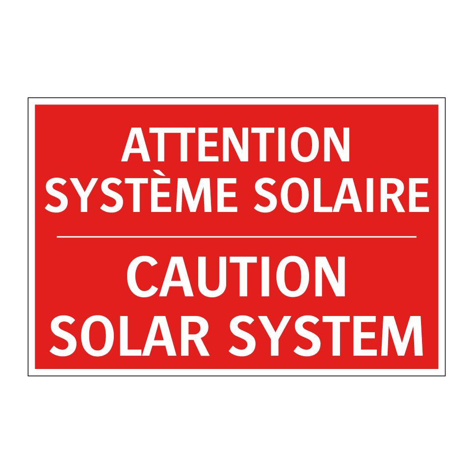 Panneau de signalisation incendie bilingue avec texte en français : "ATTENTION SYSTÈME SOLAIRE", et en anglais : "CAUTION SOLAR SYSTEM"