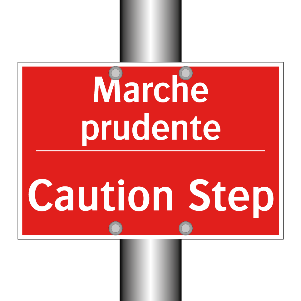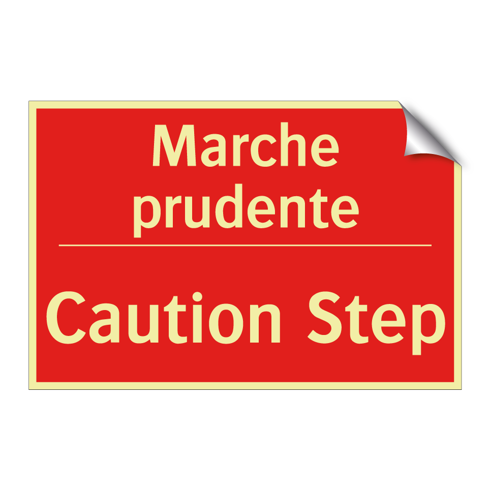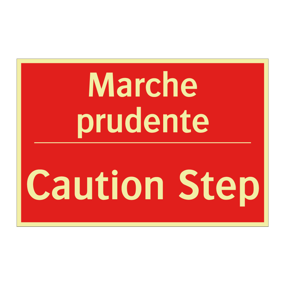 Panneau de signalisation incendie bilingue avec texte en français : "Marche prudente", et en anglais : "Caution Step"