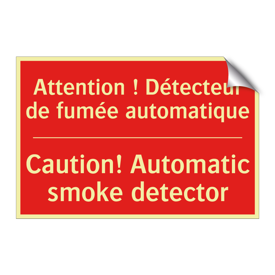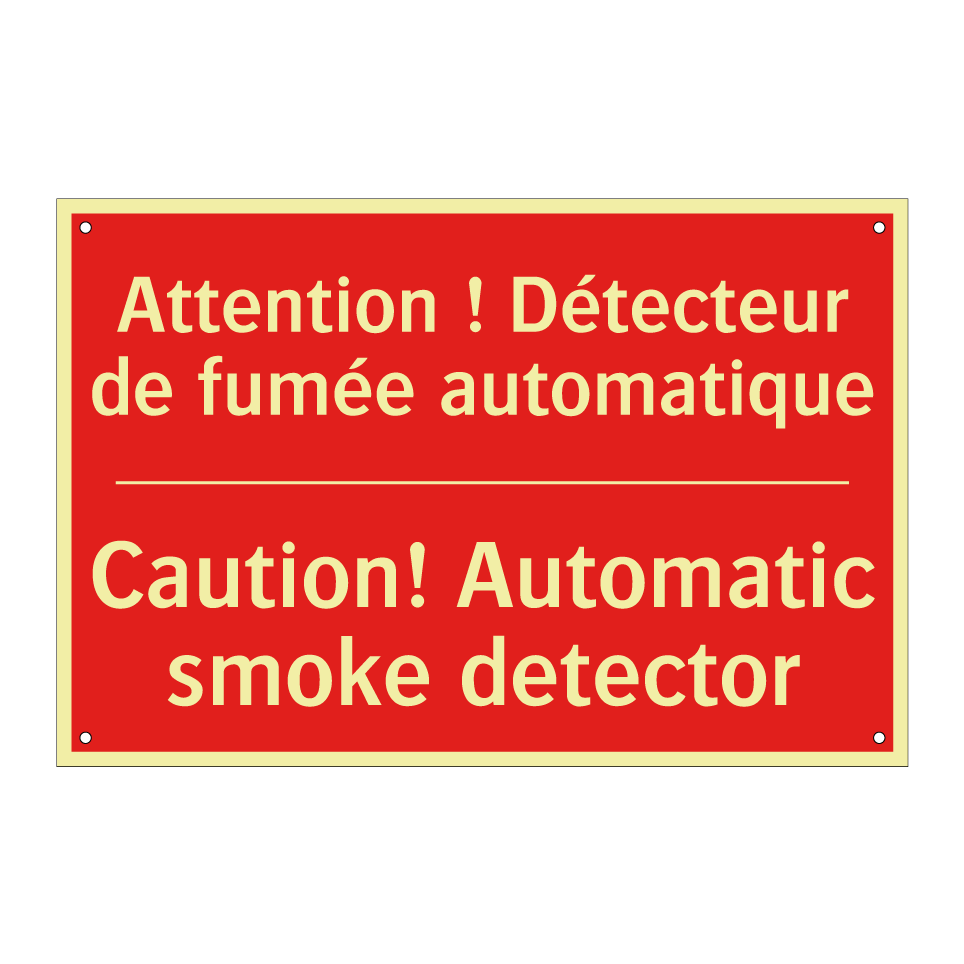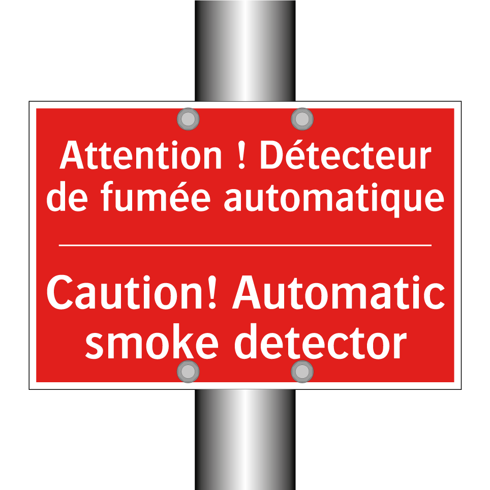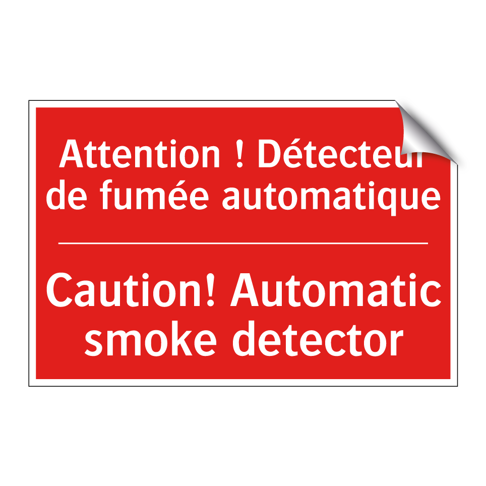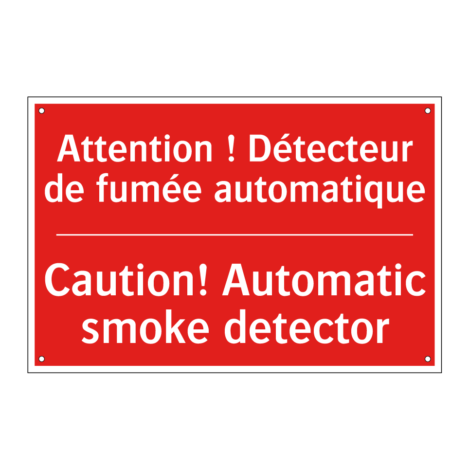 Panneau de signalisation incendie bilingue avec texte en français : "Attention ! Détecteur de fumée automatique", et en anglais : "Caution! Automatic smoke detector"