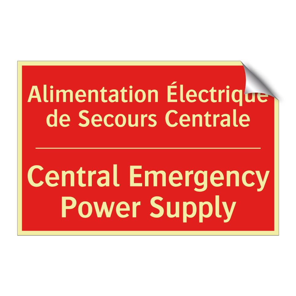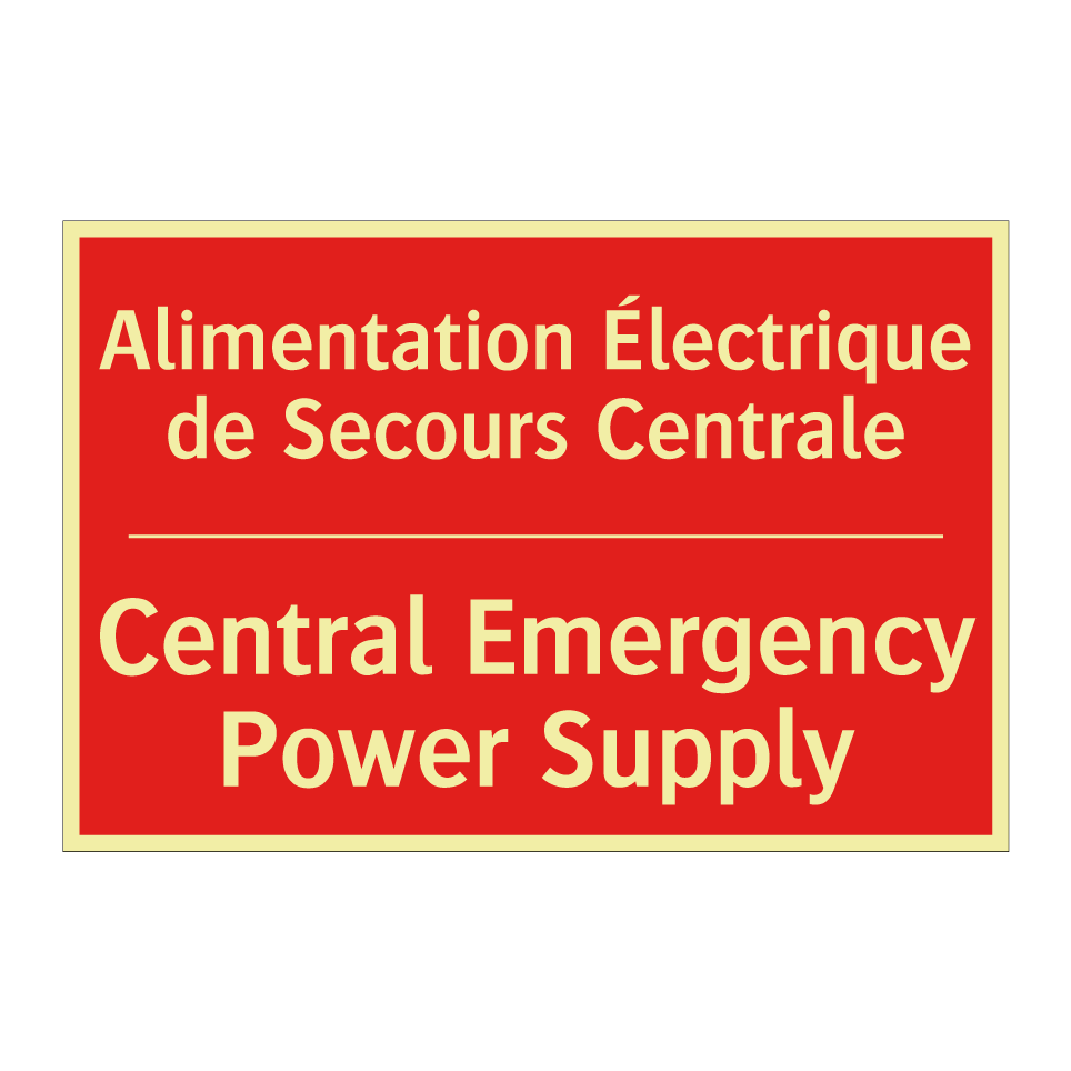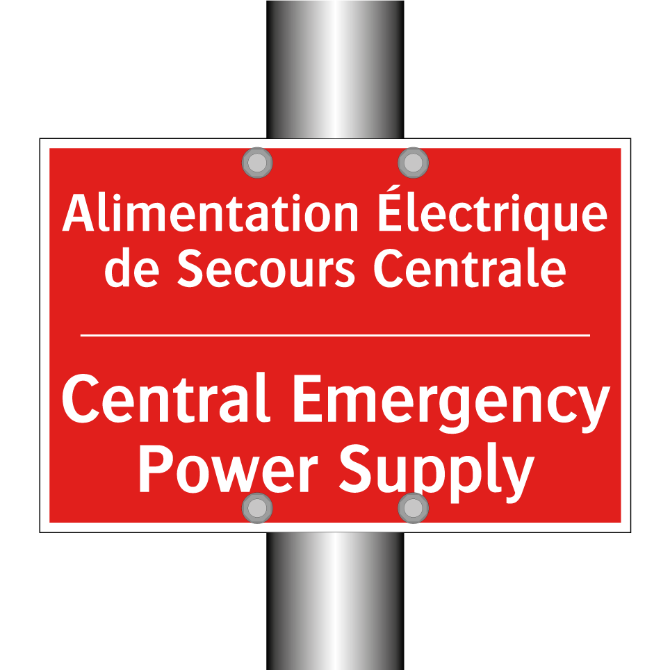 Panneau de signalisation incendie bilingue avec texte en français : "Alimentation Électrique de Secours Centrale", et en anglais : "Central Emergency Power Supply"