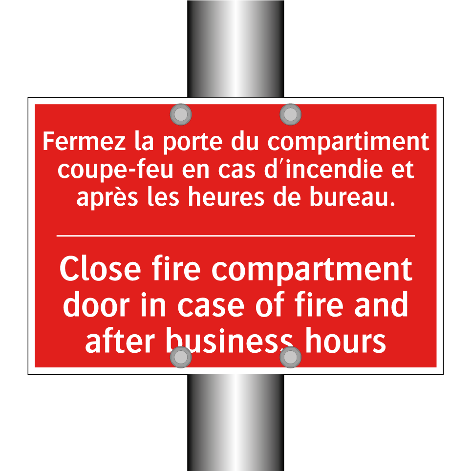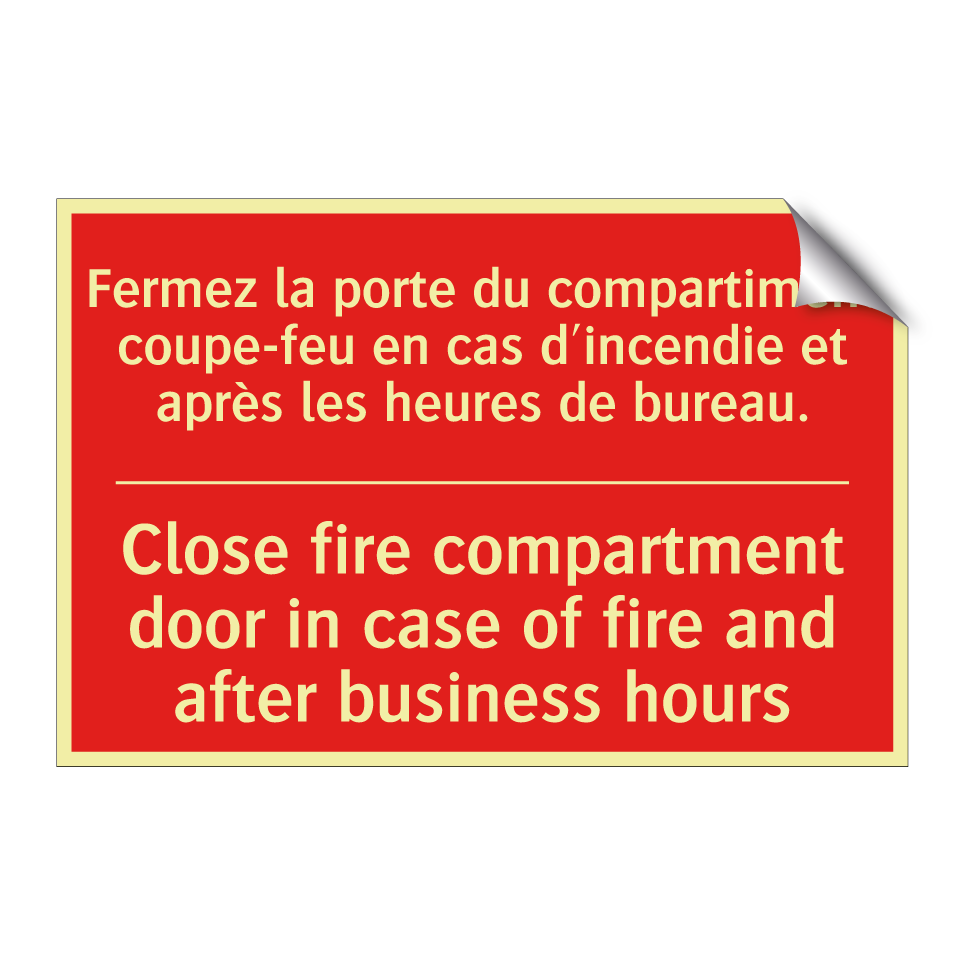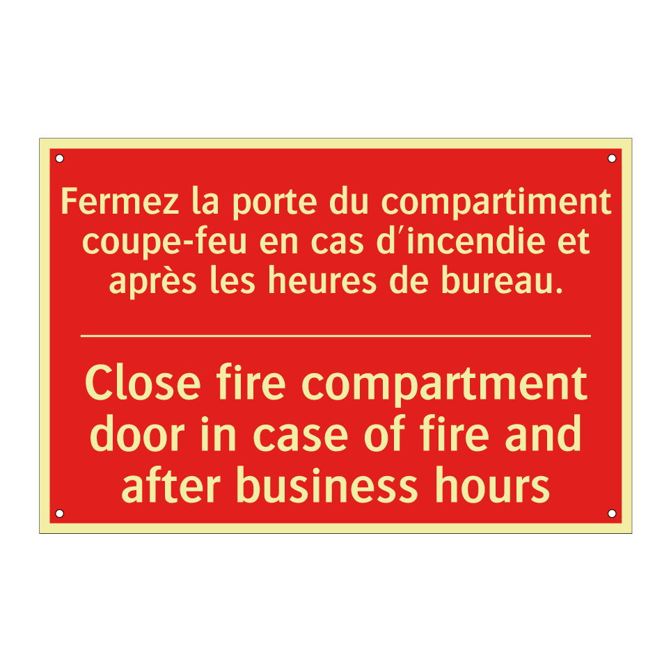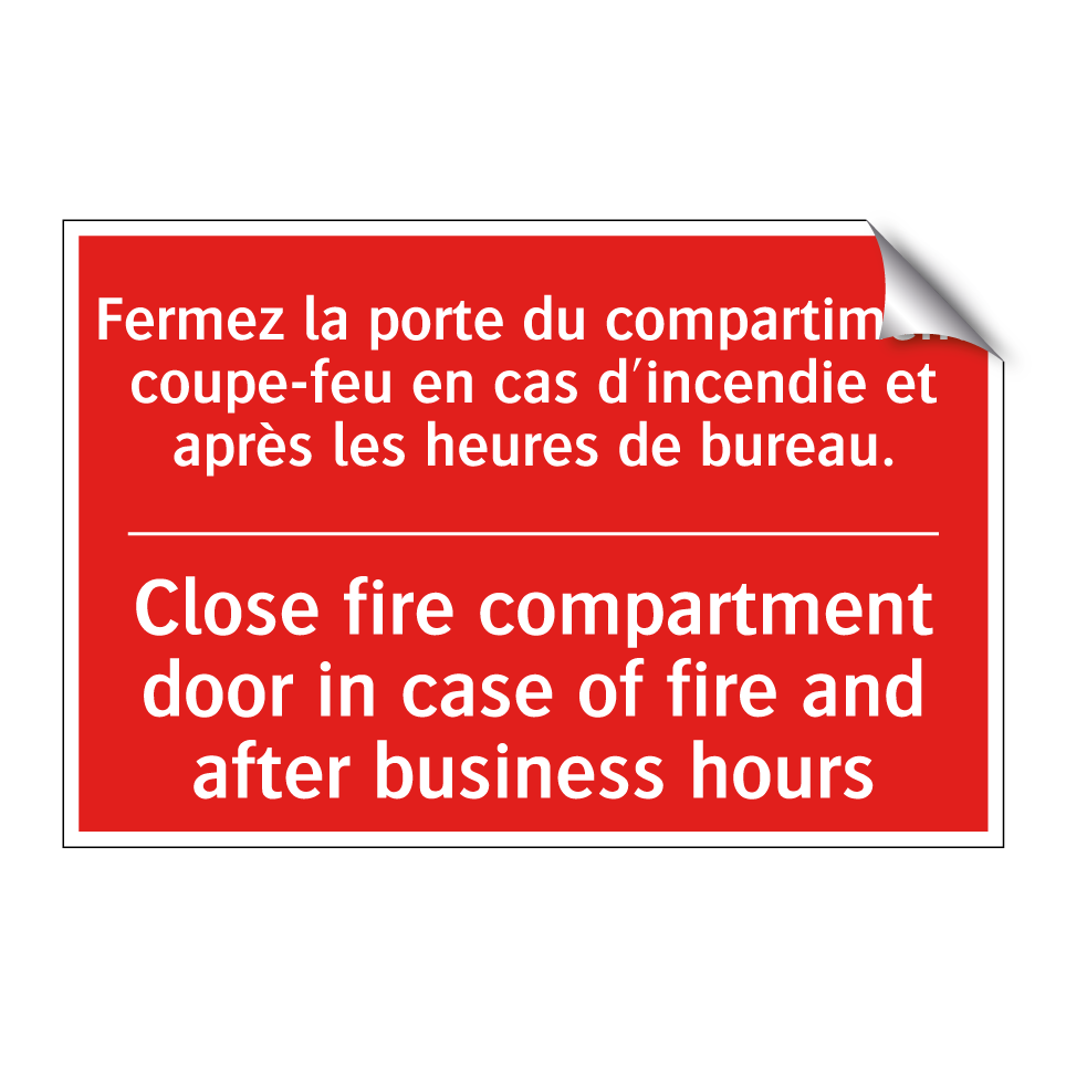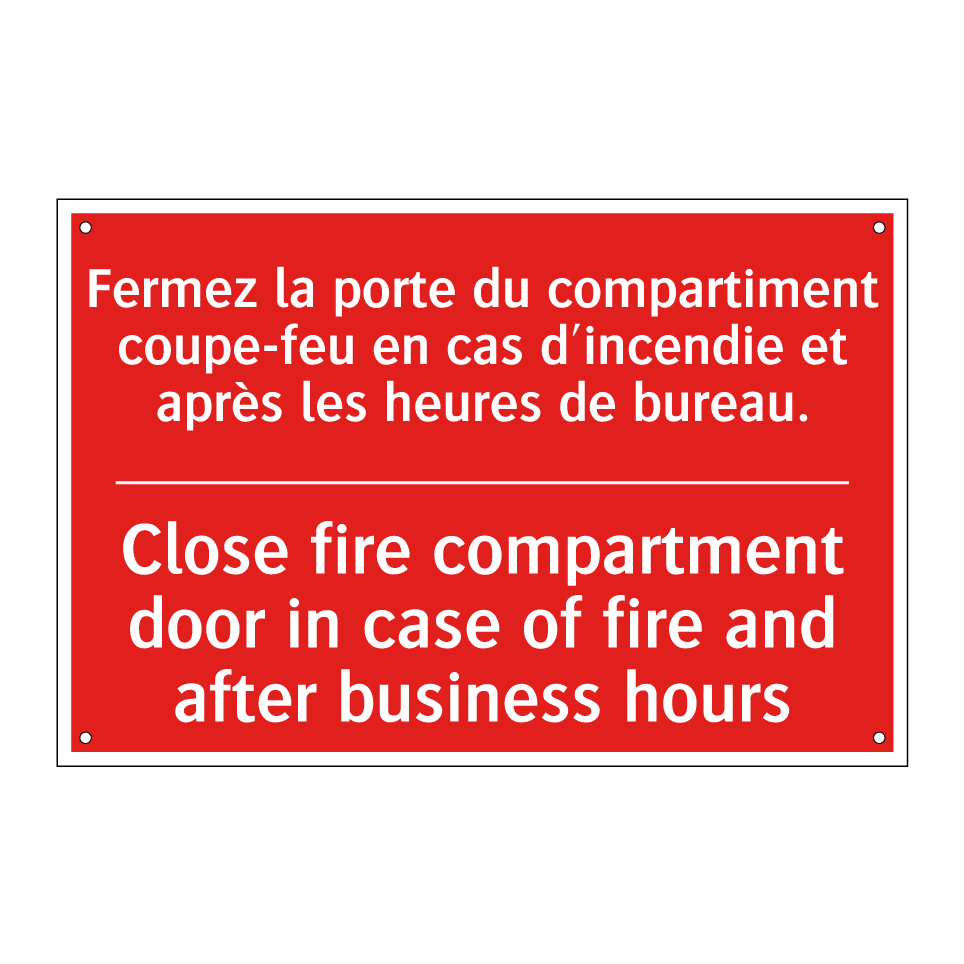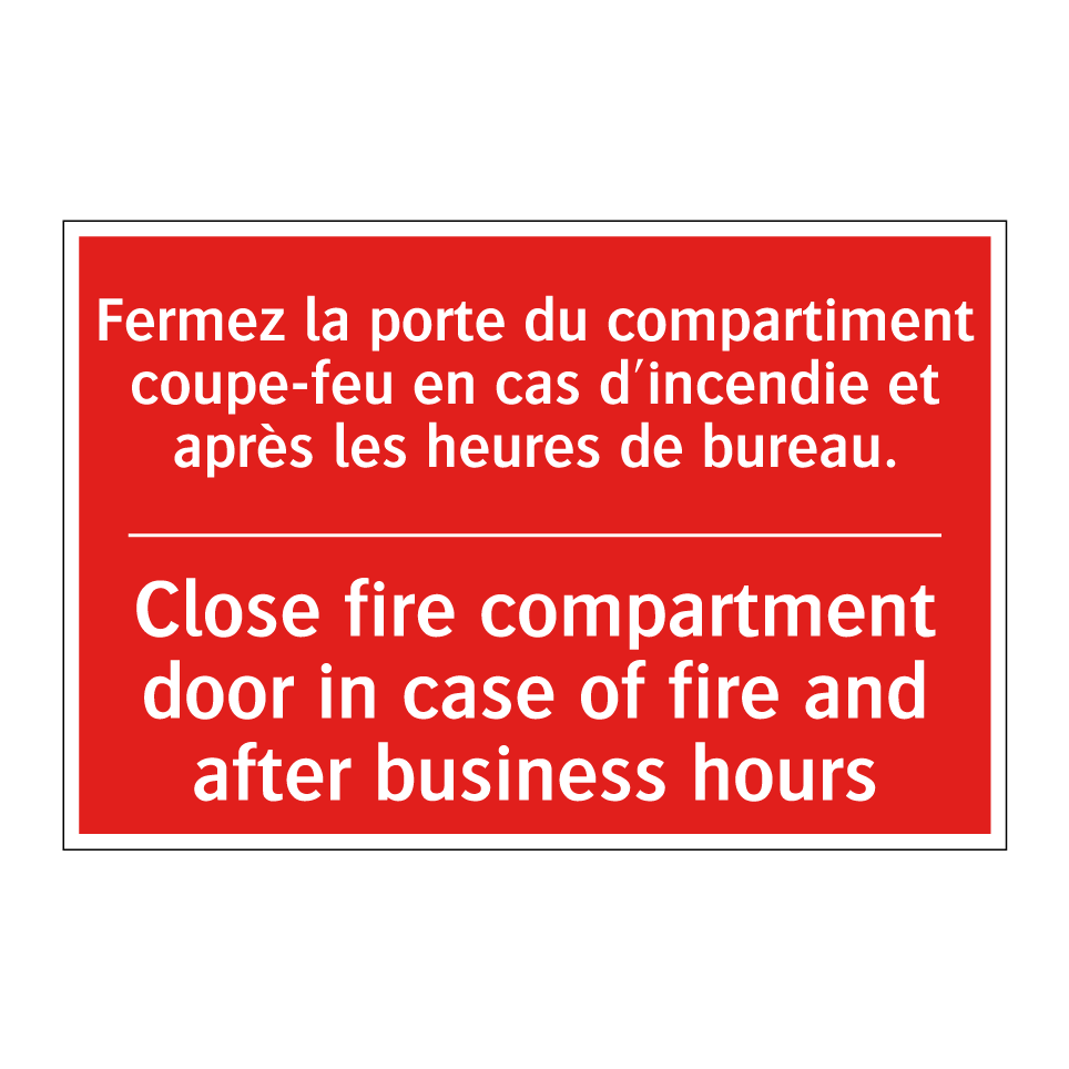 Panneau de signalisation incendie bilingue avec texte en français : "Fermez la porte du compartiment coupe-feu en cas d'incendie et après les heures de bureau.", et en anglais : "Close fire compartment door in case of fire and after business hours"