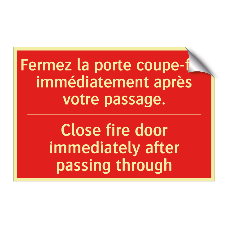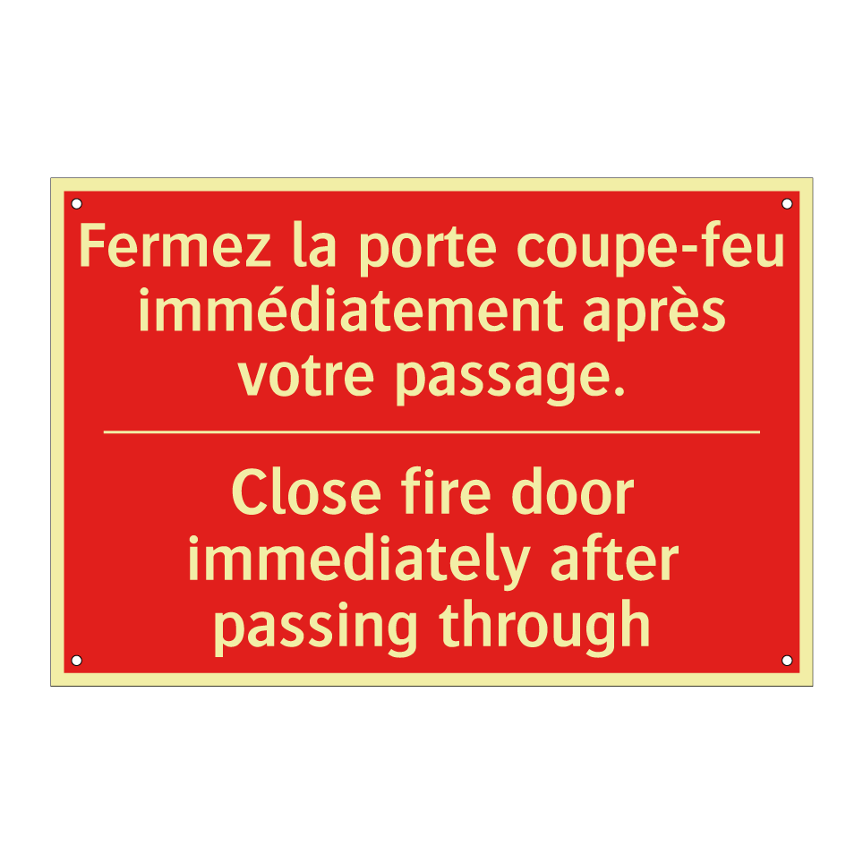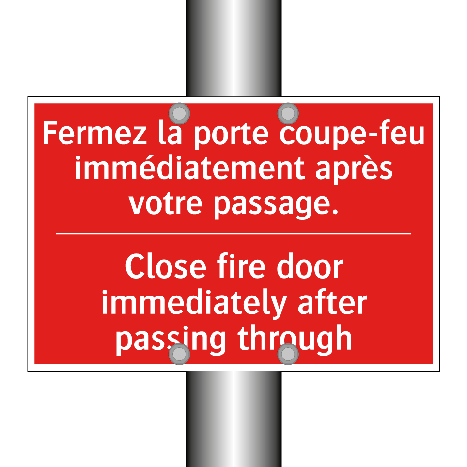 Panneau de signalisation incendie bilingue avec texte en français : "Fermez la porte coupe-feu immédiatement après votre passage.", et en anglais : "Close fire door immediately after passing through"
