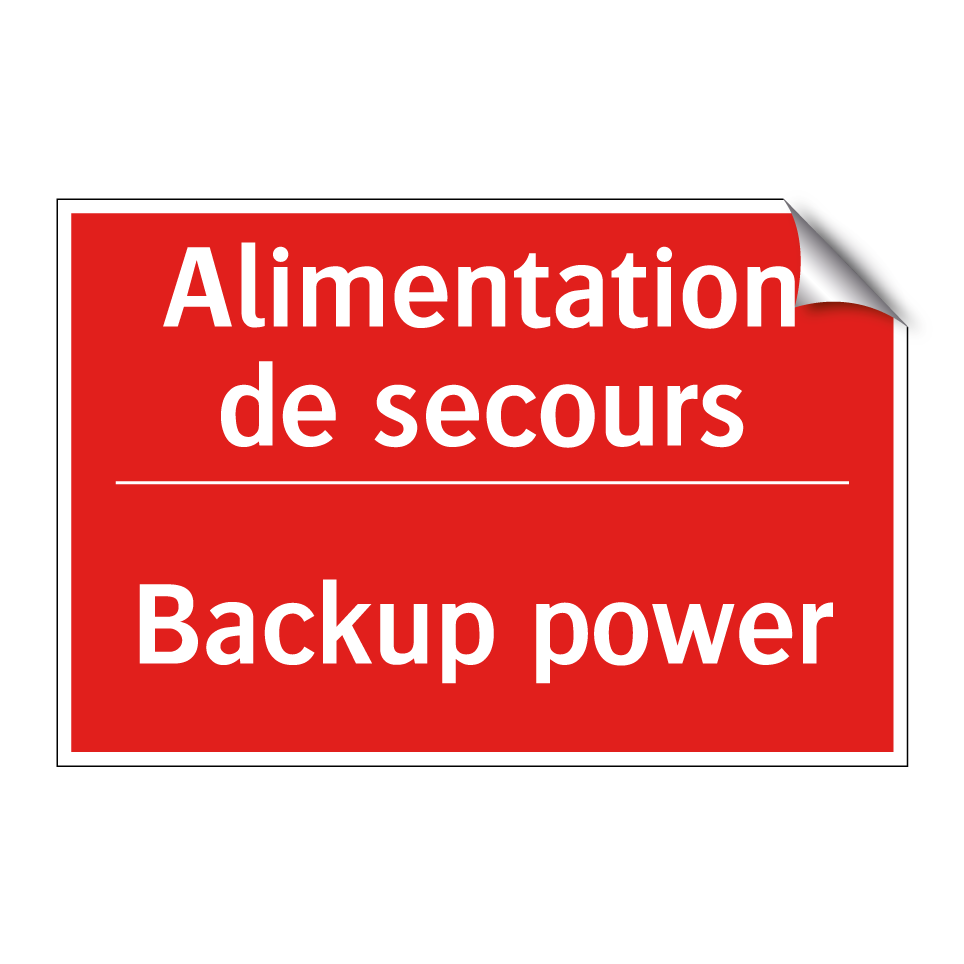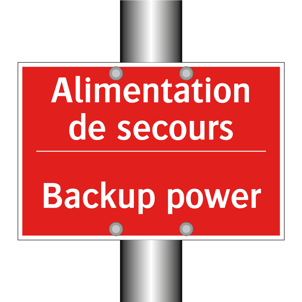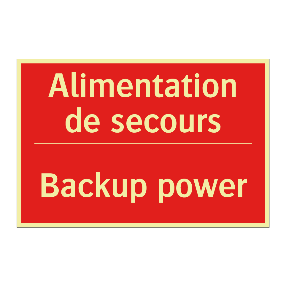Panneau de signalisation incendie bilingue avec texte en français : "Alimentation de secours", et en anglais : "Backup power"