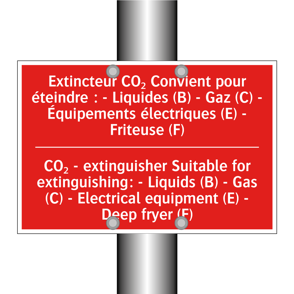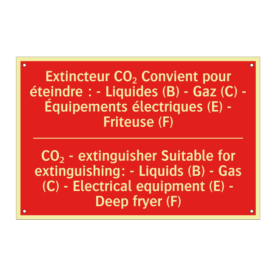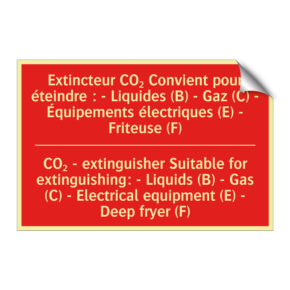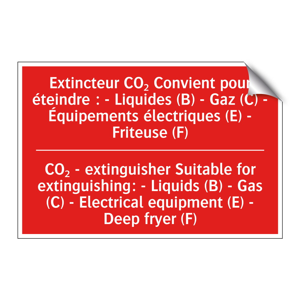 Panneau de signalisation incendie bilingue avec texte en français : "Extincteur CO₂ Convient pour éteindre : - Liquides (B) - Gaz (C) - Équipements électriques (E) - Friteuse (F)", et en anglais : "CO₂ - extinguisher Suitable for extinguishing: - Liquids (B) - Gas (C) - Electrical equipment (E) - Deep fryer (F)"