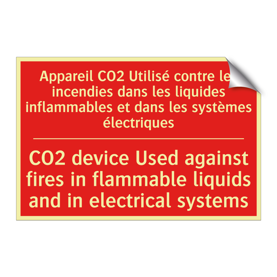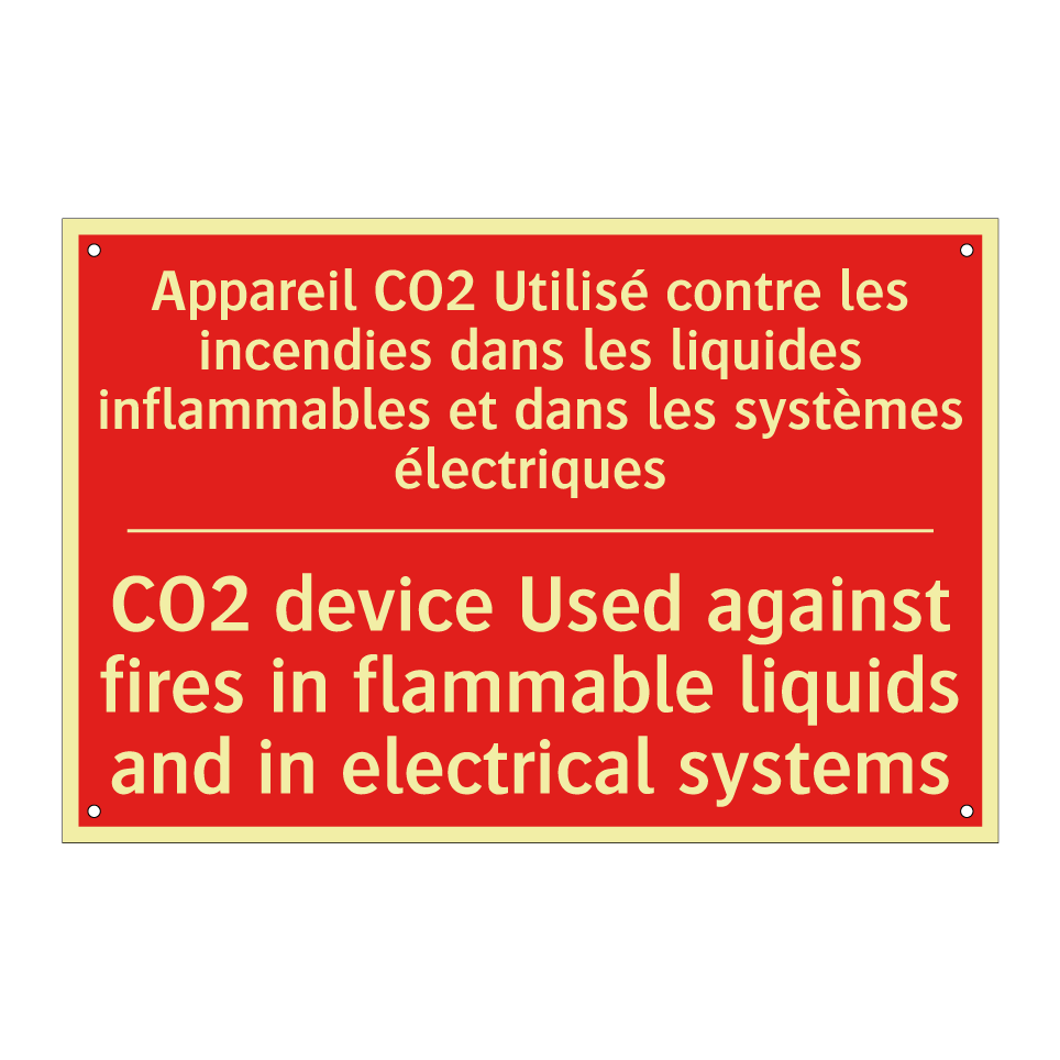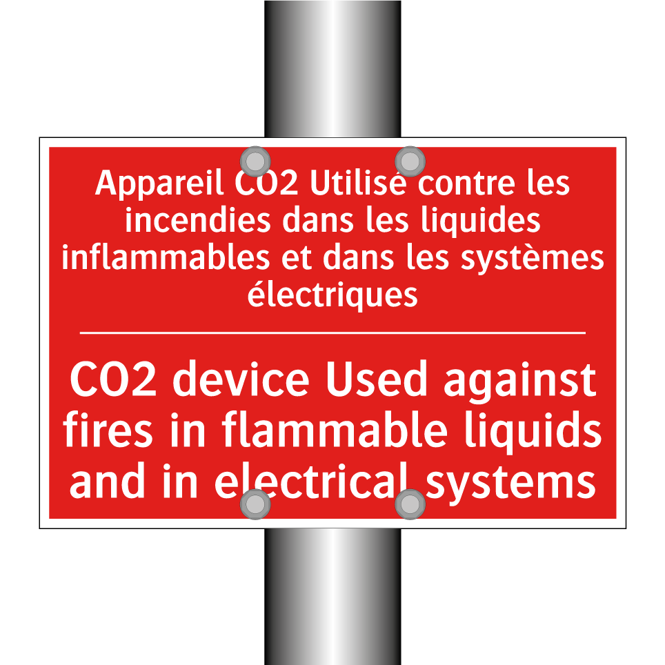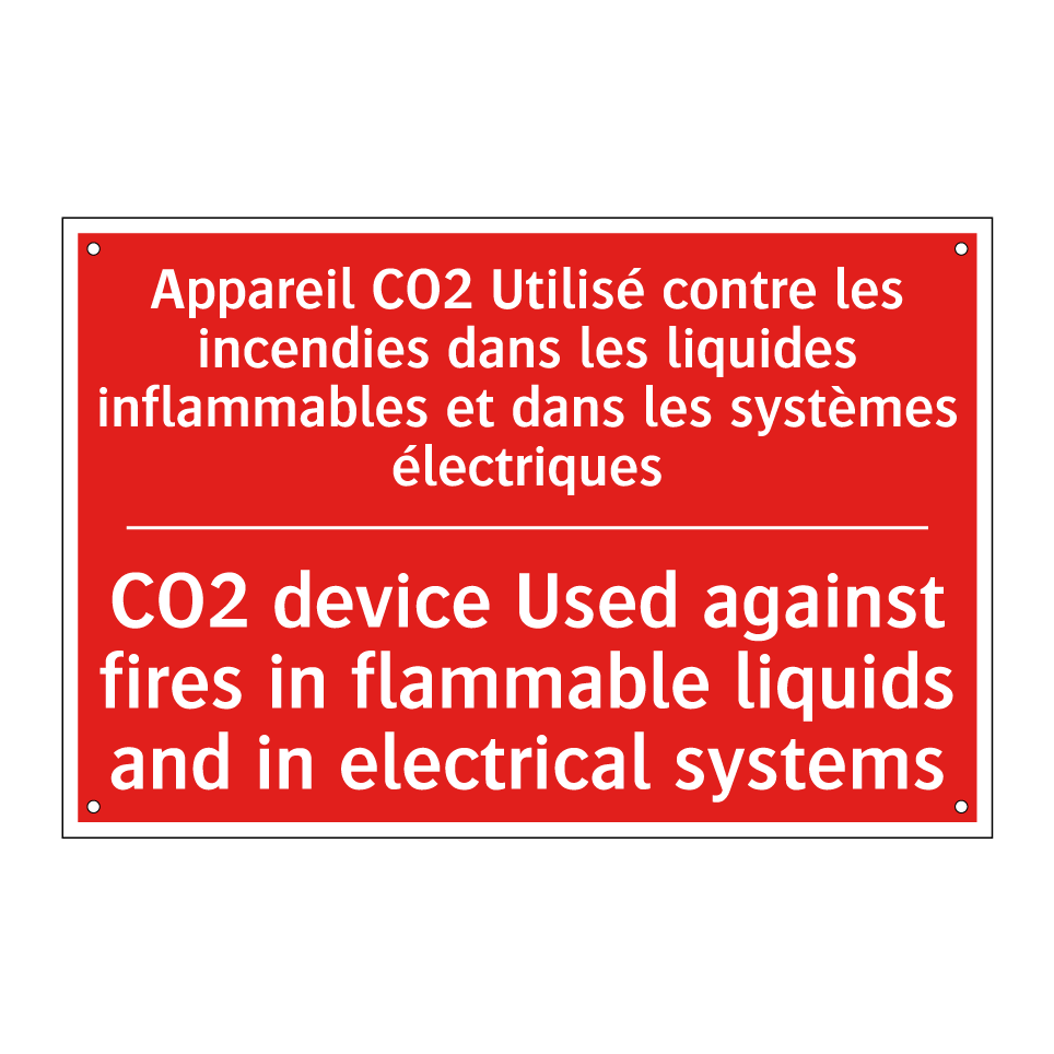 Panneau de signalisation incendie bilingue avec texte en français : "Appareil CO2 Utilisé contre les incendies dans les liquides inflammables et dans les systèmes électriques", et en anglais : "CO2 device Used against fires in flammable liquids and in electrical systems"