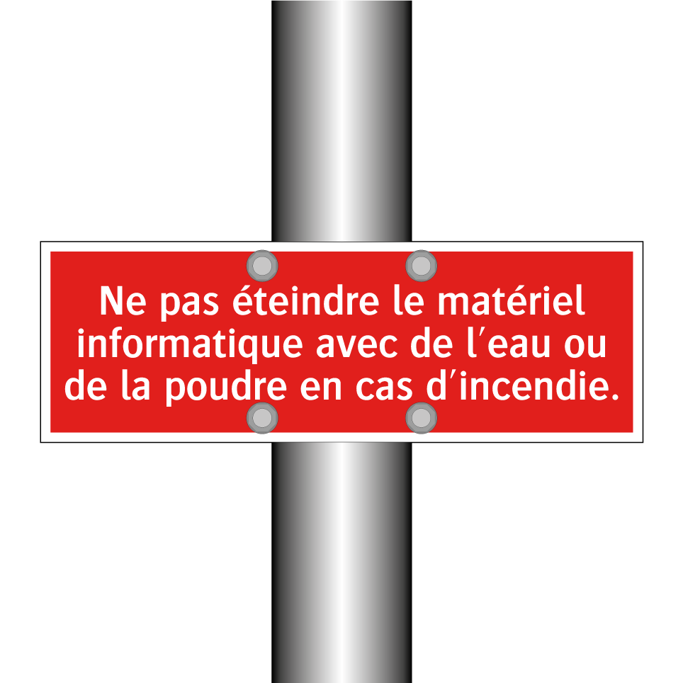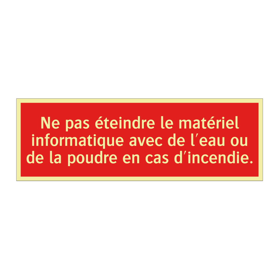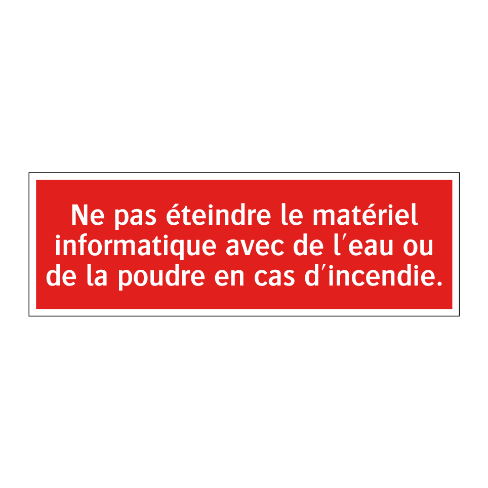 Panneau de signalisation incendie avec le texte Ne pas éteindre le matériel informatique avec de l'eau ou de la poudre en cas d'incendie.