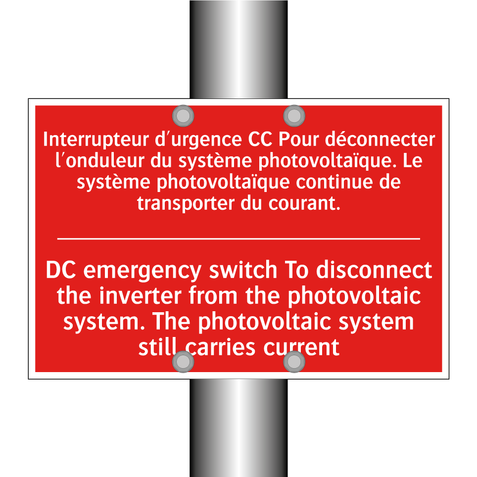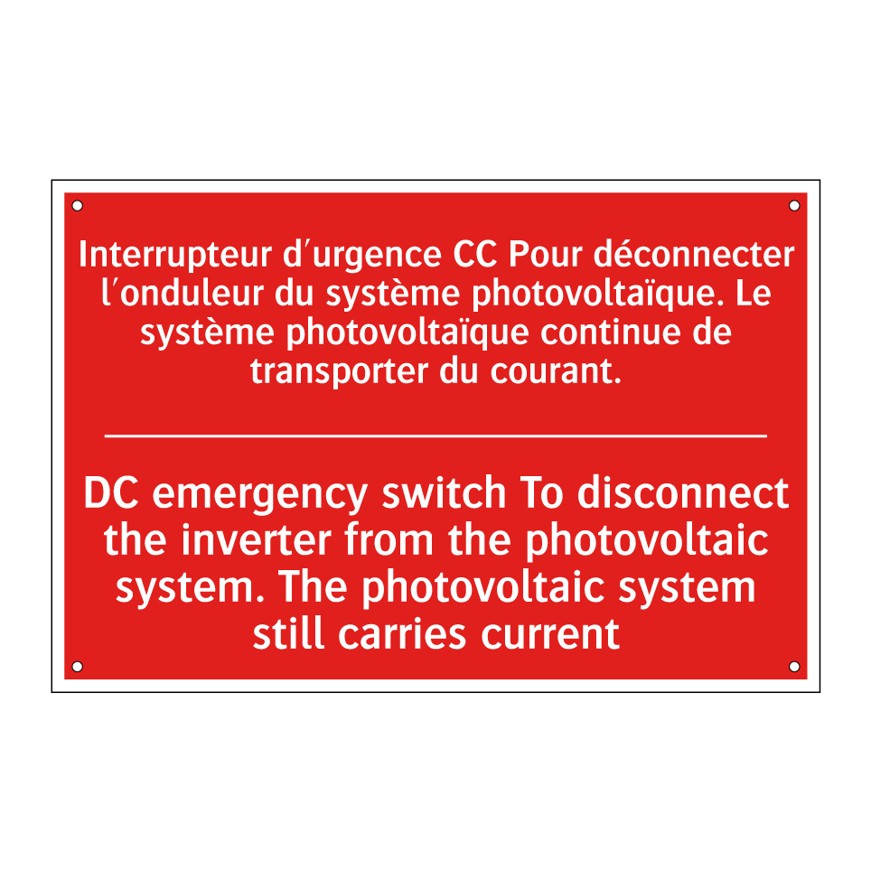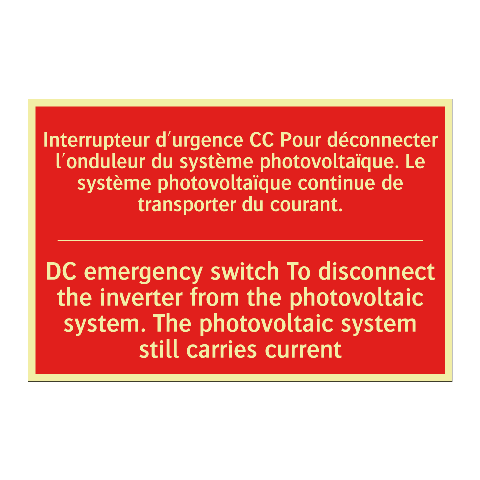Panneau de signalisation incendie bilingue avec texte en français : "Interrupteur d'urgence CC Pour déconnecter l'onduleur du système photovoltaïque. Le système photovoltaïque continue de transporter du courant.", et en anglais : "DC emergency switch To disconnect the inverter from the photovoltaic system. The photovoltaic system still carries current"