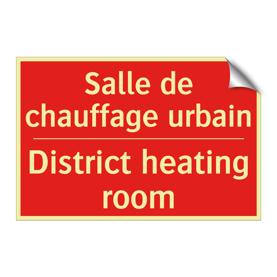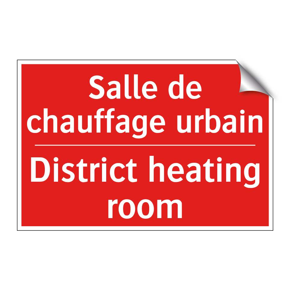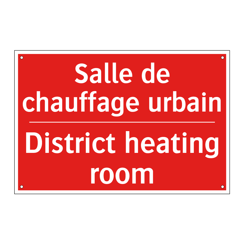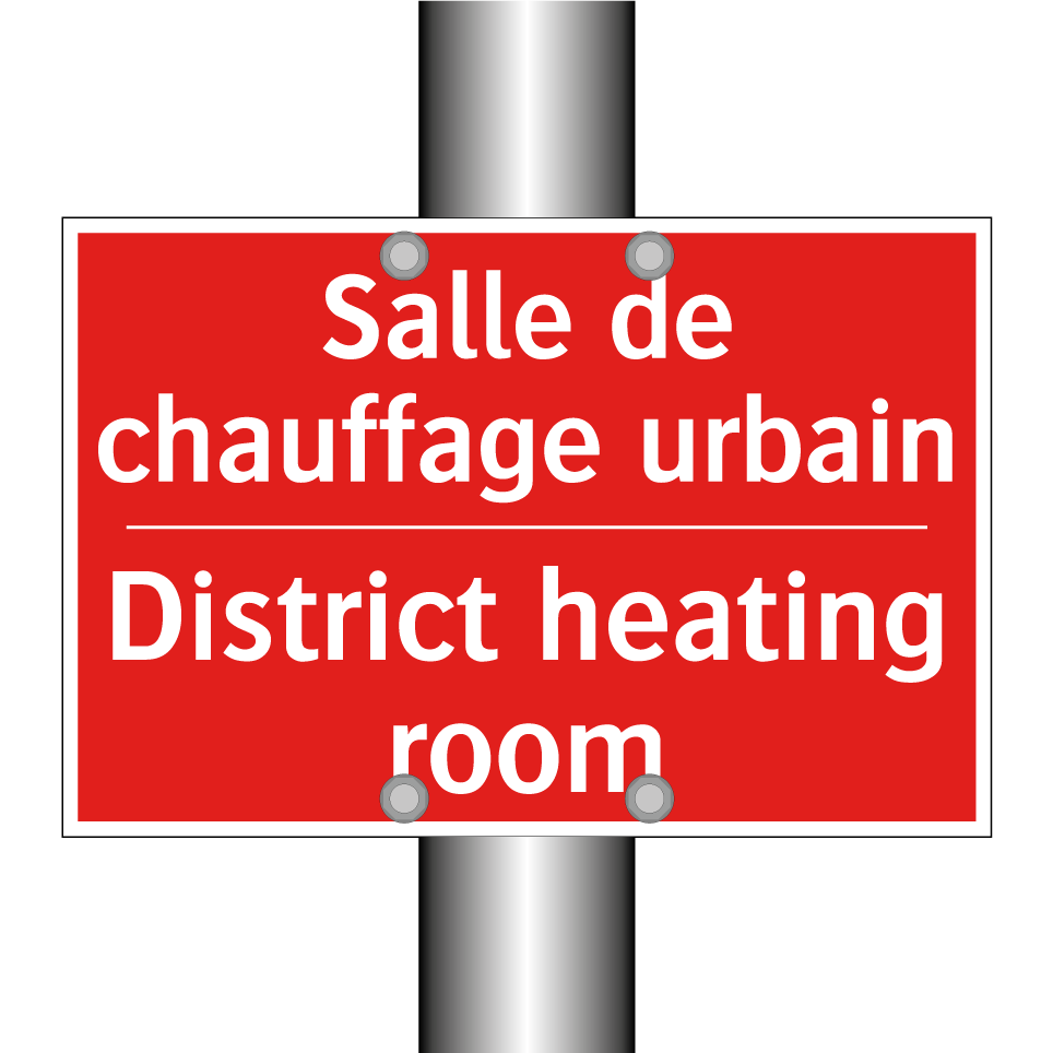 Panneau de signalisation incendie bilingue avec texte en français : "Salle de chauffage urbain", et en anglais : "District heating room"