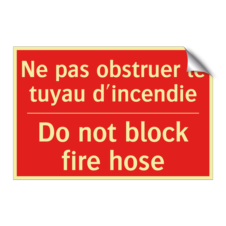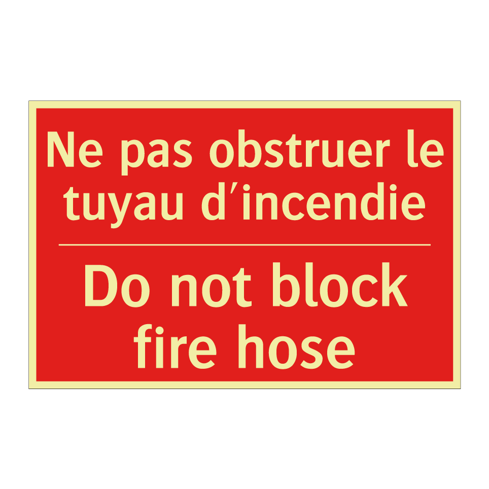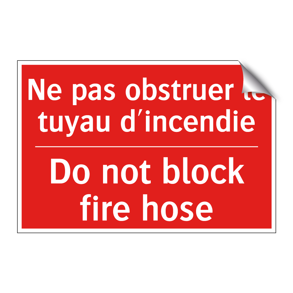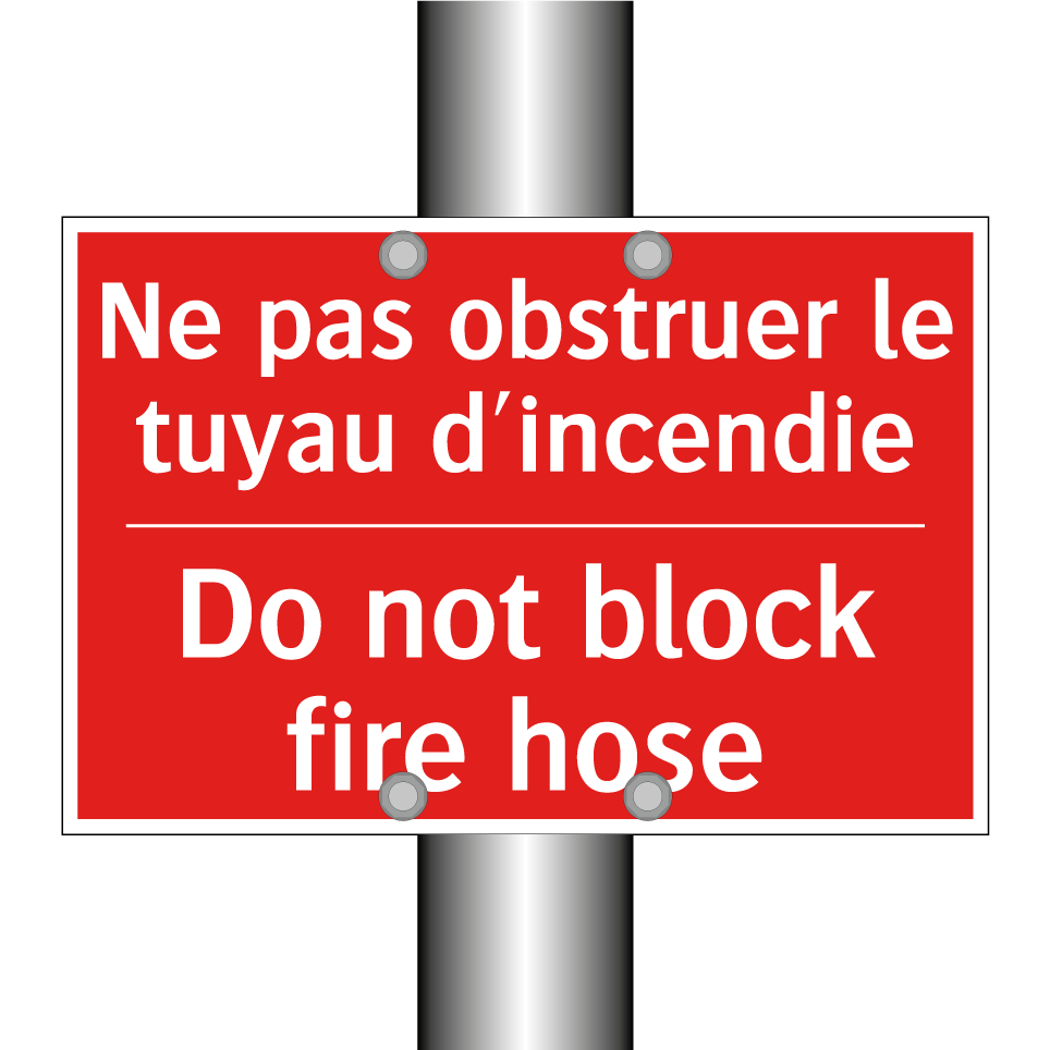 Panneau de signalisation incendie bilingue avec texte en français : "Ne pas obstruer le tuyau d'incendie", et en anglais : "Do not block fire hose"