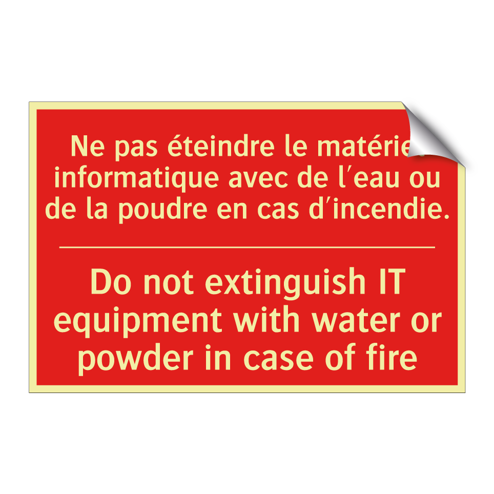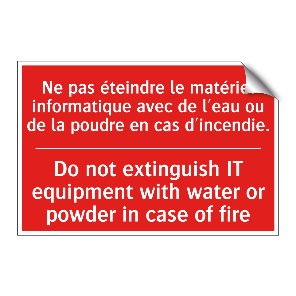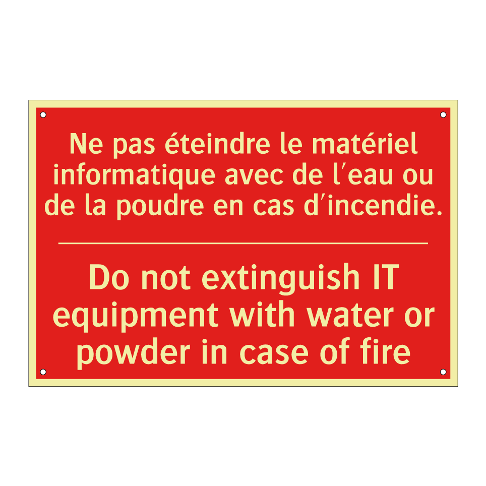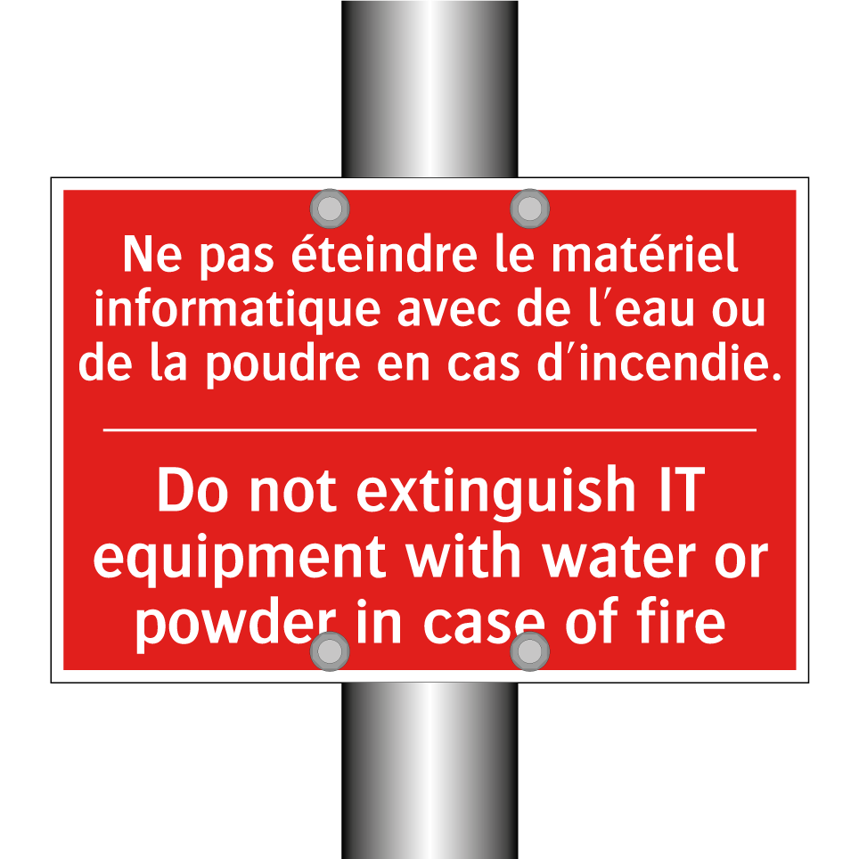 Panneau de signalisation incendie bilingue avec texte en français : "Ne pas éteindre le matériel informatique avec de l'eau ou de la poudre en cas d'incendie.", et en anglais : "Do not extinguish IT equipment with water or powder in case of fire"