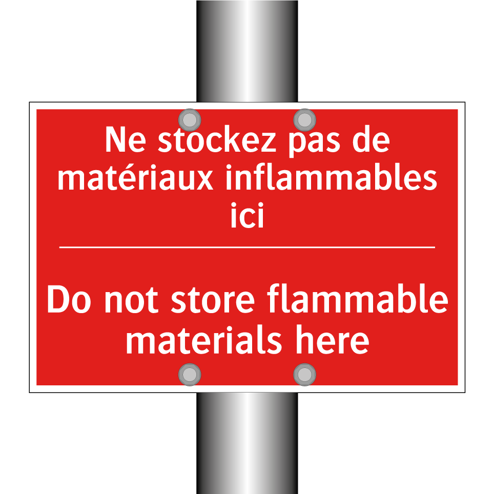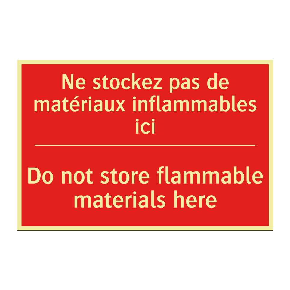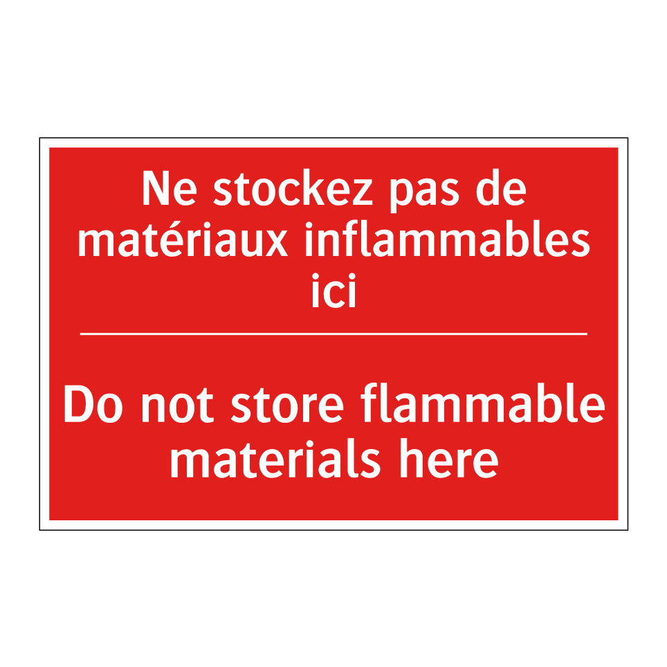 Panneau de signalisation incendie bilingue avec texte en français : "Ne stockez pas de matériaux inflammables ici", et en anglais : "Do not store flammable materials here"