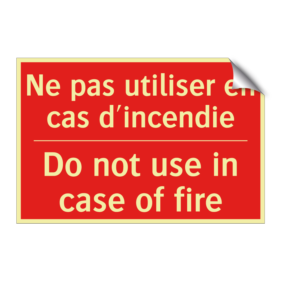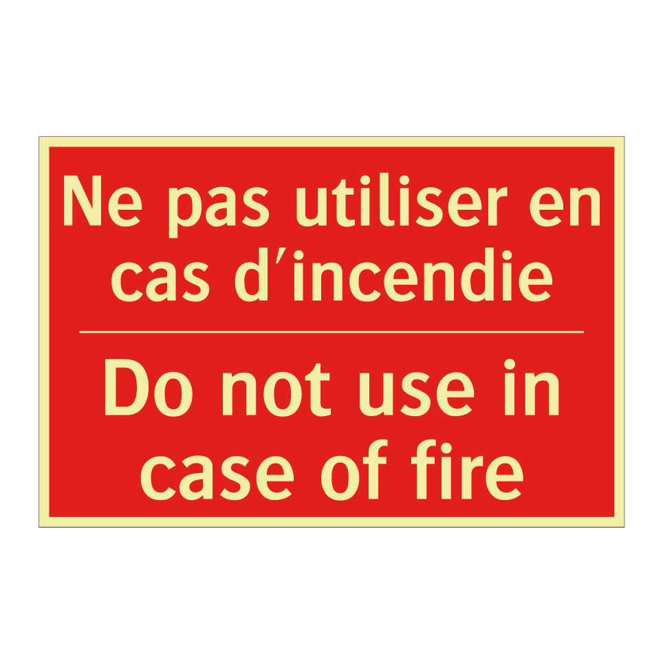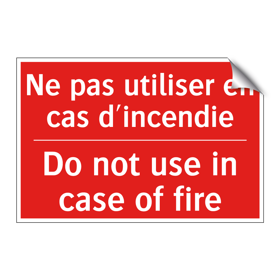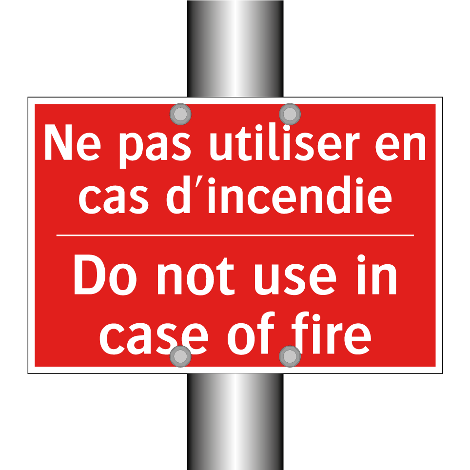 Panneau de signalisation incendie bilingue avec texte en français : "Ne pas utiliser en cas d'incendie", et en anglais : "Do not use in case of fire"
