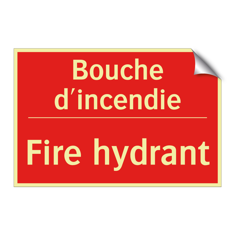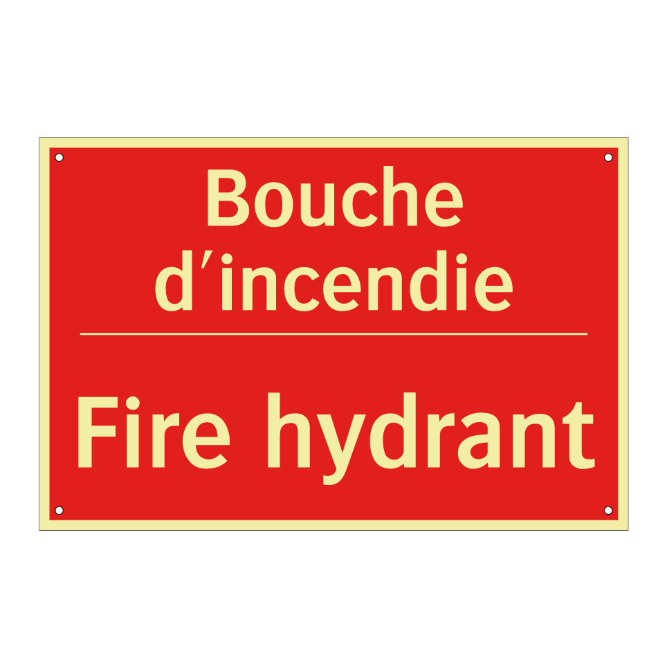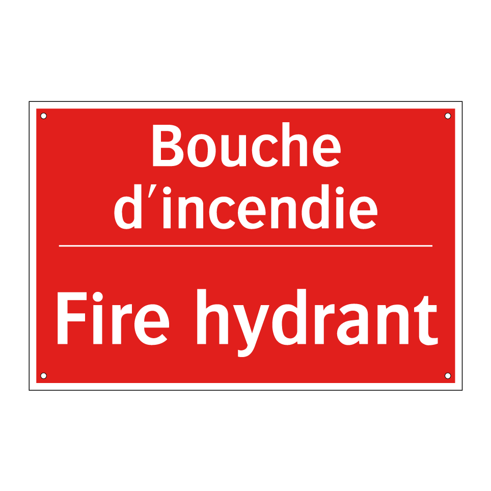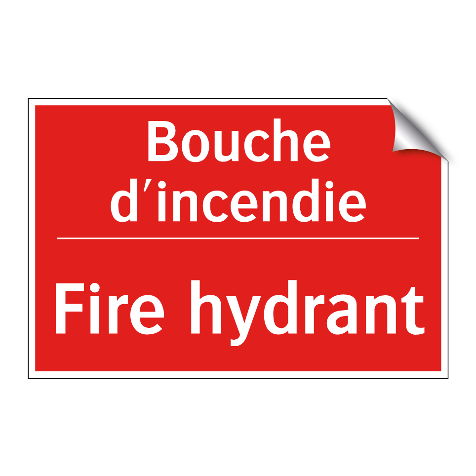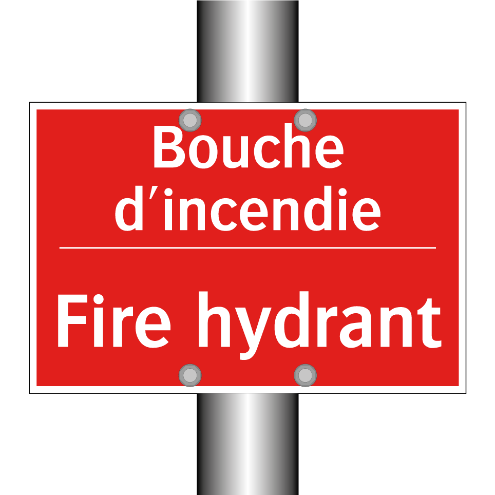 Panneau de signalisation incendie bilingue avec texte en français : "Bouche d'incendie", et en anglais : "Fire hydrant"