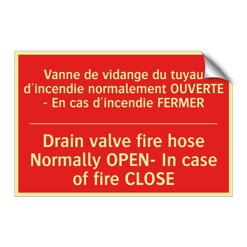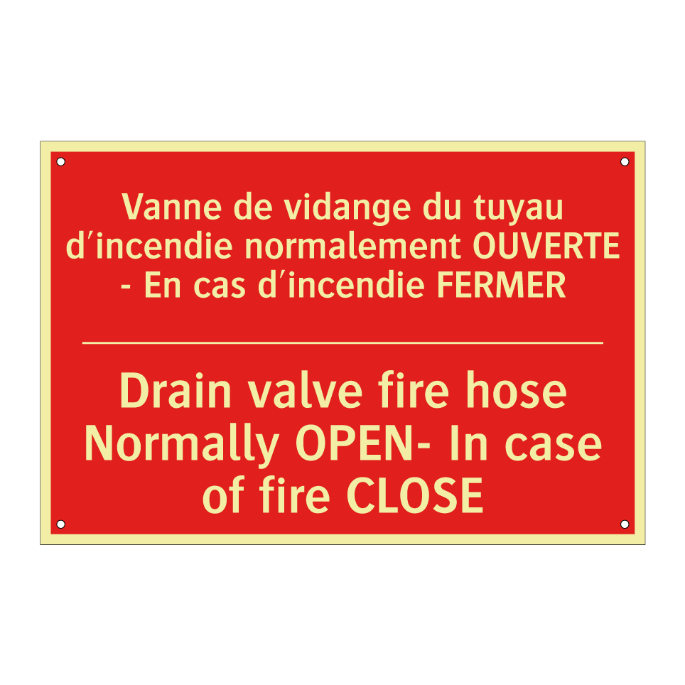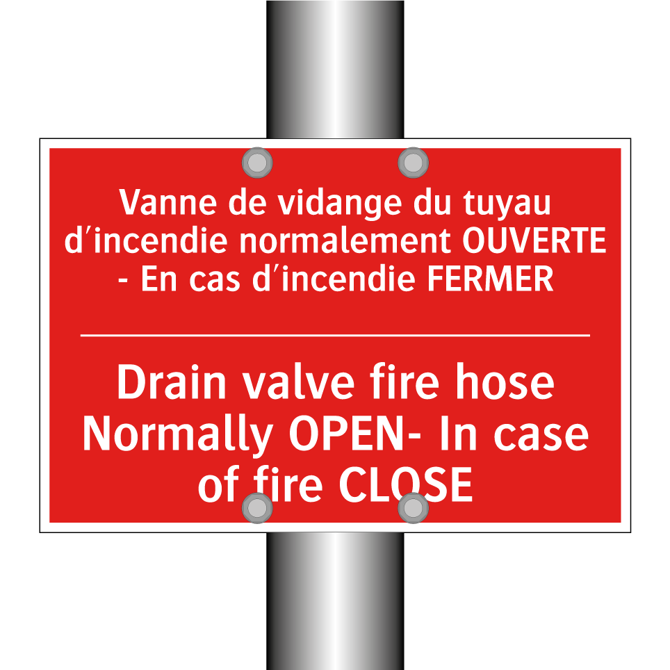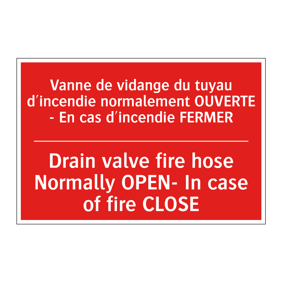 Panneau de signalisation incendie bilingue avec texte en français : "Vanne de vidange du tuyau d'incendie normalement OUVERTE - En cas d'incendie FERMER", et en anglais : "Drain valve fire hose Normally OPEN- In case of fire CLOSE"