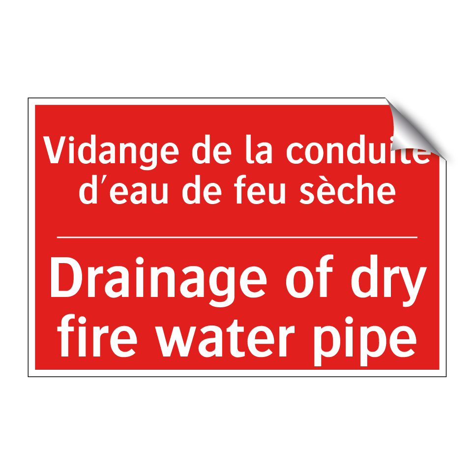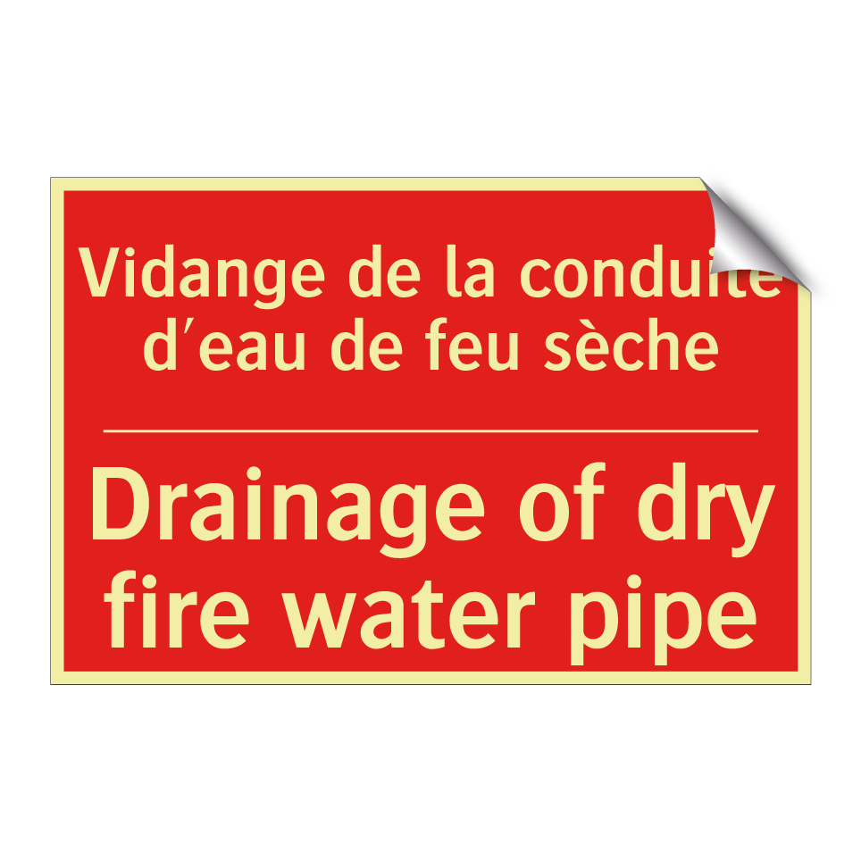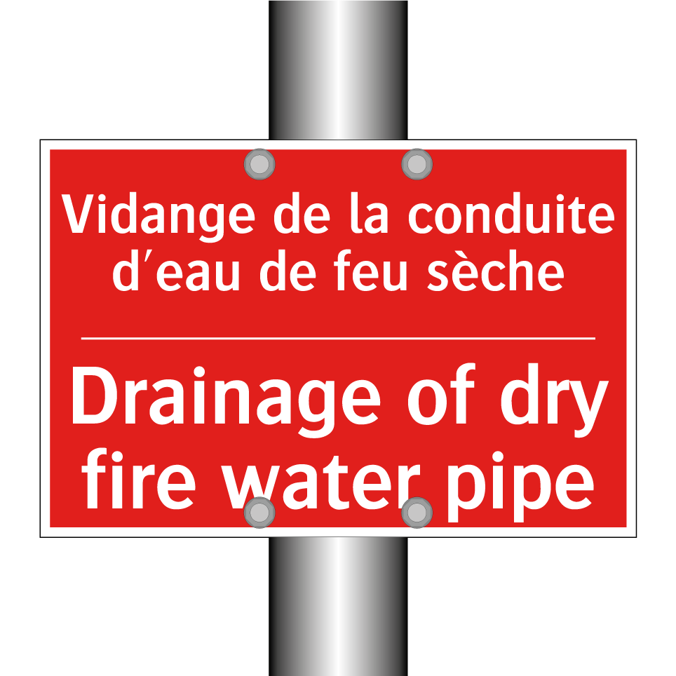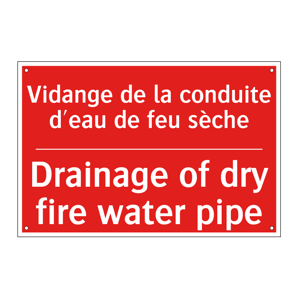 Panneau de signalisation incendie bilingue avec texte en français : "Vidange de la conduite d'eau de feu sèche", et en anglais : "Drainage of dry fire water pipe"