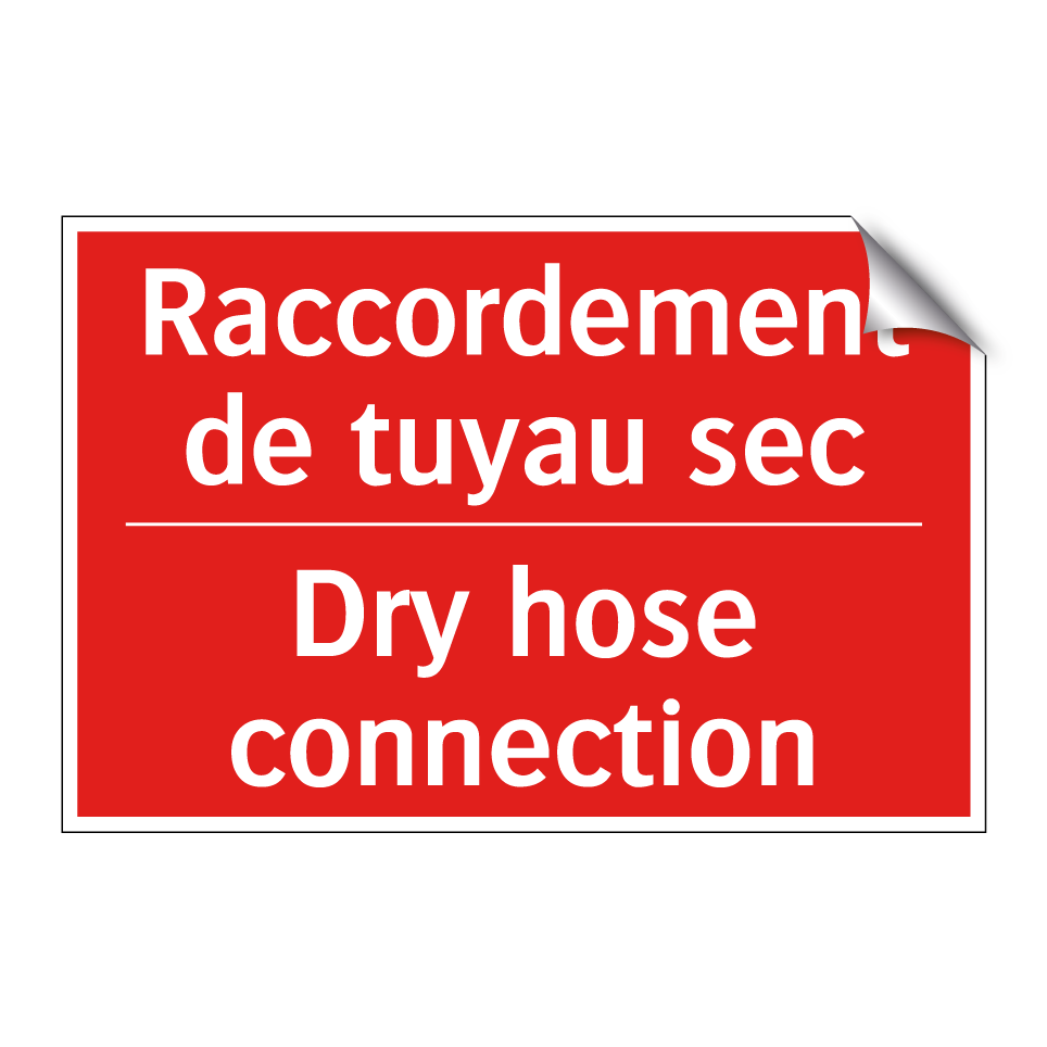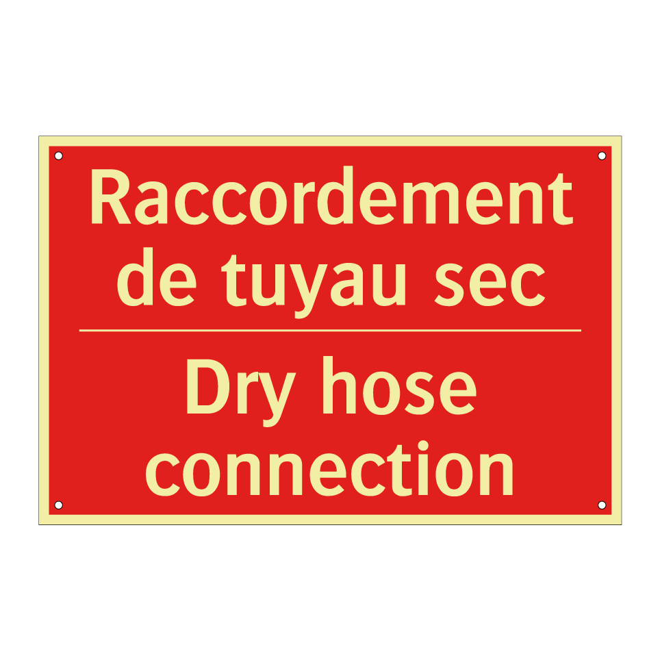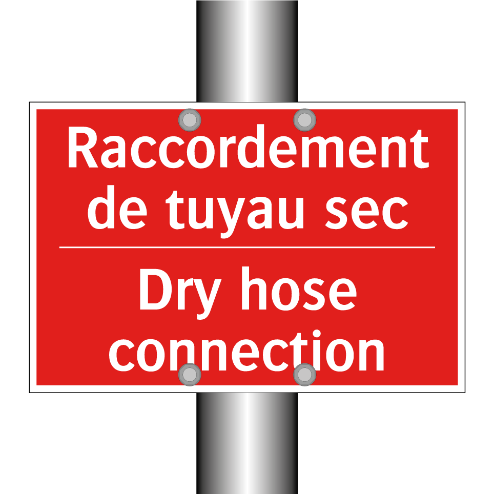 Panneau de signalisation incendie bilingue avec texte en français : "Raccordement de tuyau sec", et en anglais : "Dry hose connection"