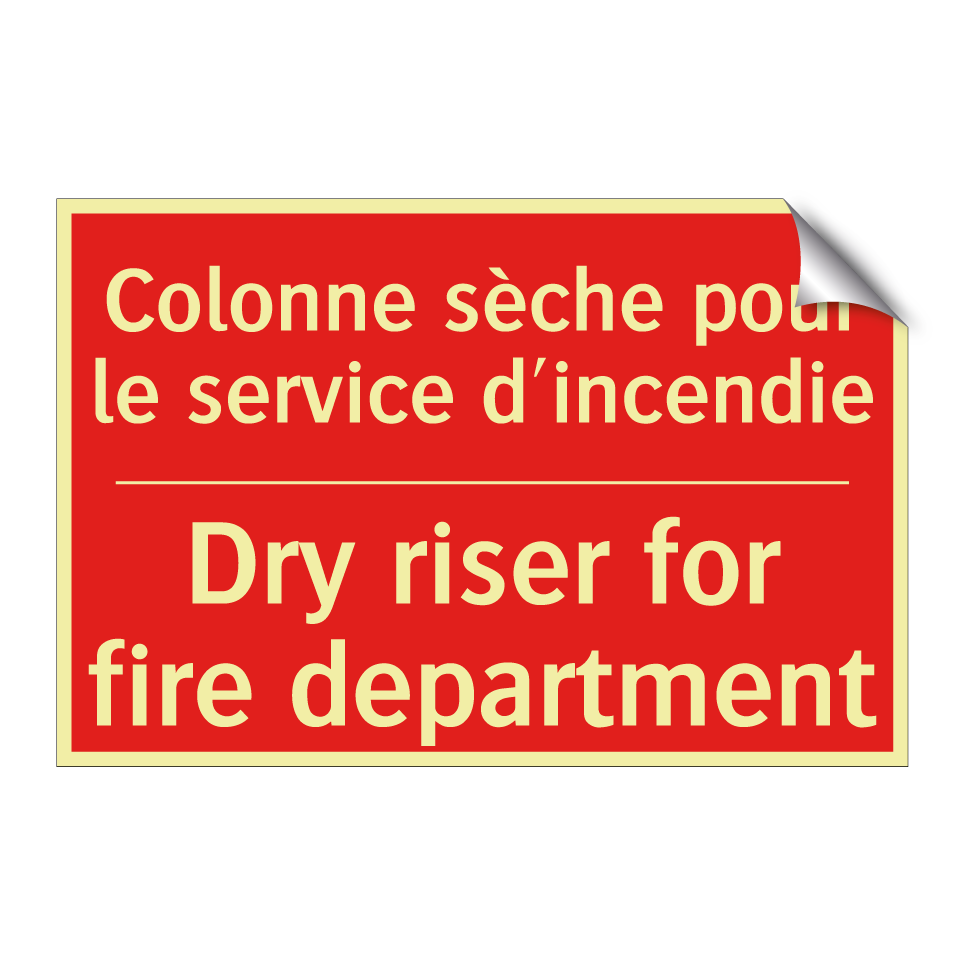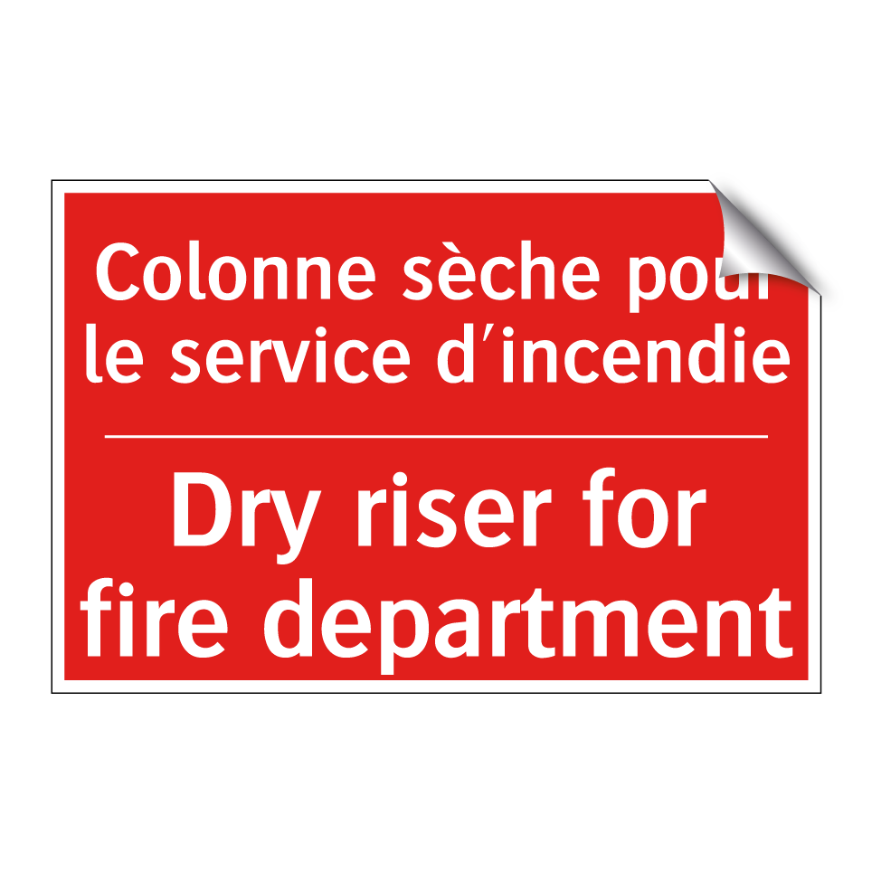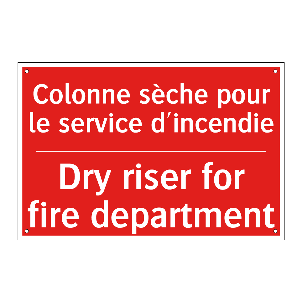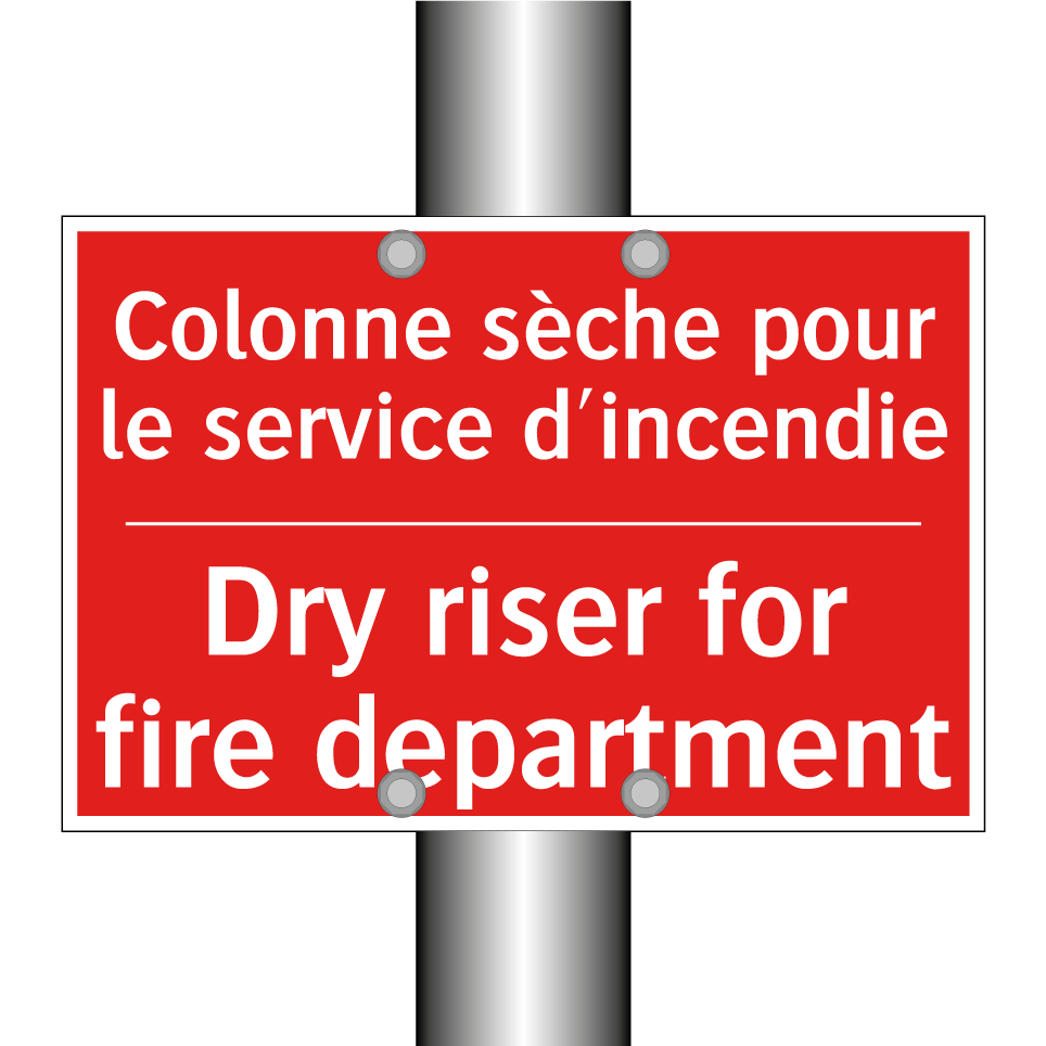 Panneau de signalisation incendie bilingue avec texte en français : "Colonne sèche pour le service d'incendie", et en anglais : "Dry riser for fire department"