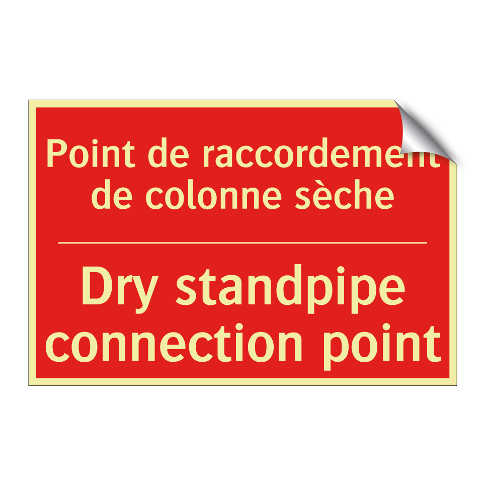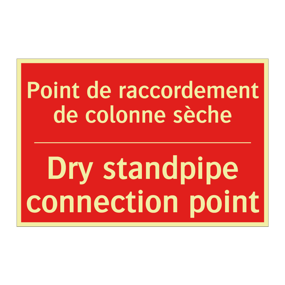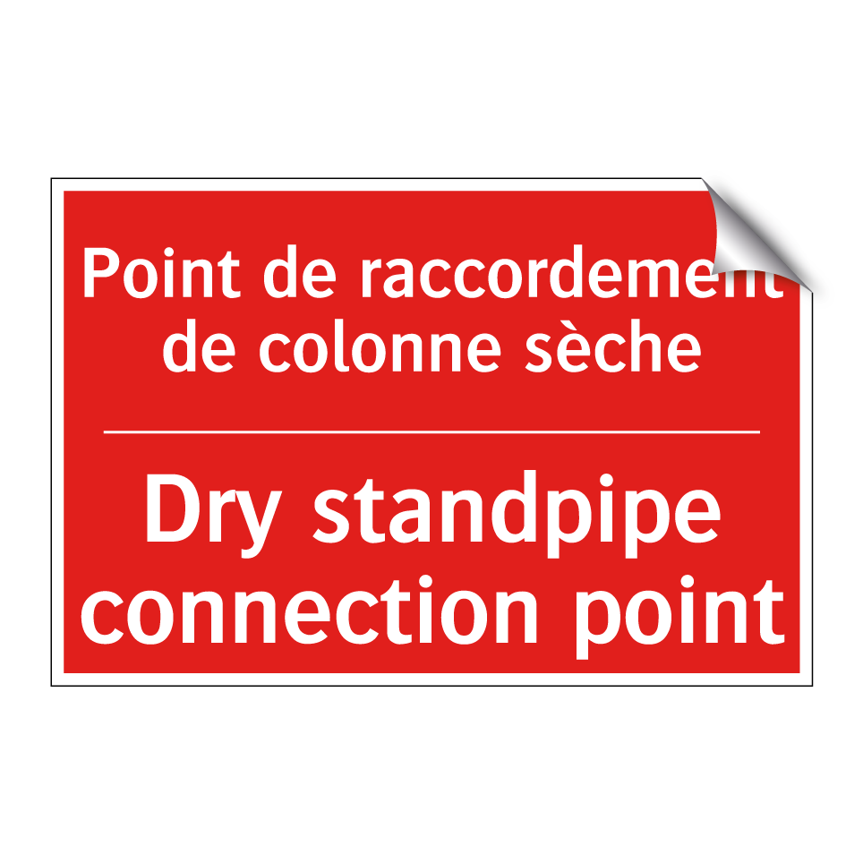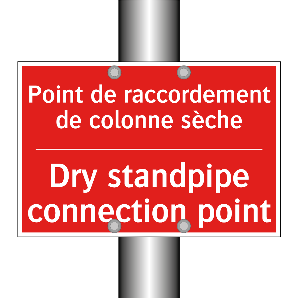 Panneau de signalisation incendie bilingue avec texte en français : "Point de raccordement de colonne sèche", et en anglais : "Dry standpipe connection point"