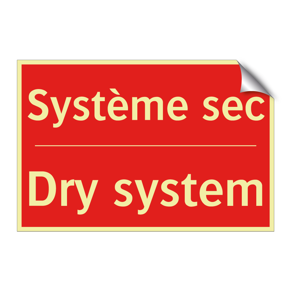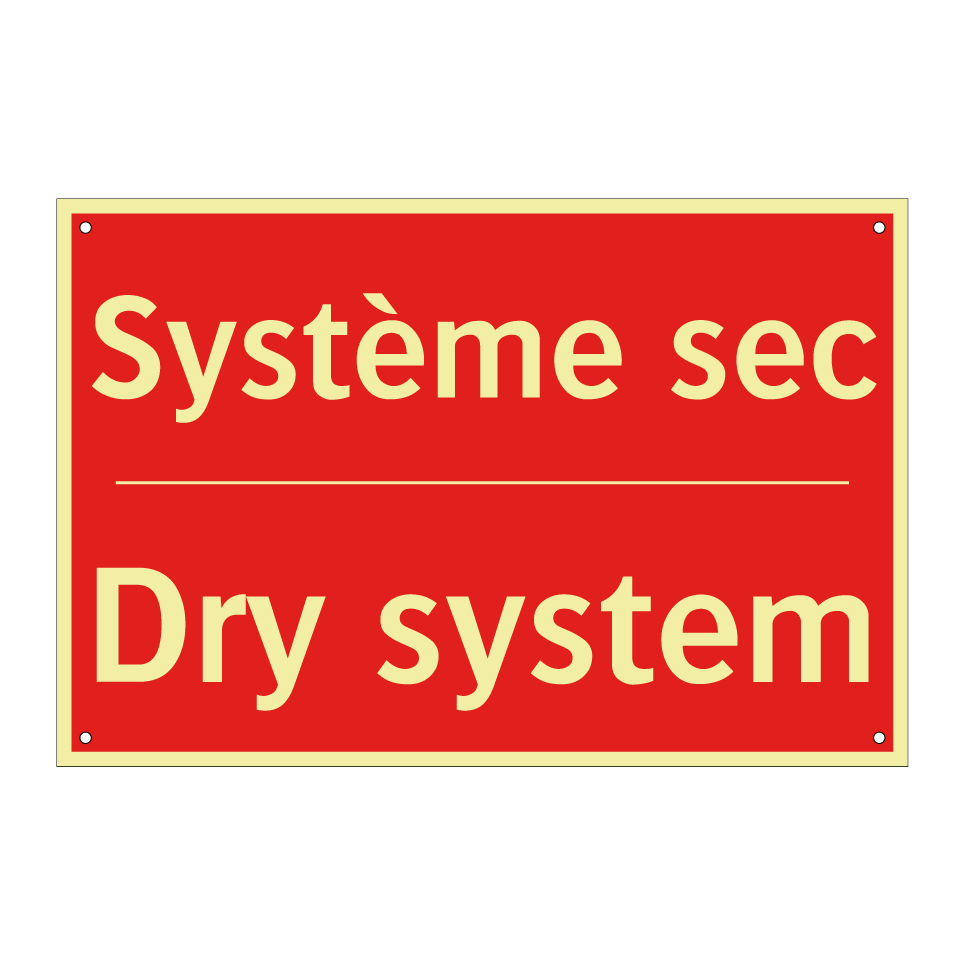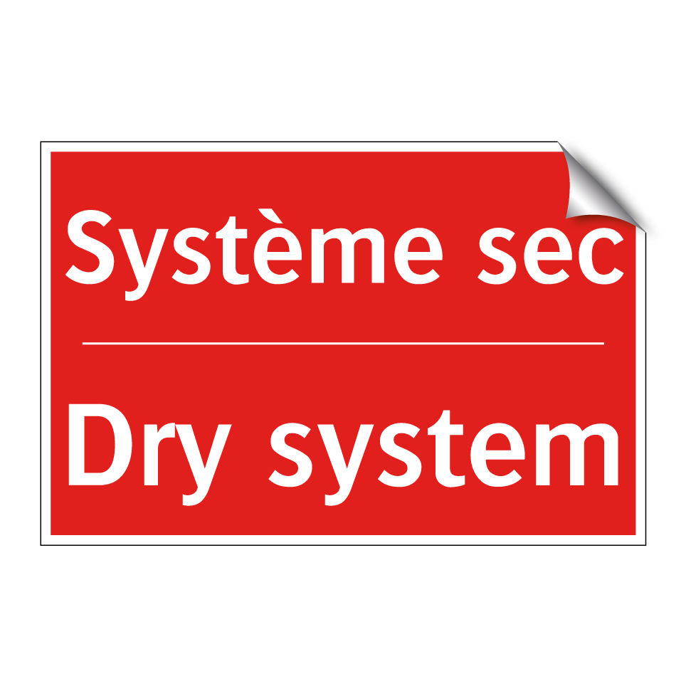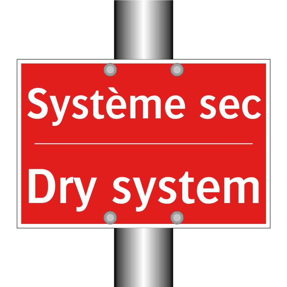 Panneau de signalisation incendie bilingue avec texte en français : "Système sec", et en anglais : "Dry system"