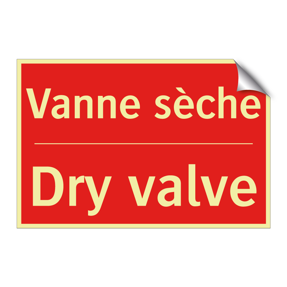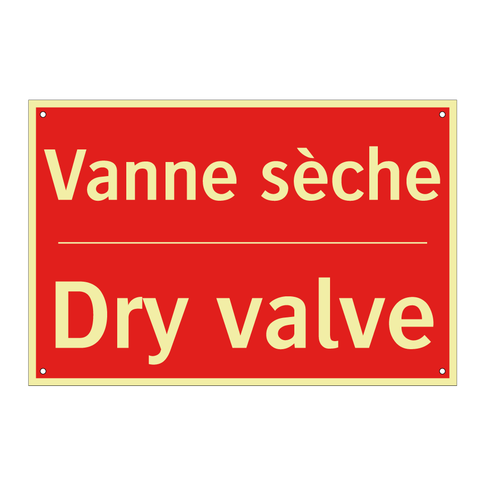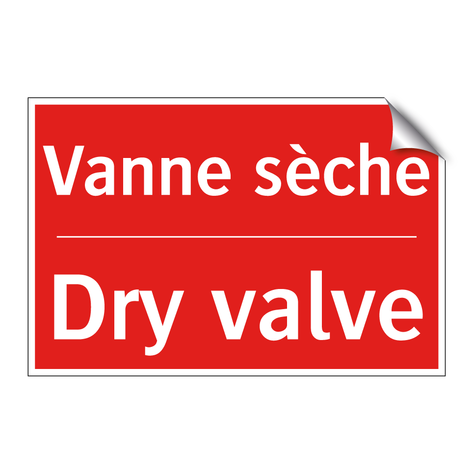 Panneau de signalisation incendie bilingue avec texte en français : "Vanne sèche", et en anglais : "Dry valve"