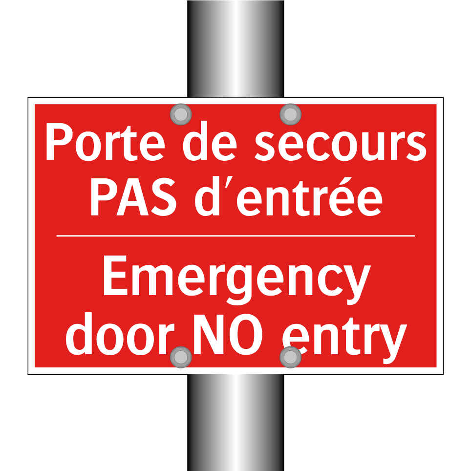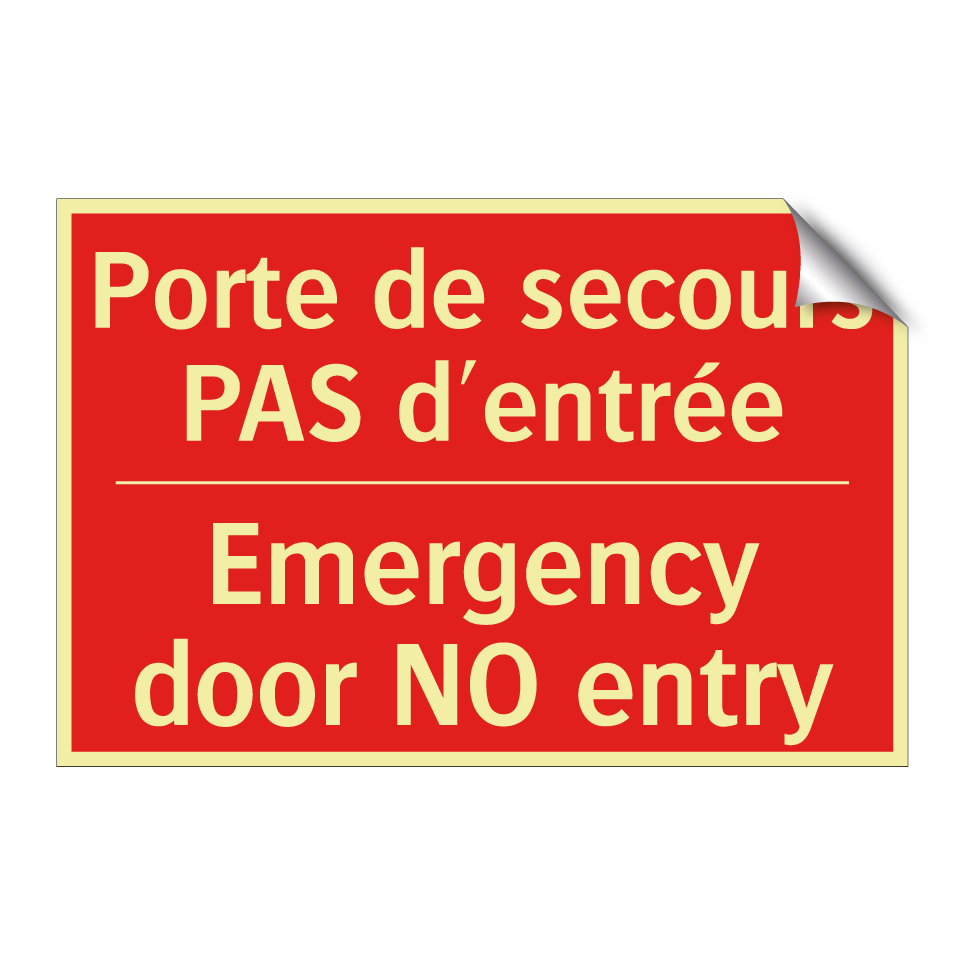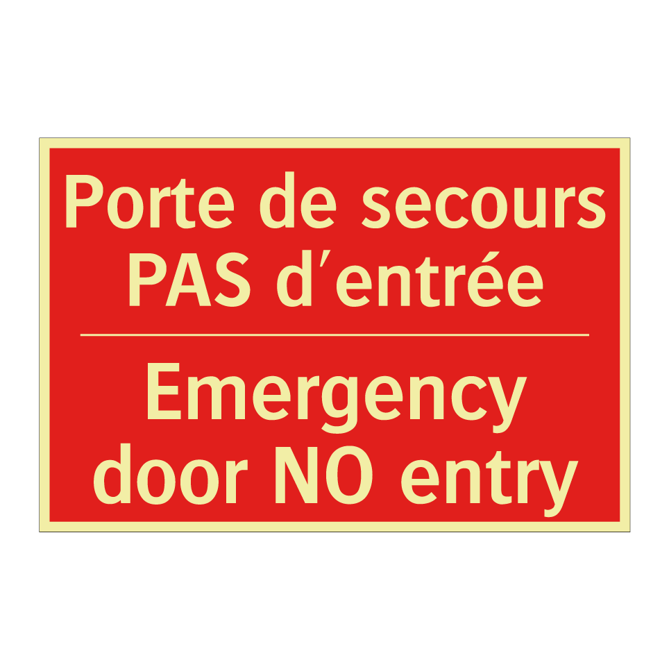 Panneau de signalisation incendie bilingue avec texte en français : "Porte de secours PAS d'entrée", et en anglais : "Emergency door NO entry"