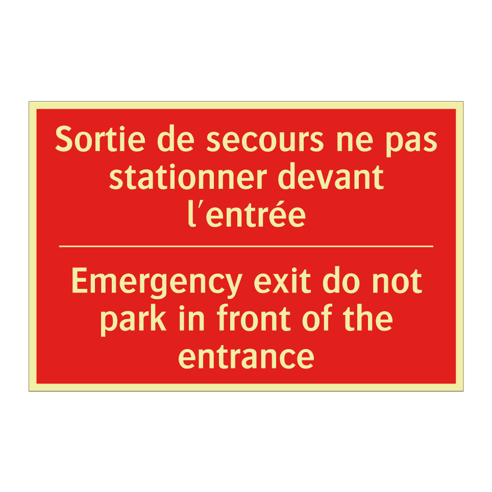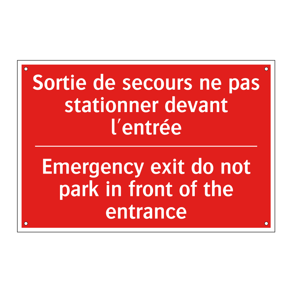 Panneau de signalisation incendie bilingue avec texte en français : "Sortie de secours ne pas stationner devant l'entrée", et en anglais : "Emergency exit do not park in front of the entrance"