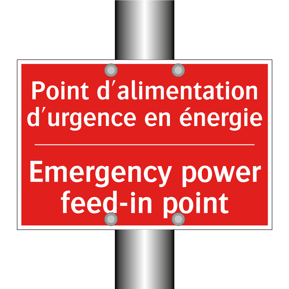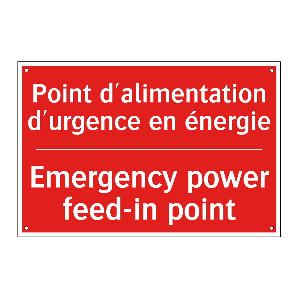Panneau de signalisation incendie bilingue avec texte en français : "Point d'alimentation d'urgence en énergie", et en anglais : "Emergency power feed-in point"