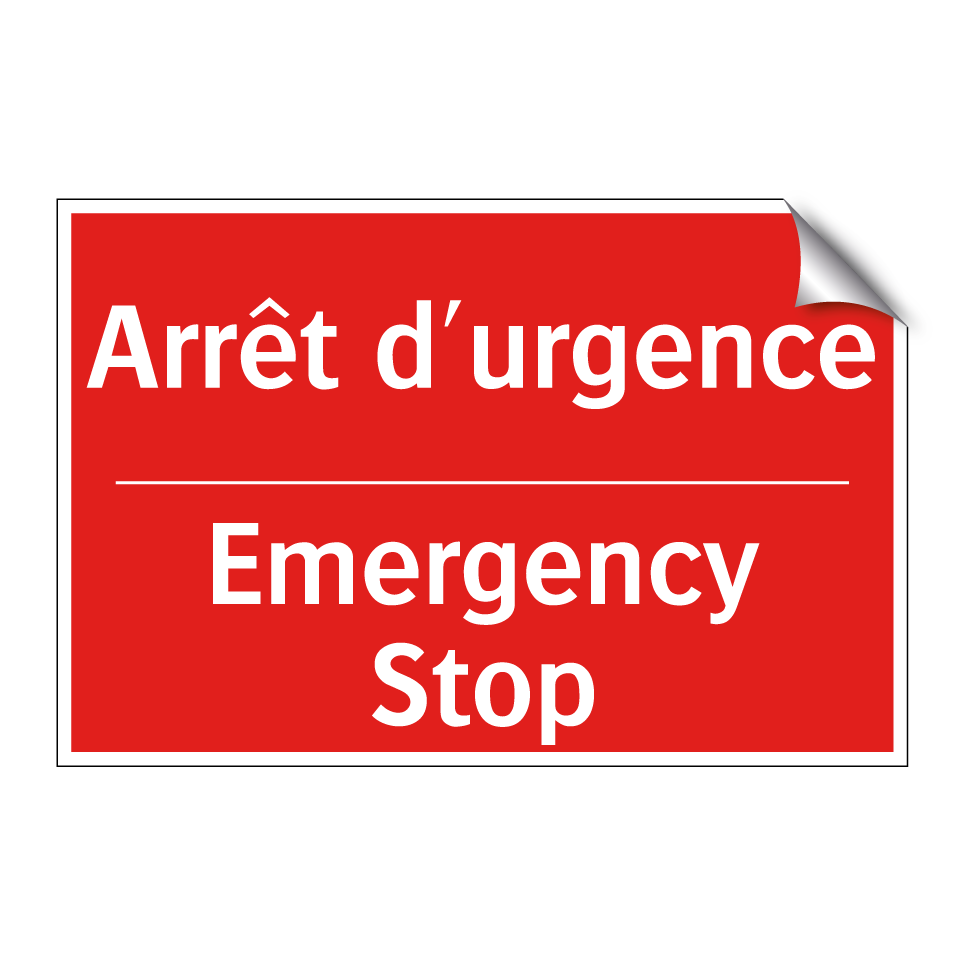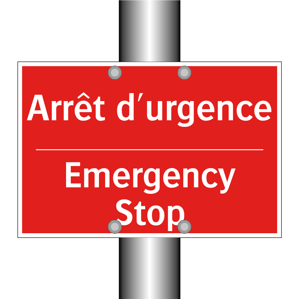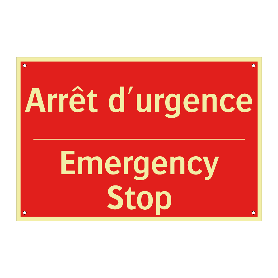 Panneau de signalisation incendie bilingue avec texte en français : "Arrêt d'urgence", et en anglais : "Emergency Stop"