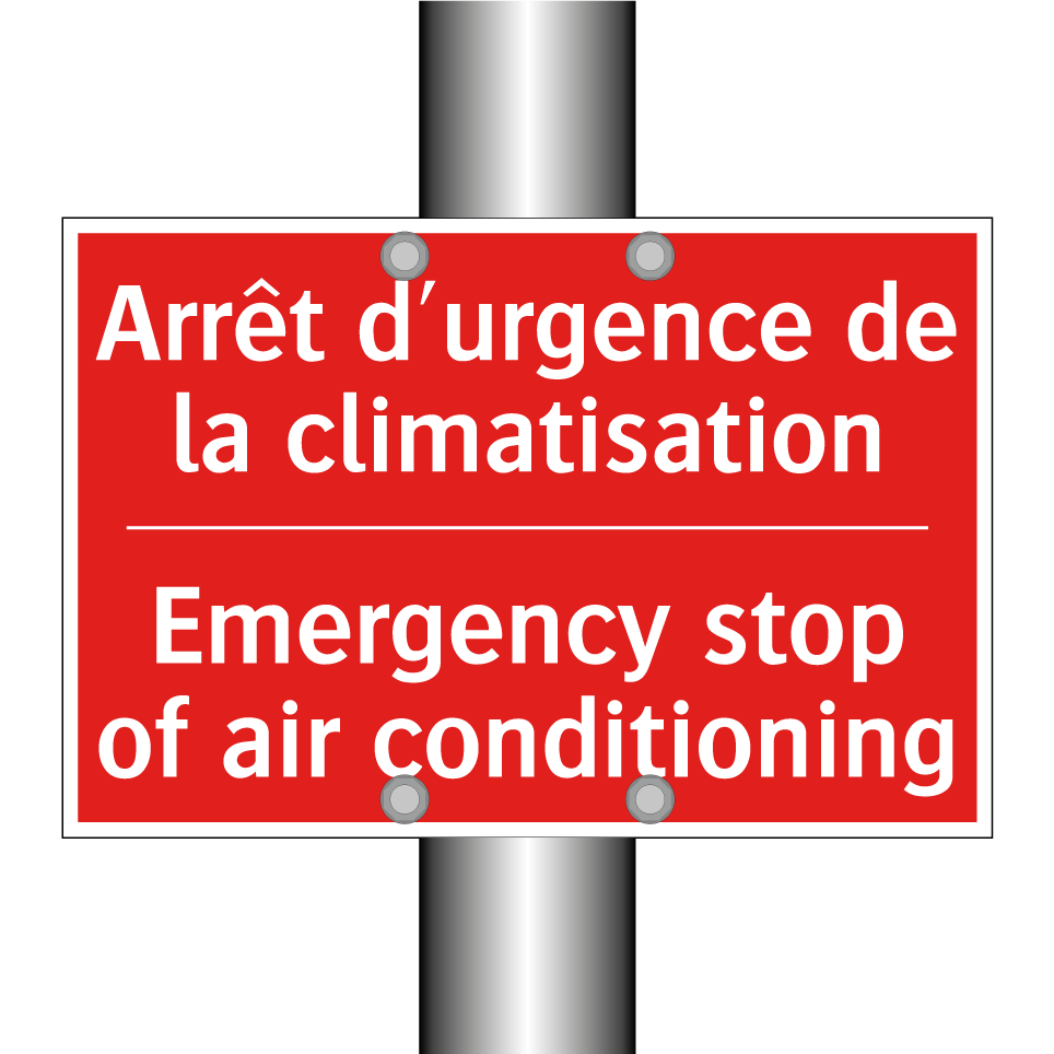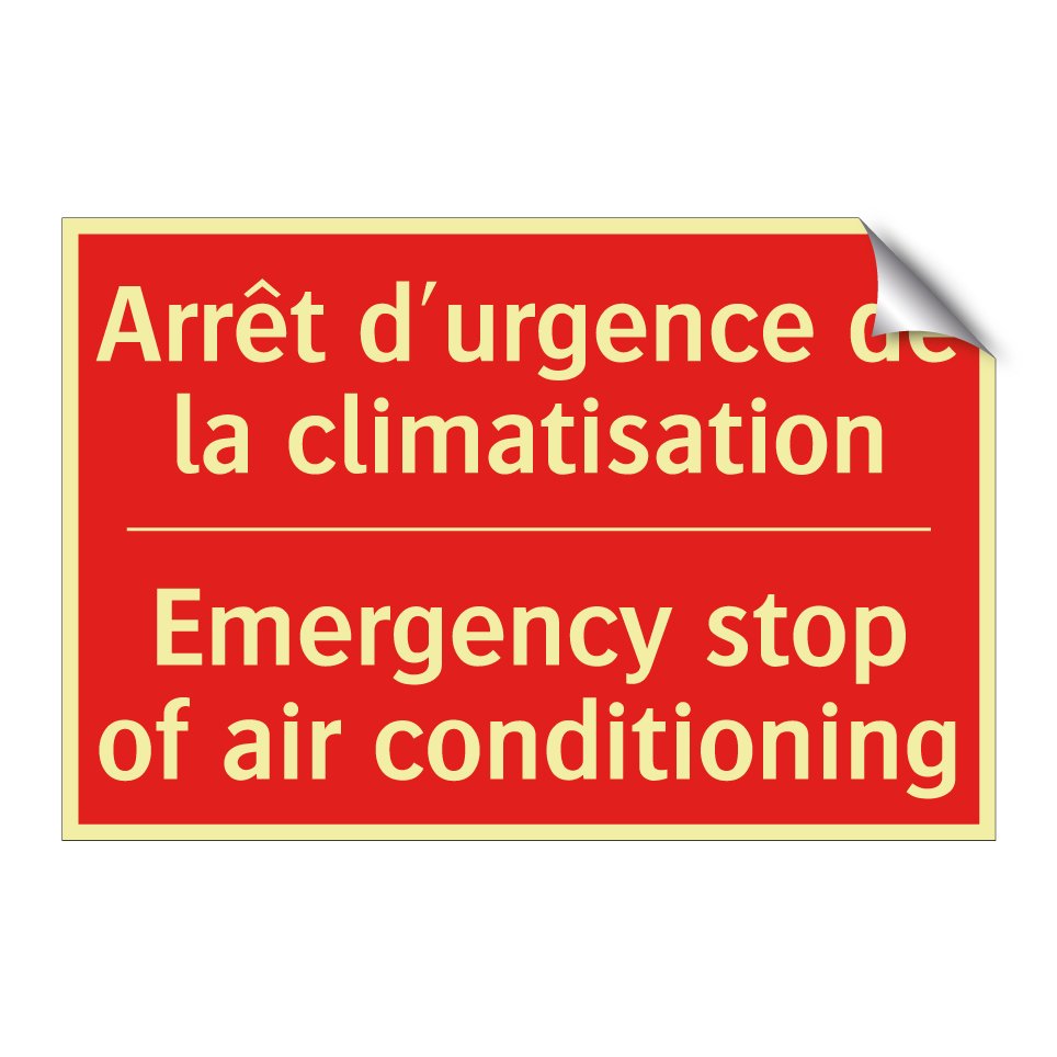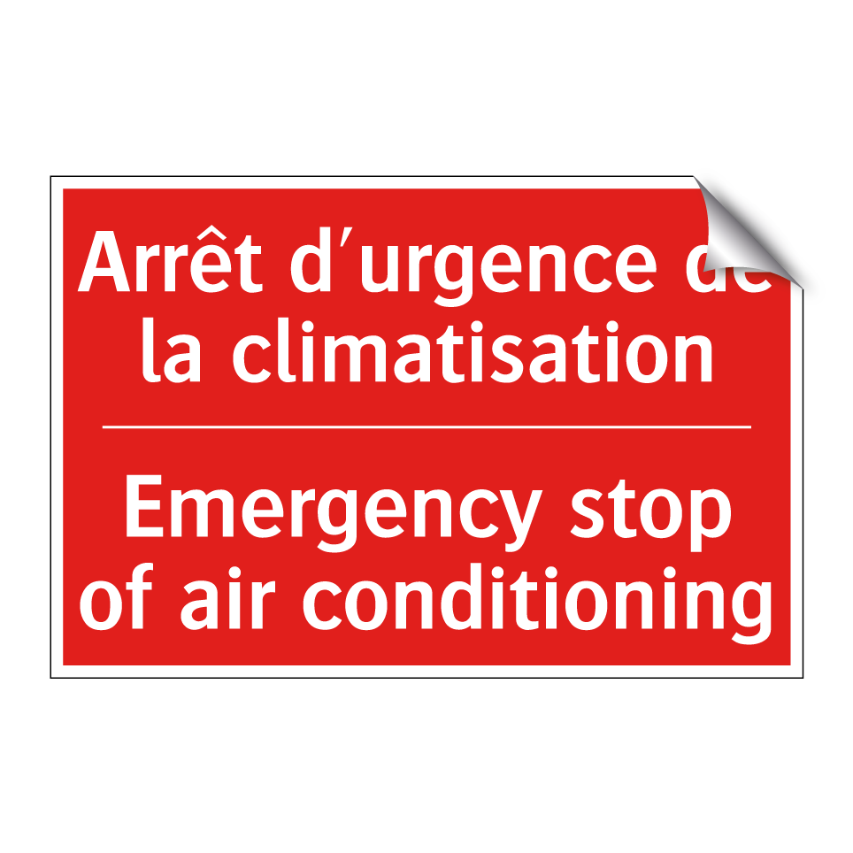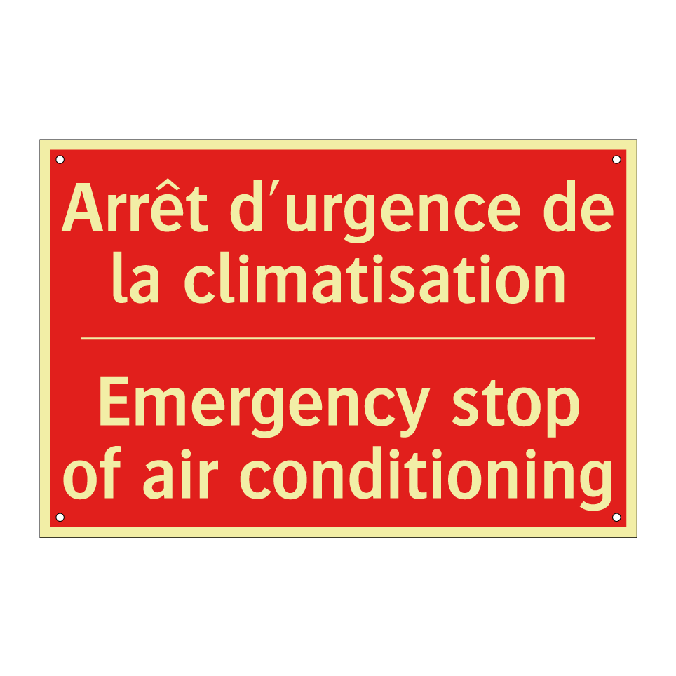 Panneau de signalisation incendie bilingue avec texte en français : "Arrêt d'urgence de la climatisation", et en anglais : "Emergency stop of air conditioning"