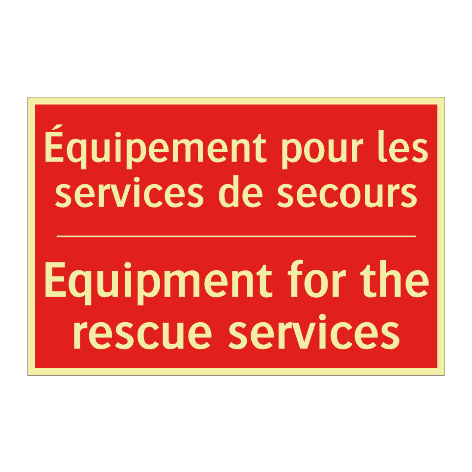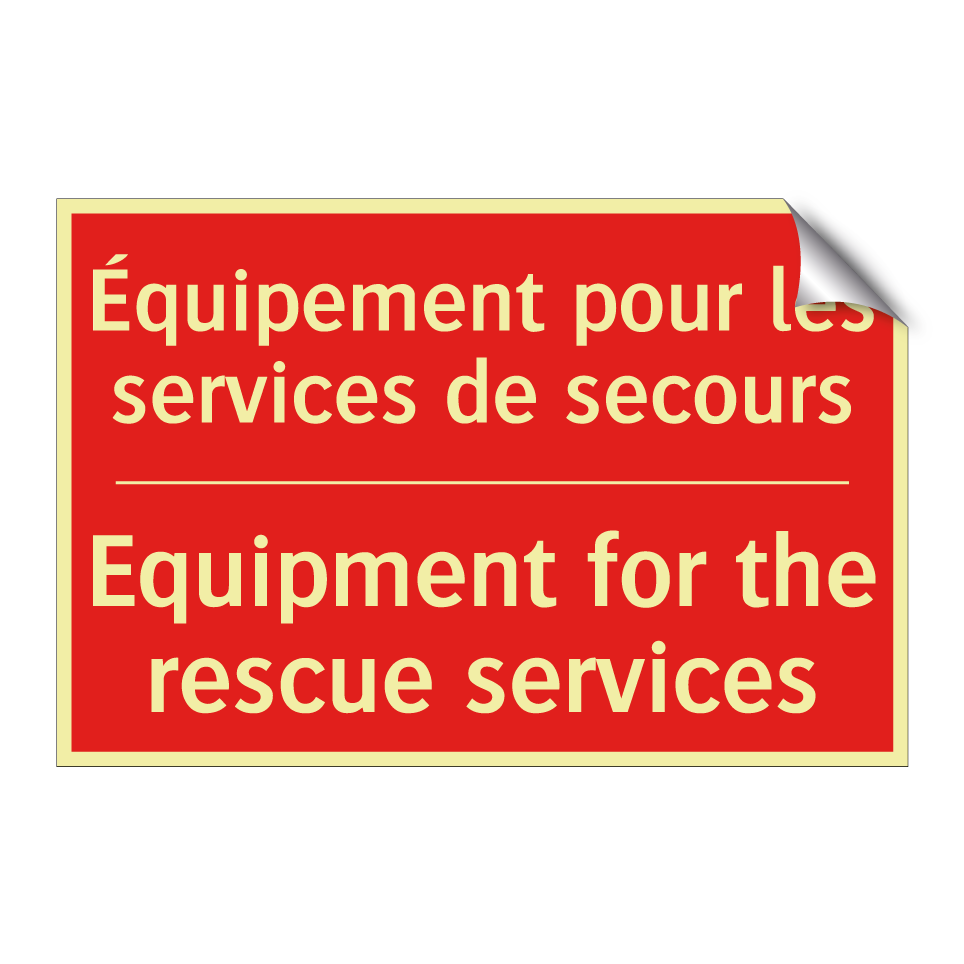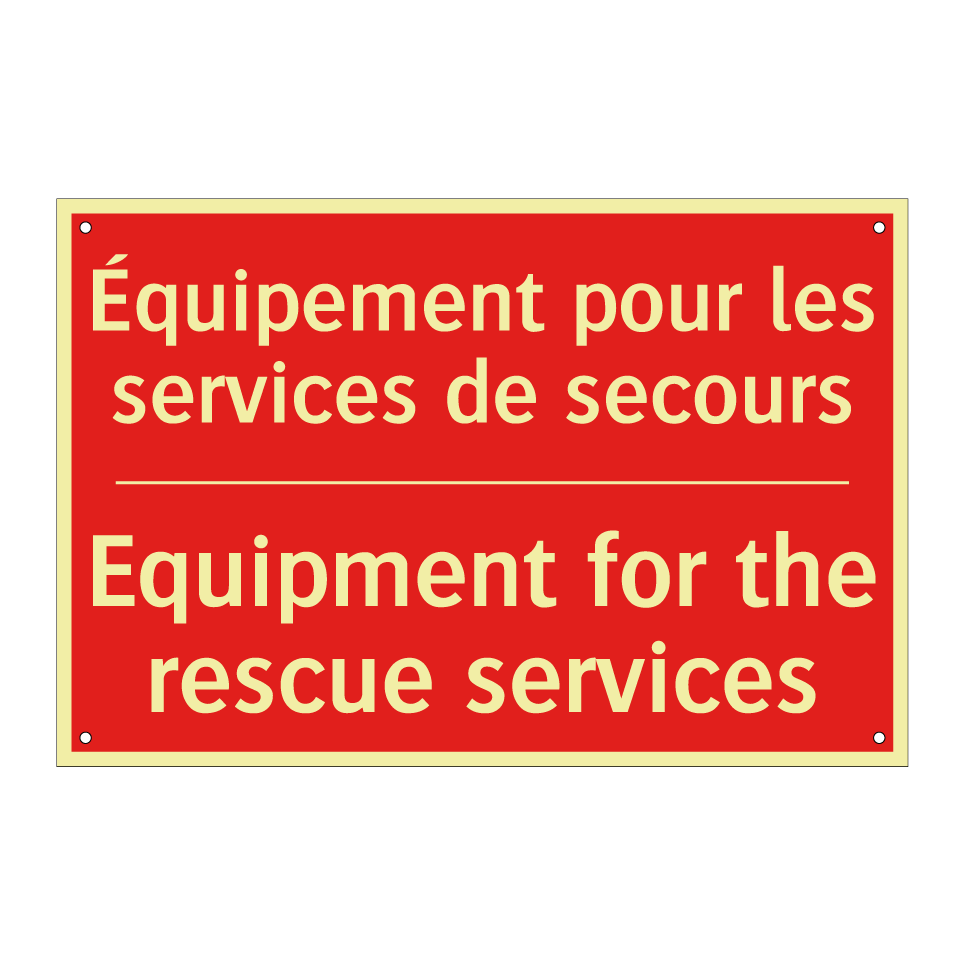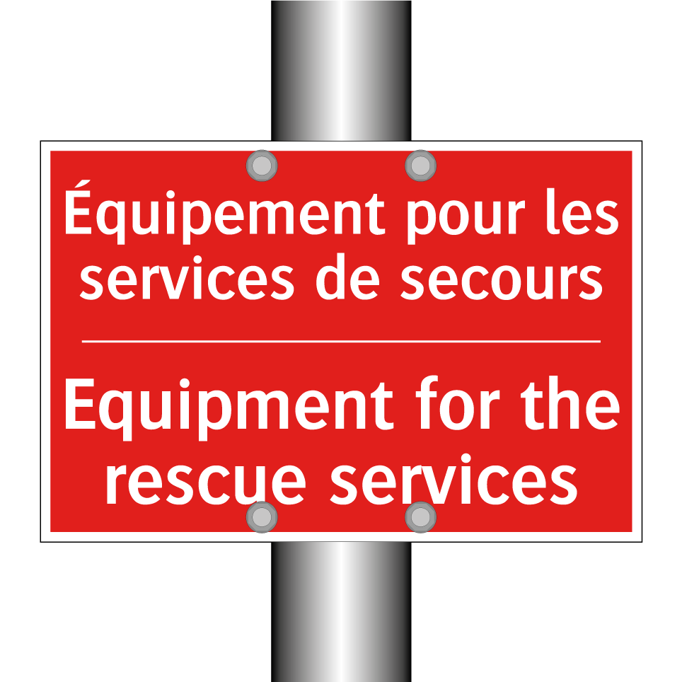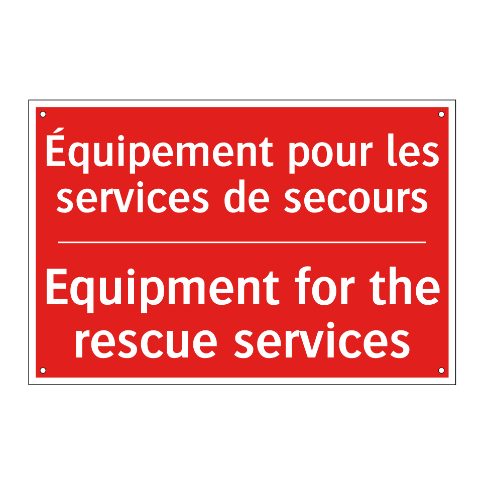 Panneau de signalisation incendie bilingue avec texte en français : "Équipement pour les services de secours", et en anglais : "Equipment for the rescue services"