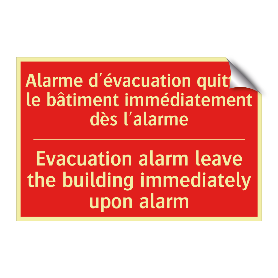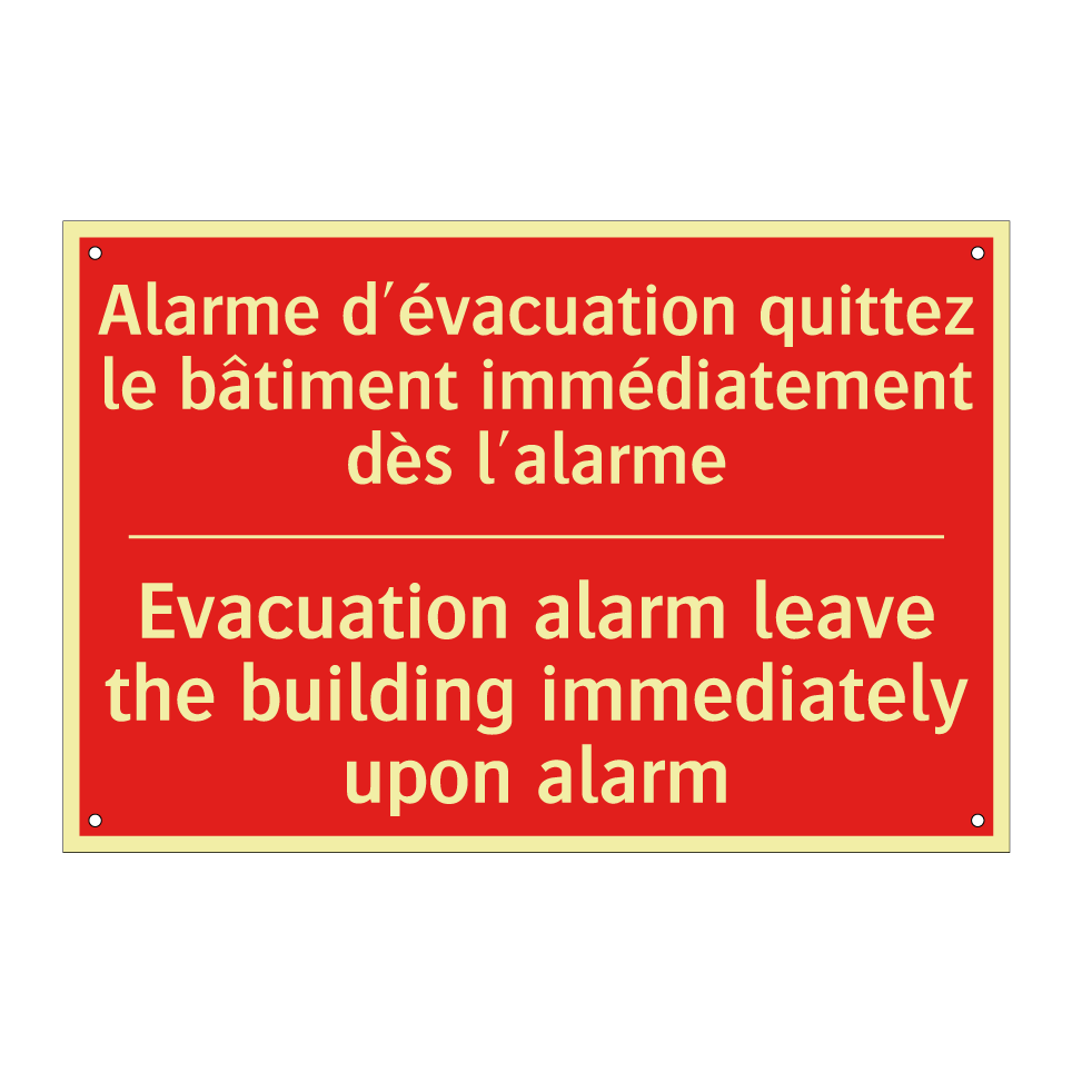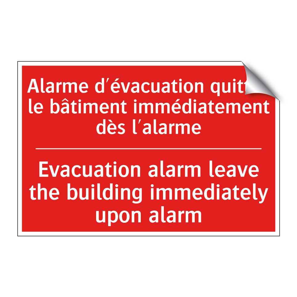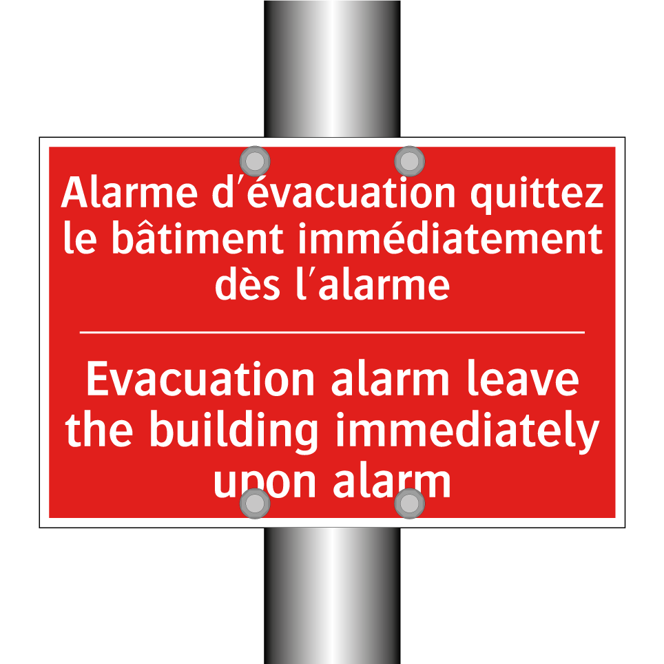 Panneau de signalisation incendie bilingue avec texte en français : "Alarme d'évacuation quittez le bâtiment immédiatement dès l'alarme", et en anglais : "Evacuation alarm leave the building immediately upon alarm"