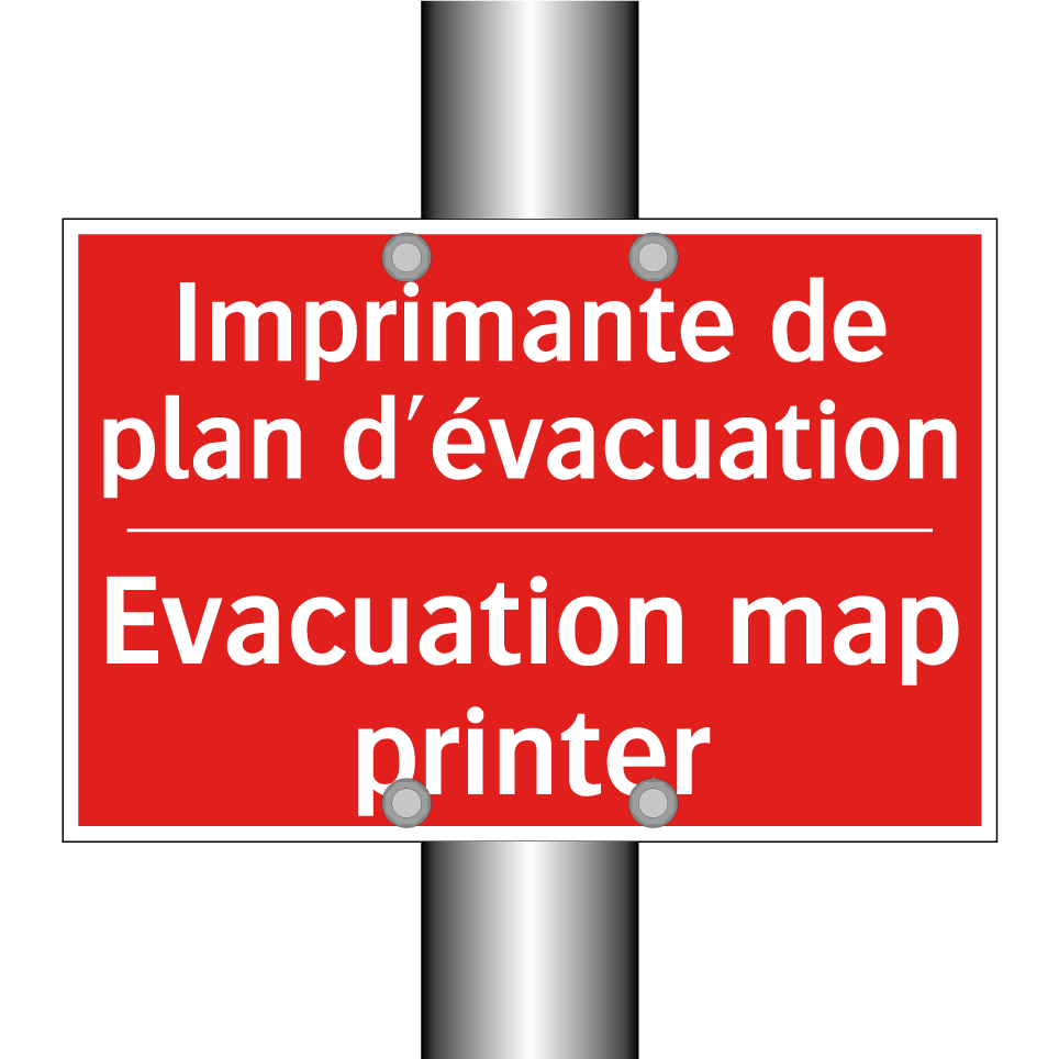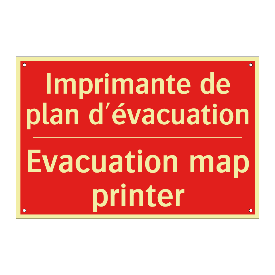 Panneau de signalisation incendie bilingue avec texte en français : "Imprimante de plan d'évacuation", et en anglais : "Evacuation map printer"