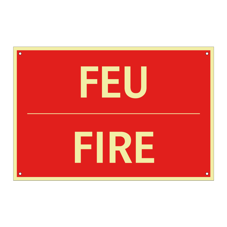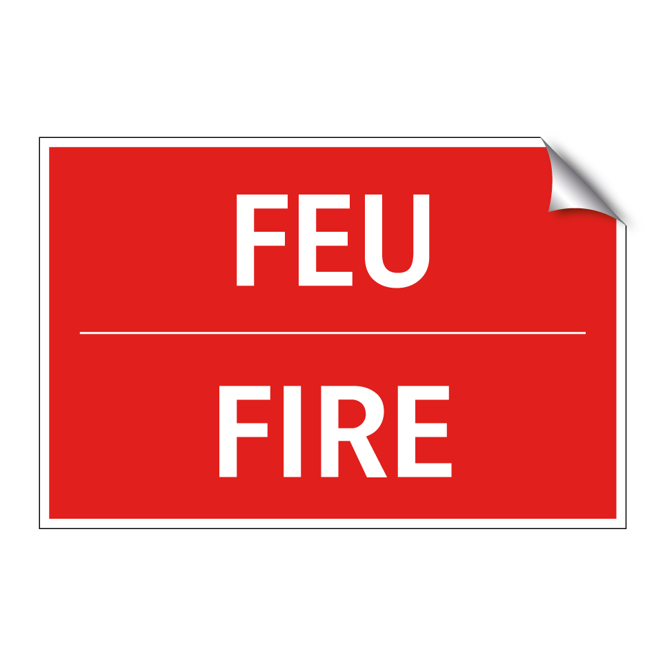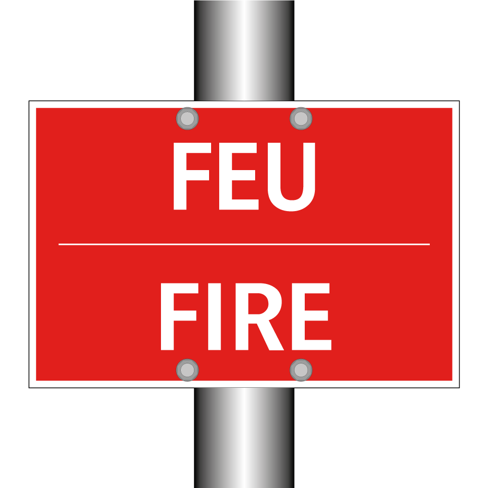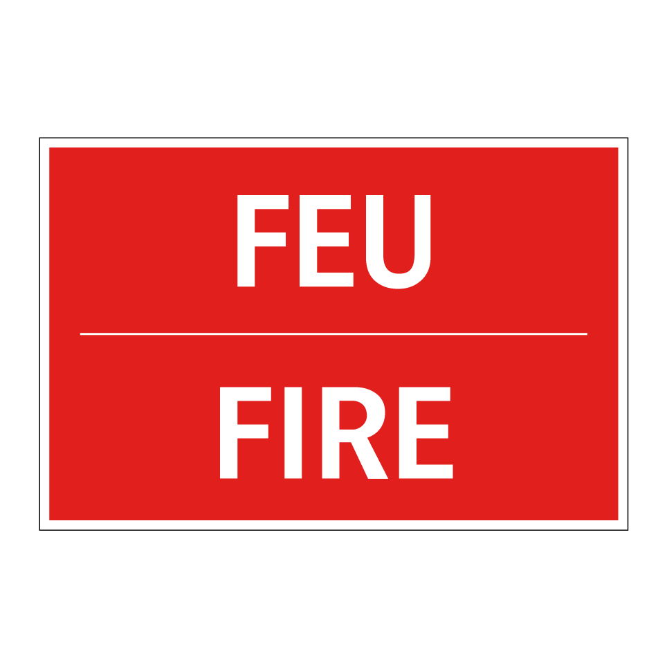 Panneau de signalisation incendie bilingue avec texte en français : "FEU", et en anglais : "FIRE"