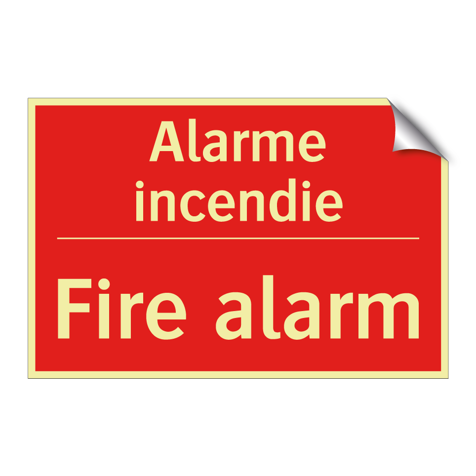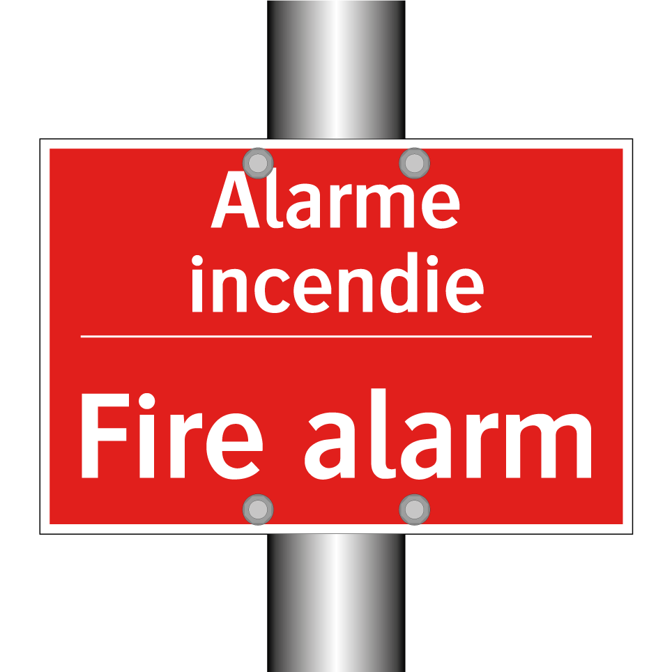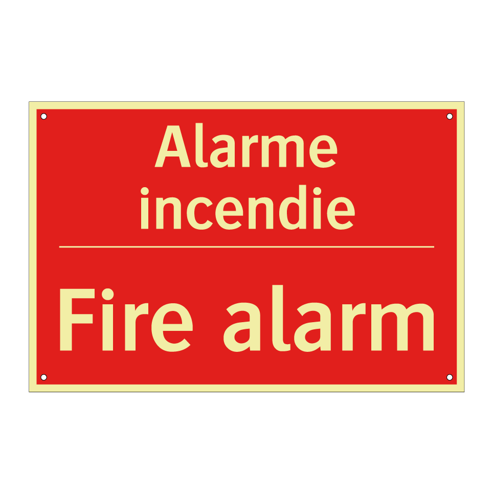 Panneau de signalisation incendie bilingue avec texte en français : "Alarme incendie", et en anglais : "Fire alarm"